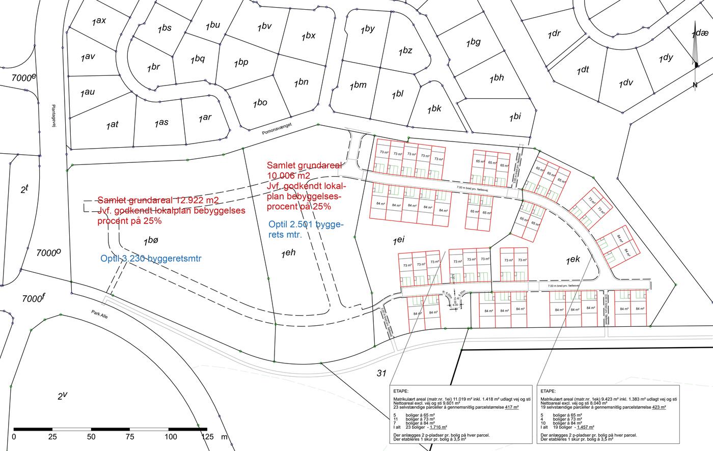 Det primære areal udgør cirka 1 hektar (10.008 m²) og tillader opførelse af tæt-lav boligbebyggelse med et samlet bygningsareal på 2.501 m². Derudover er der mulighed for at medkøbe et tilstødende areal på 12.921 m², som også er lokalplanlagt til tæt-lav boligbebyggelse med et bygningsareal på 3.230 m².