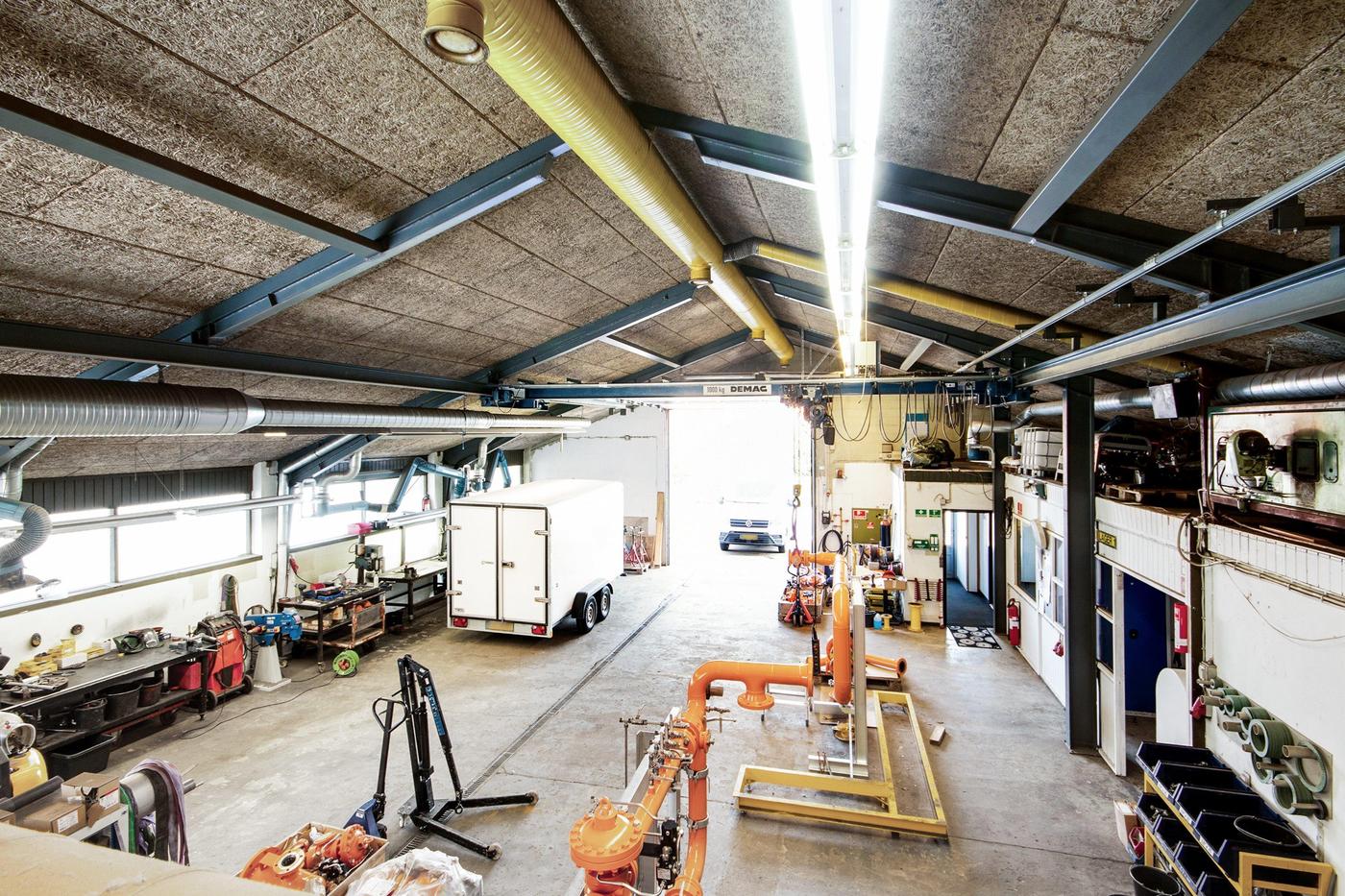 Værkstedet på ca. 250 m² er indrettet med port mod både nord og syd og i værkstedshallen forefindes endvidere traverskran, udluftning og andre tekniske anlæg.