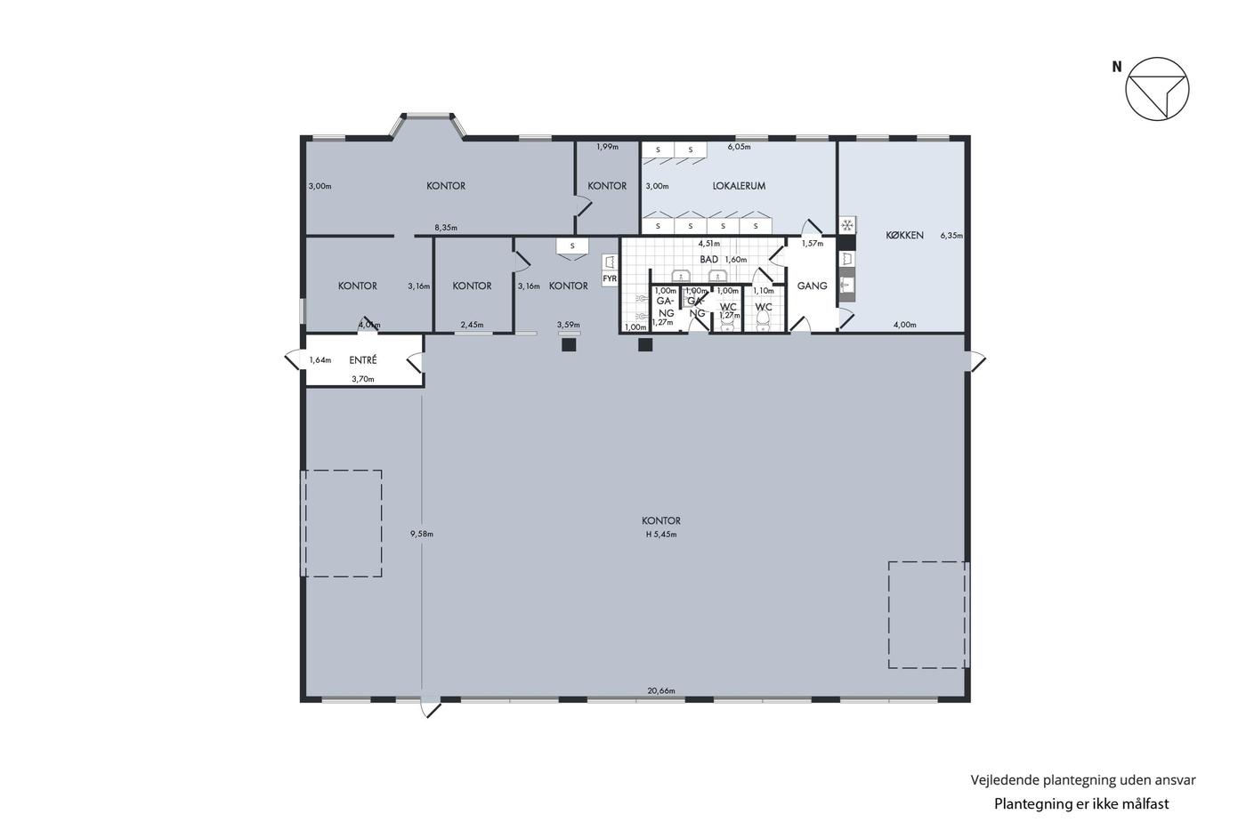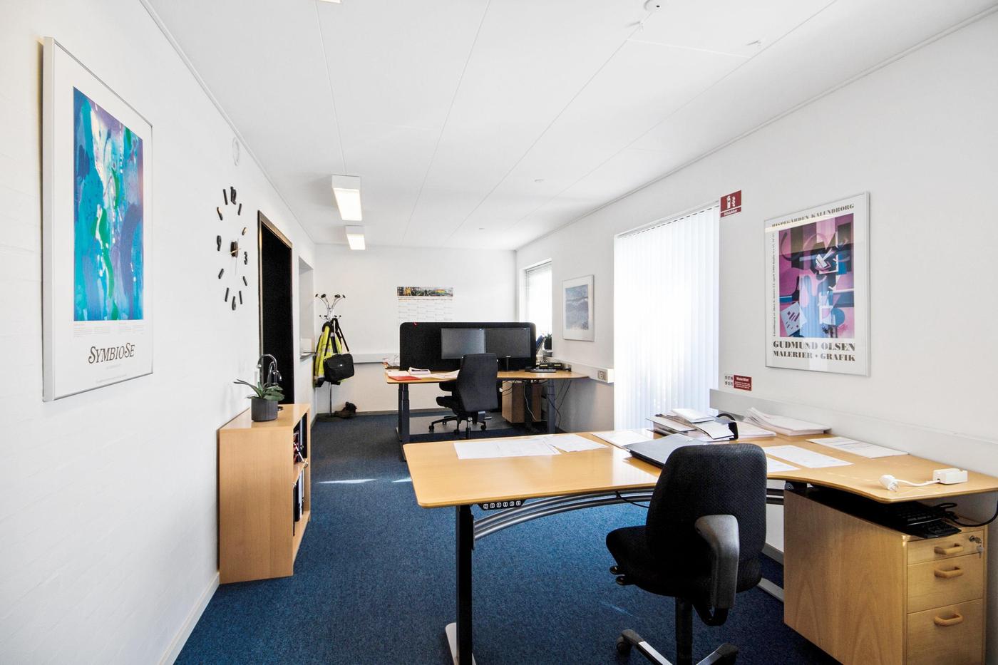 Kontordelen på ca. 75 m² har 5 rum i forskellige størrelser.