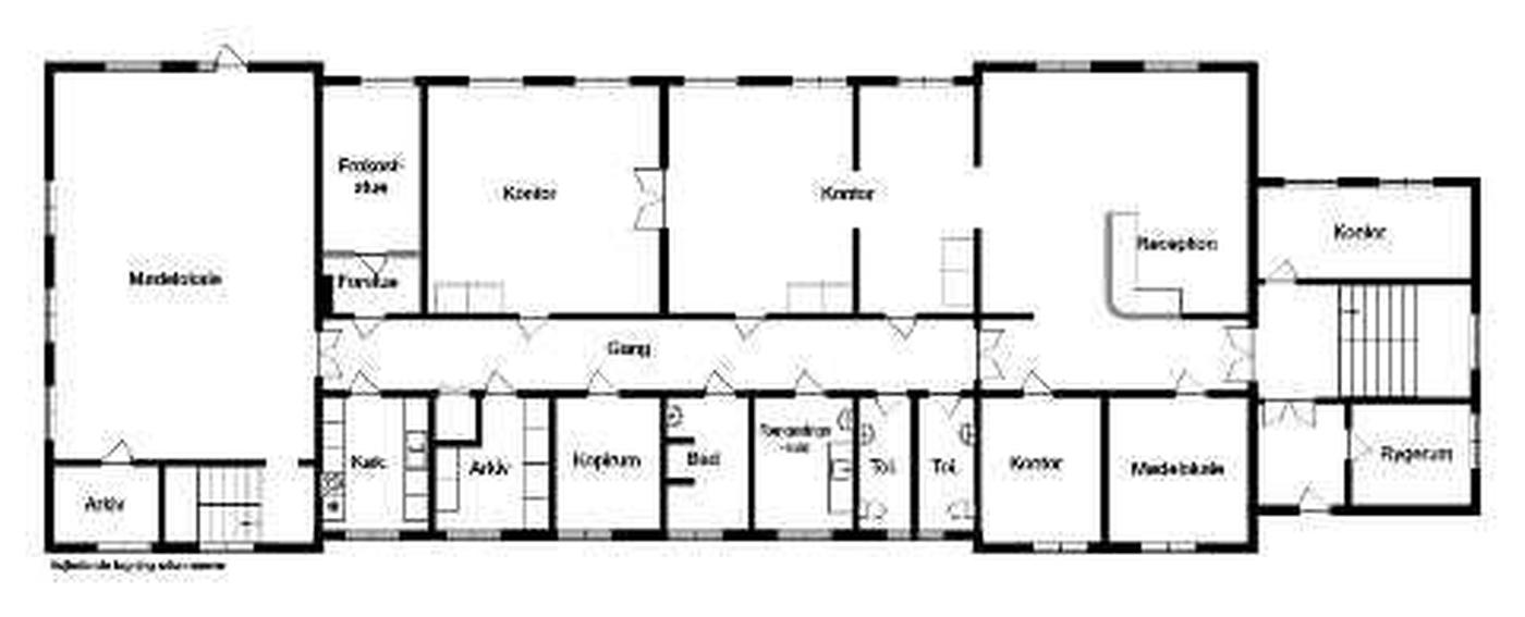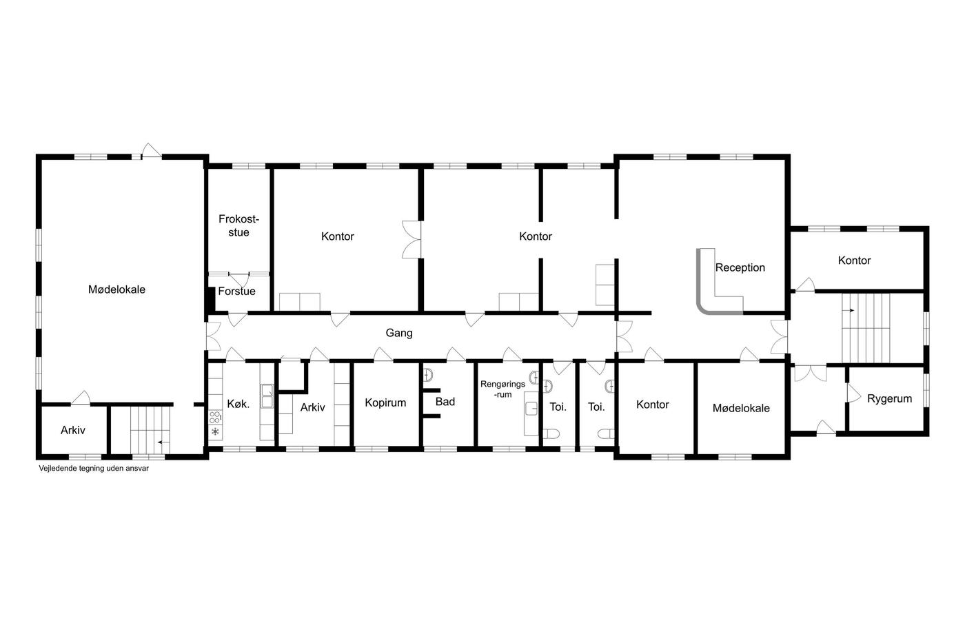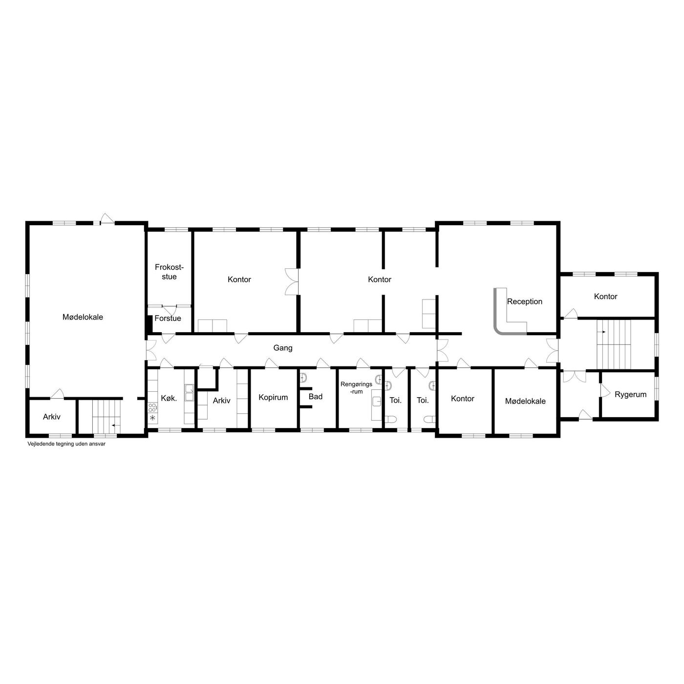 Beliggende i stueetagen og er på ialt 416m2 (BBR) og opdelt i en en række større og mindre kontorer, mødelokaler m.v., samt naturligvis køkken, og personalefaciliteter.