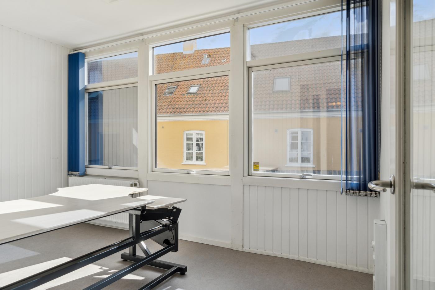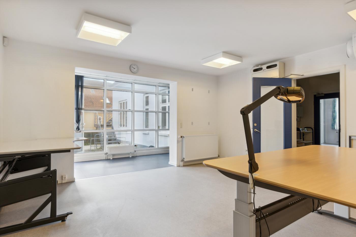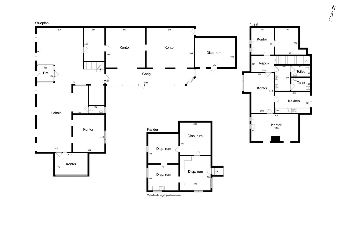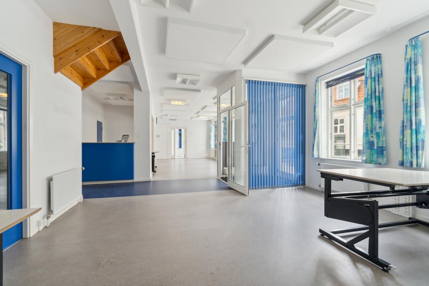 Indrettet med åbent kontormiljø i f.m. indgangspartiet, mindre kontor, toilet, depotrum, teknikrum, samt yderligere kontorer i sidebygningen. 1. Salen med mødelokale, frokoststue, køkken, og yderligere toiletfaciliteter. Herudover kælder, med diverse disponible rum.