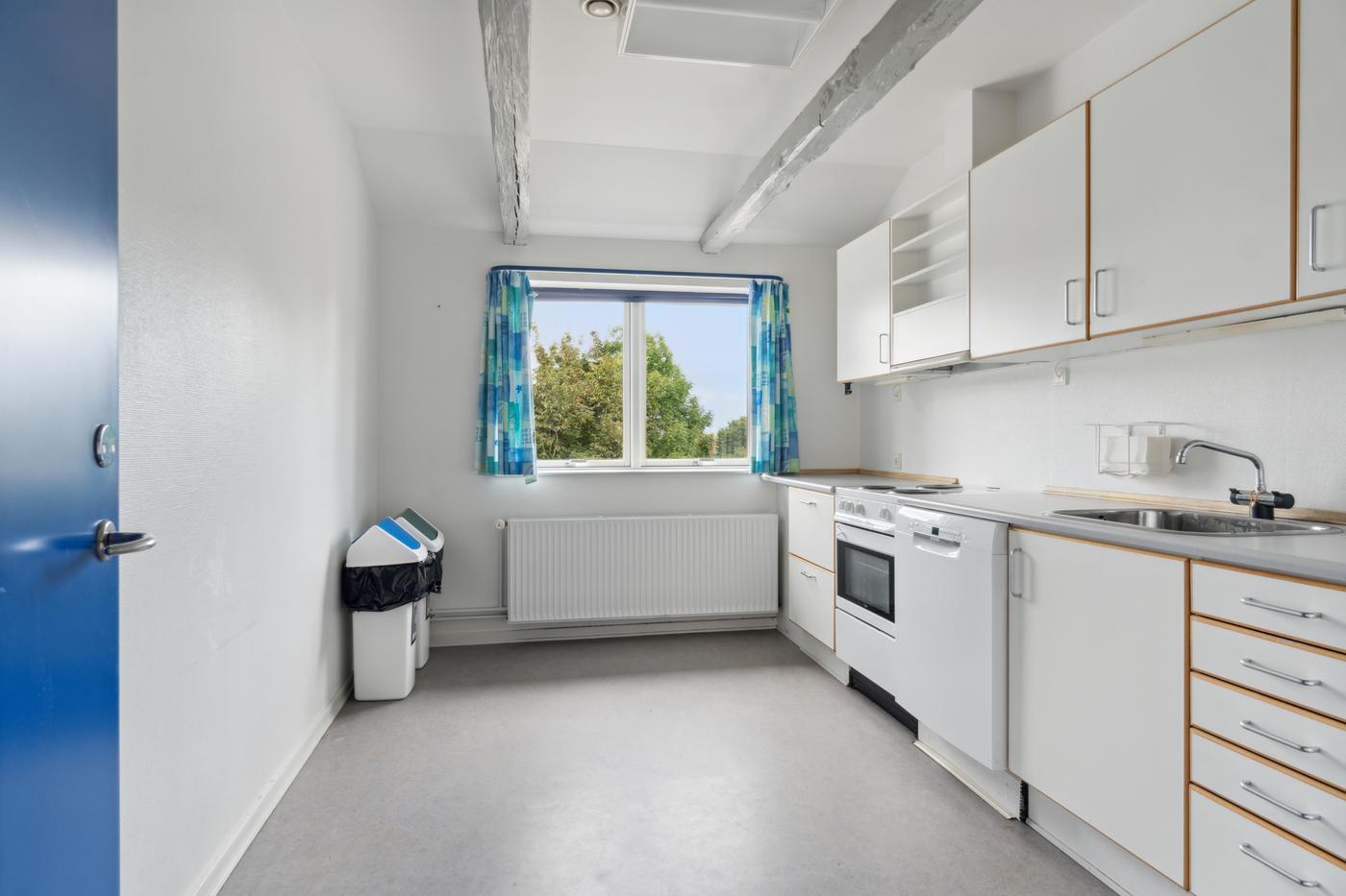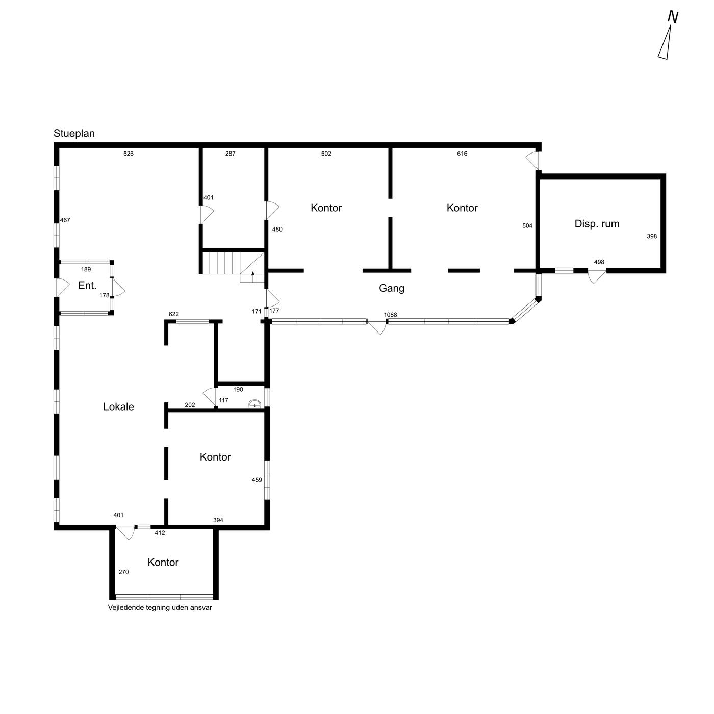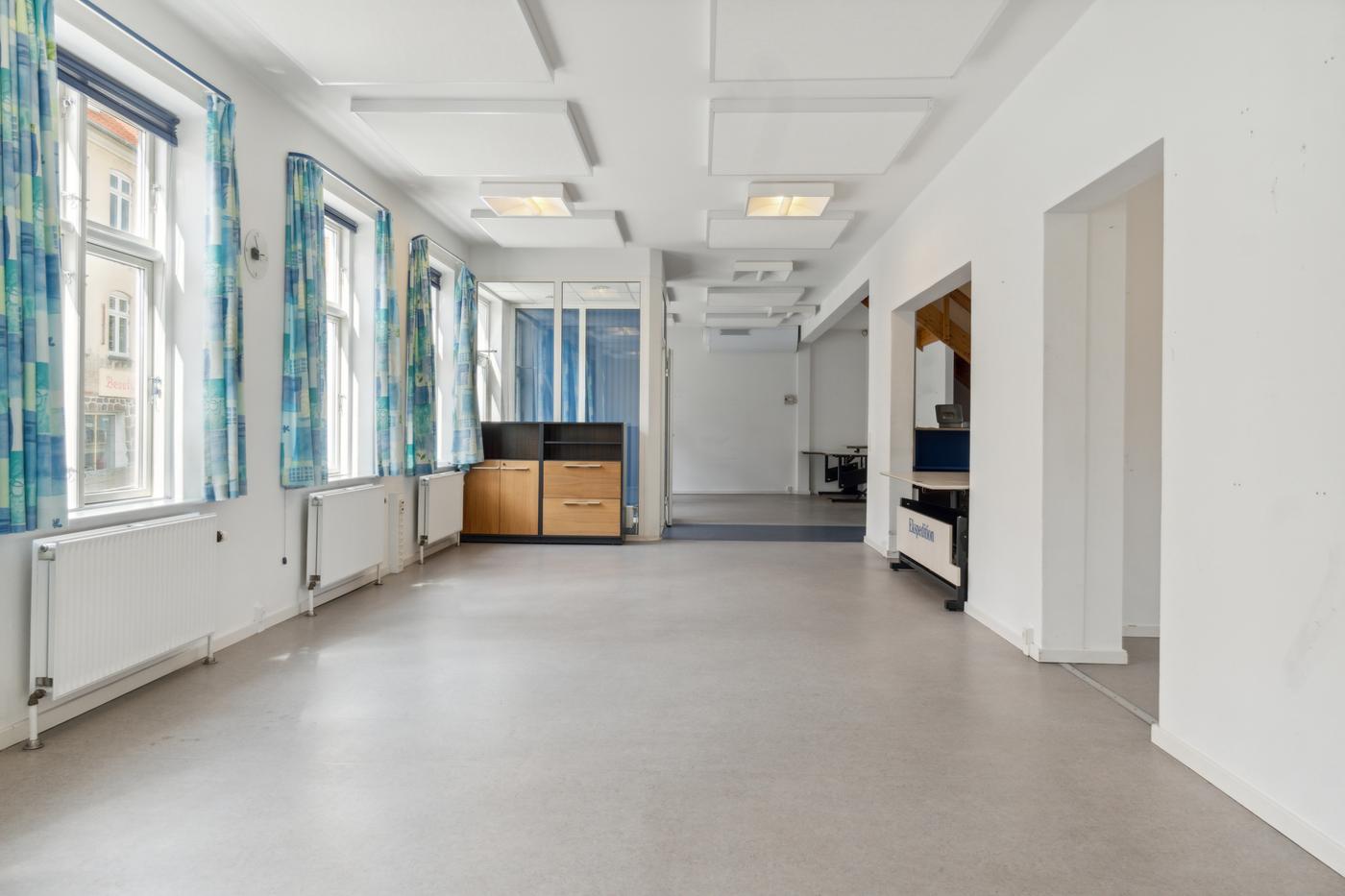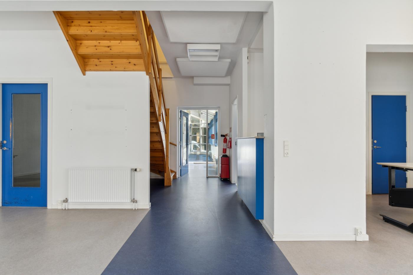 Indrettet med åbent kontormiljø i f.m. indgangspartiet, mindre kontor, toilet, depotrum, teknikrum, samt yderligere kontorer i sidebygningen. 1. Salen med mødelokale, frokoststue, køkken, og yderligere toiletfaciliteter. Herudover kælder, med diverse disponible rum.
