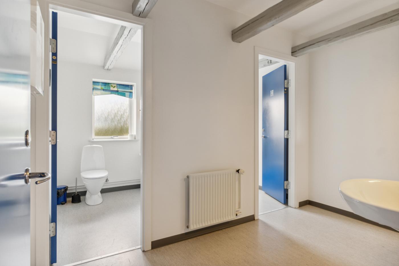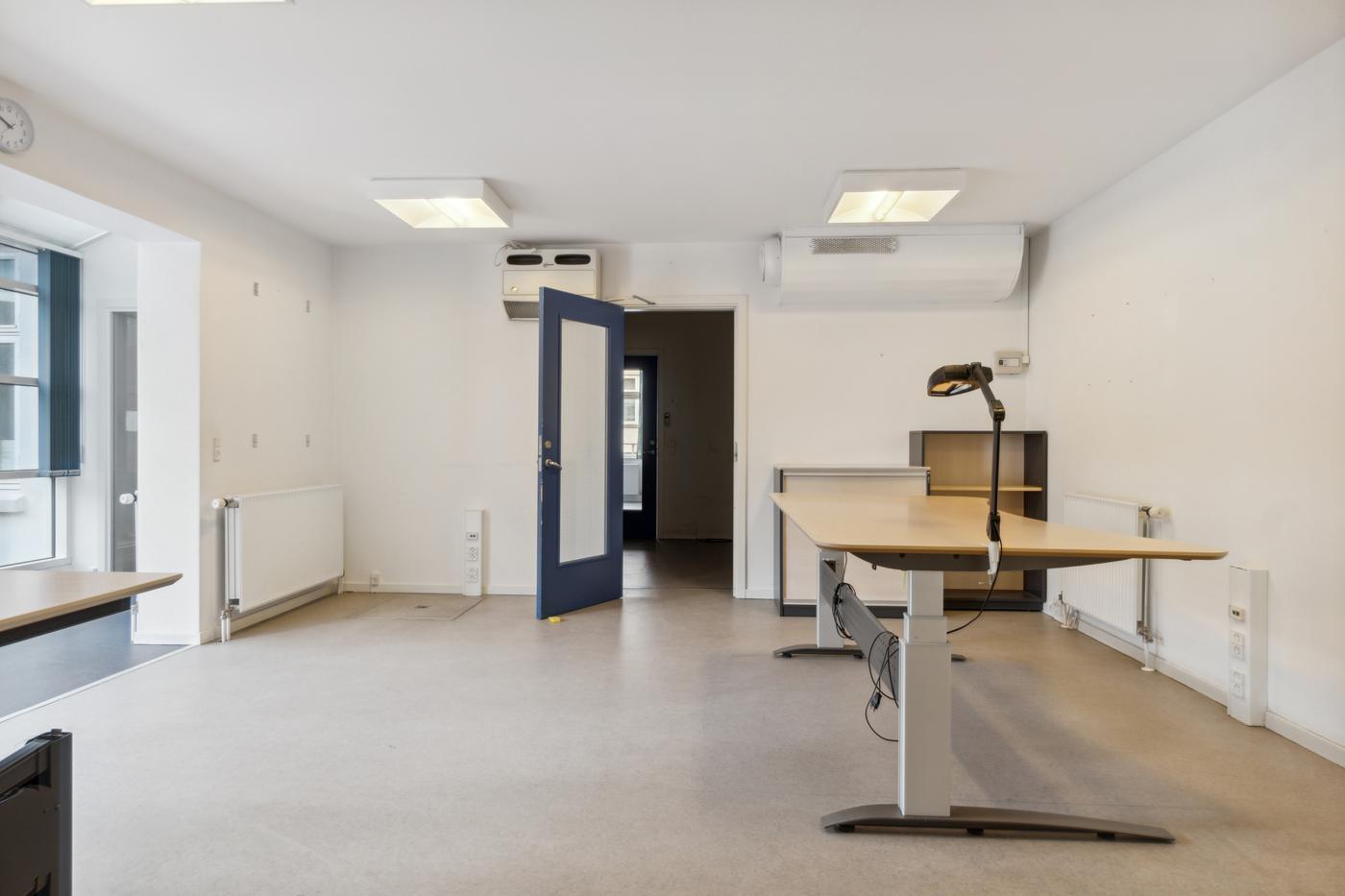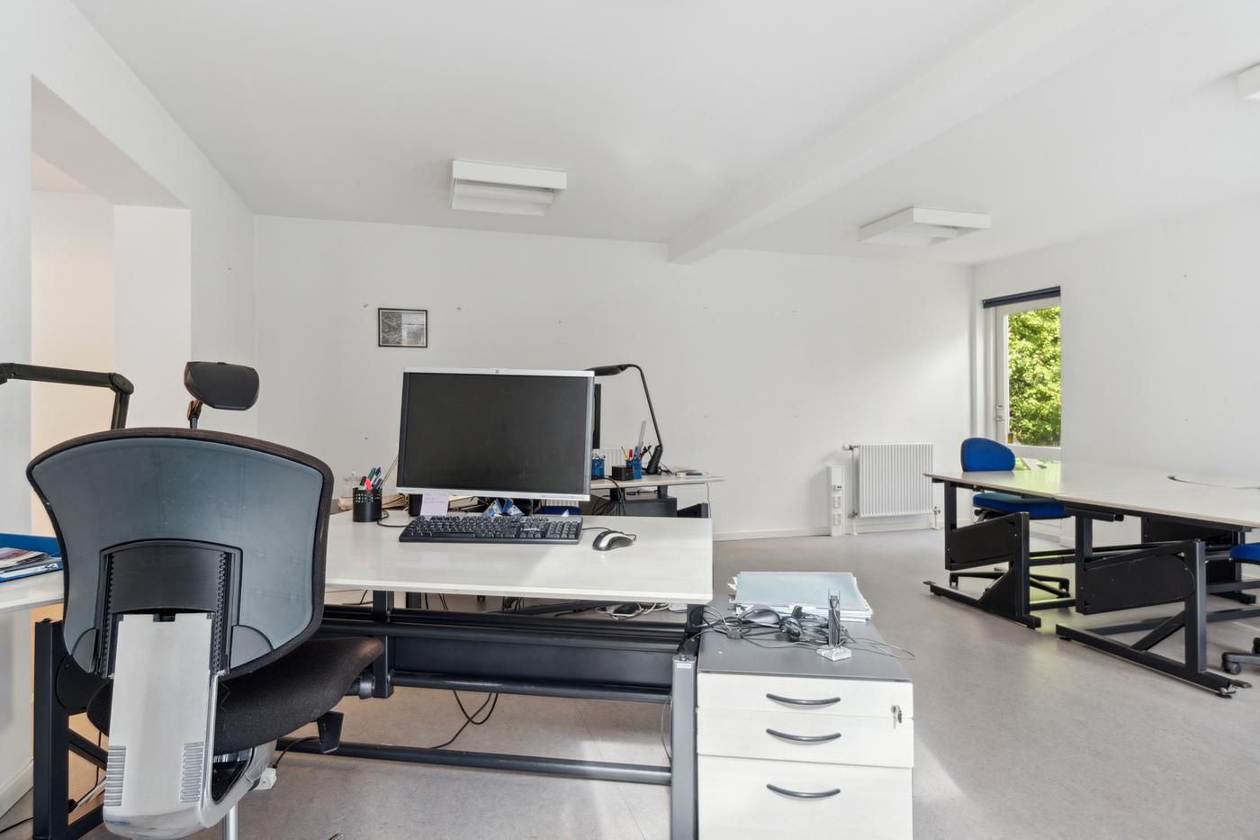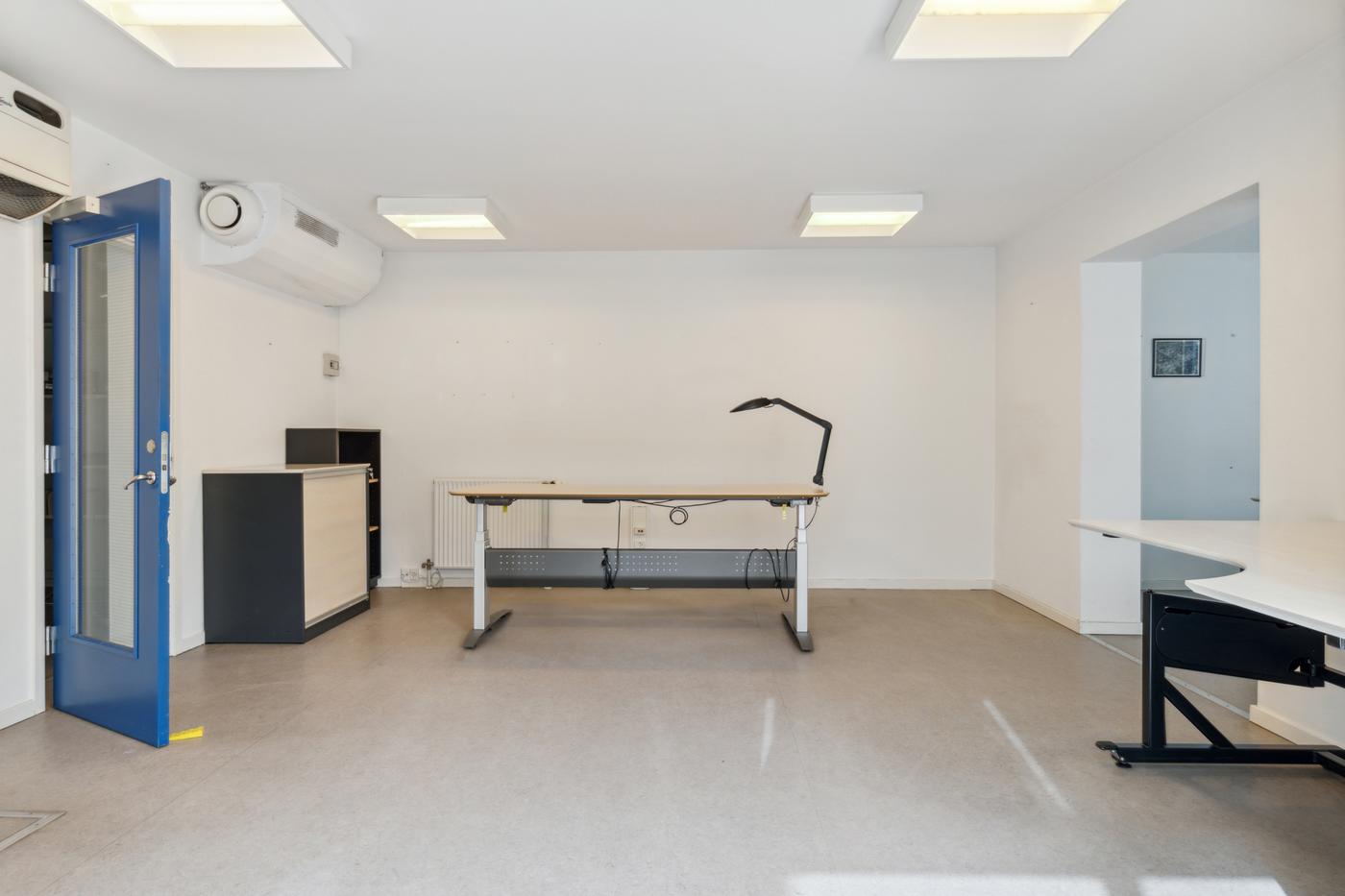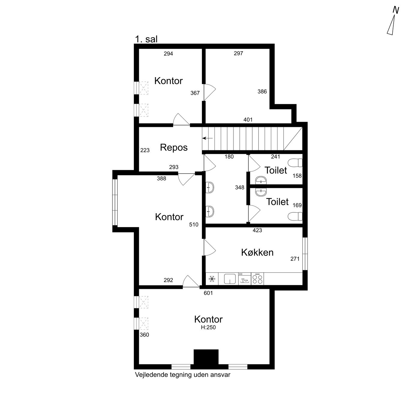 Indrettet med åbent kontormiljø i f.m. indgangspartiet, mindre kontor, toilet, depotrum, teknikrum, samt yderligere kontorer i sidebygningen. 1. Salen med mødelokale, frokoststue, køkken, og yderligere toiletfaciliteter. Herudover kælder, med diverse disponible rum.