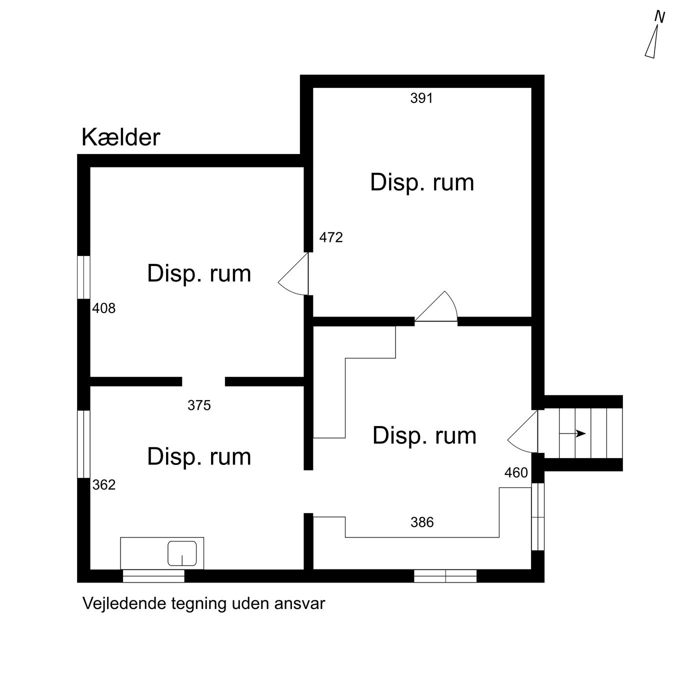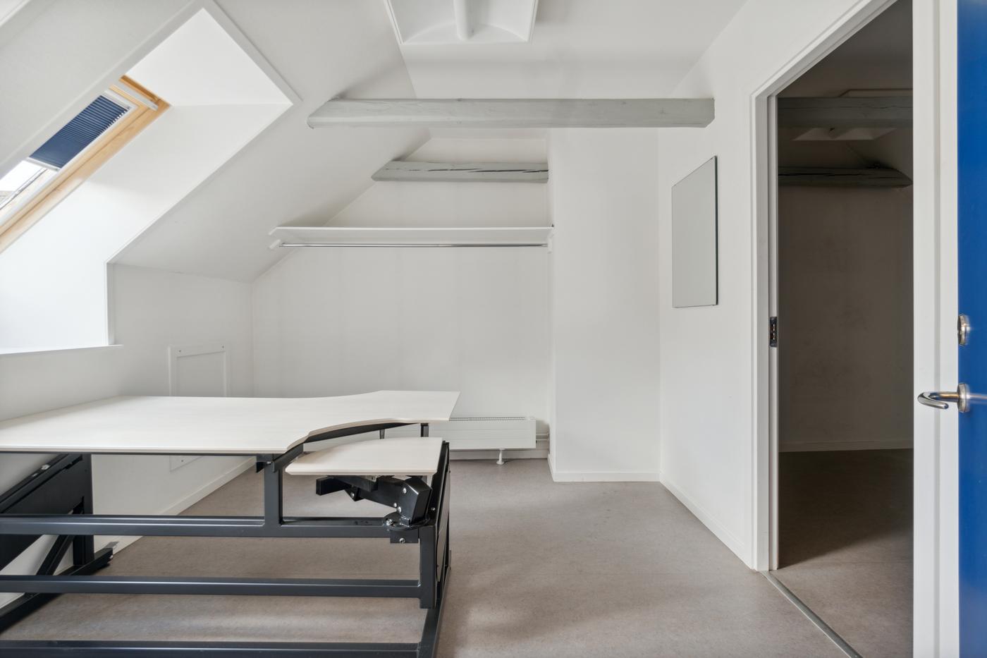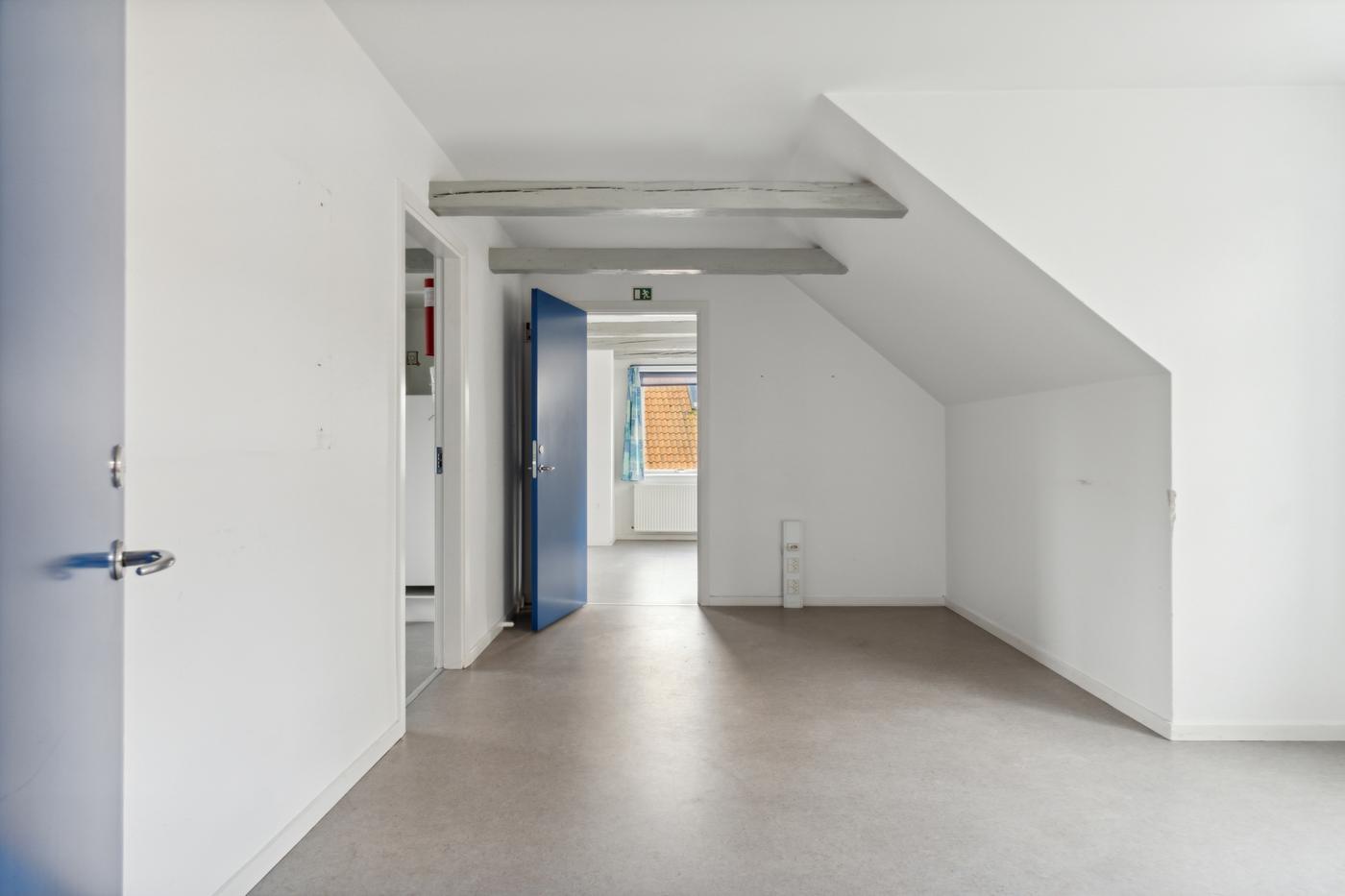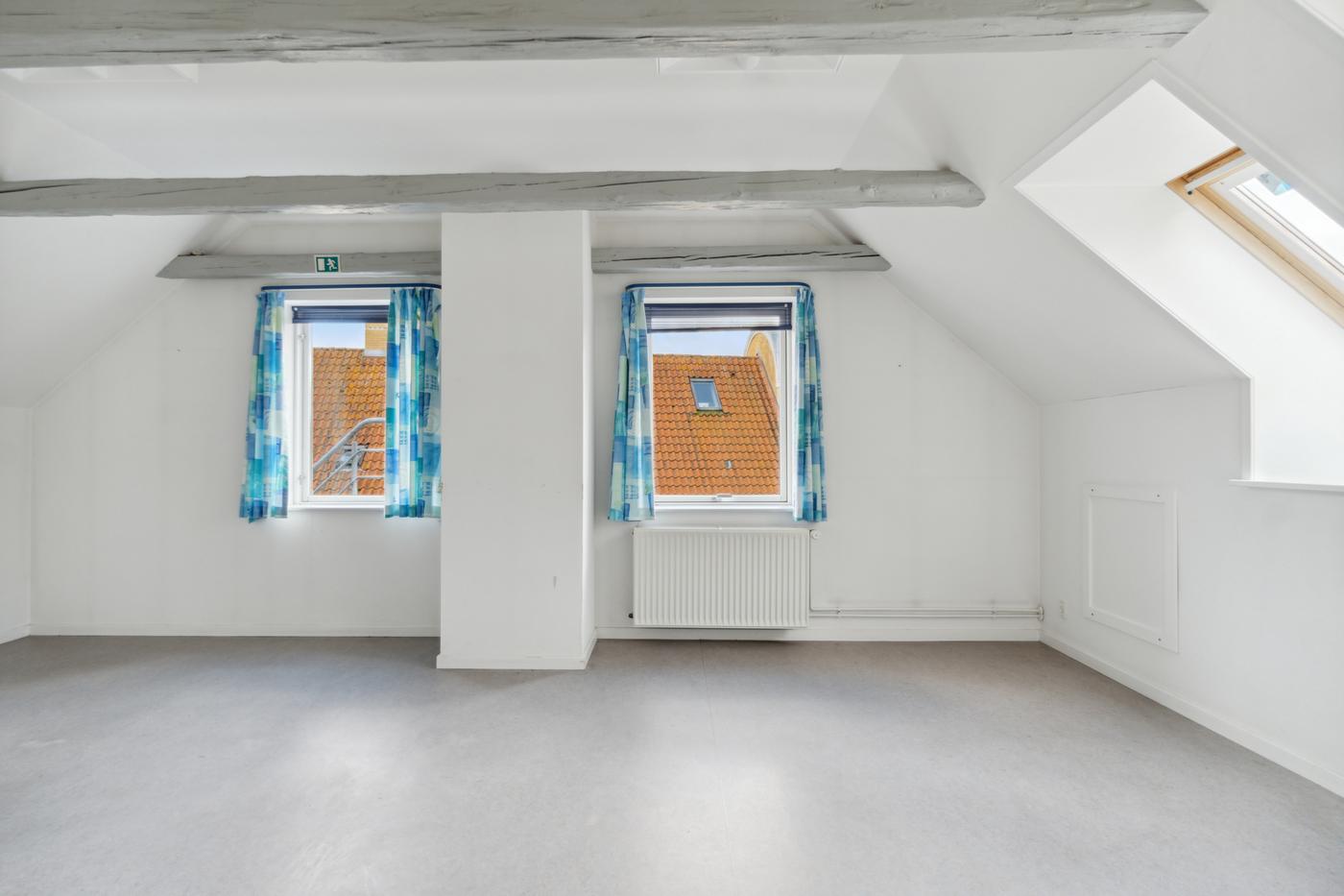 Indrettet med åbent kontormiljø i f.m. indgangspartiet, mindre kontor, toilet, depotrum, teknikrum, samt yderligere kontorer i sidebygningen. 1. Salen med mødelokale, frokoststue, køkken, og yderligere toiletfaciliteter. Herudover kælder, med diverse disponible rum.