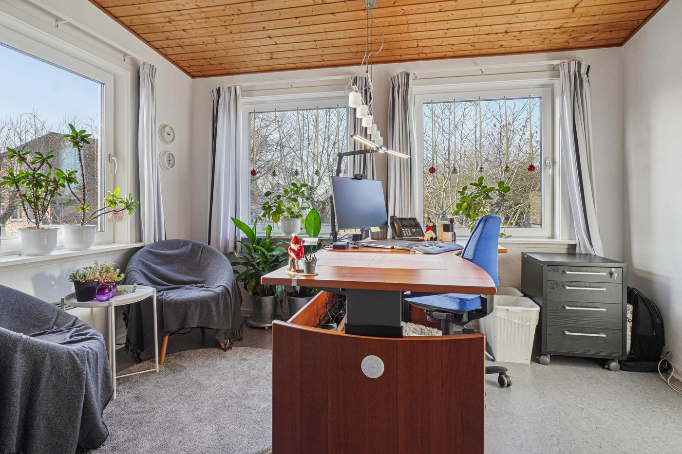 Kontor/klinik i stueplan er på 156m², er yderst velegnet til diverse klinikformål, ligesom det er velegnet til kontor, undervisning o.l. -Indrettet med indgangsparti med kunde-/gæstetoilet, 3-4 kontorer/klinik-/møderum, personaletoilet, samt køkken/frokoststue.