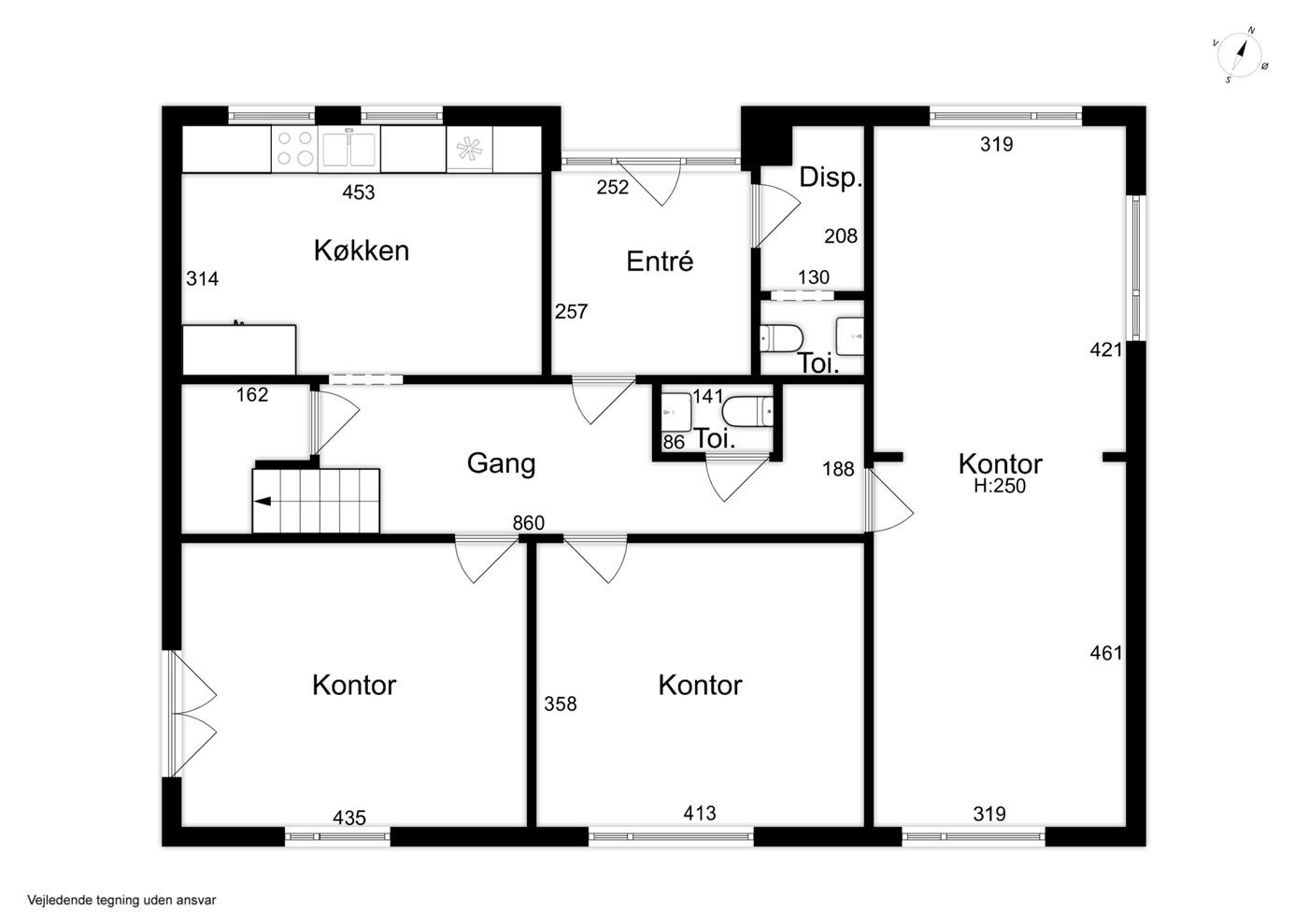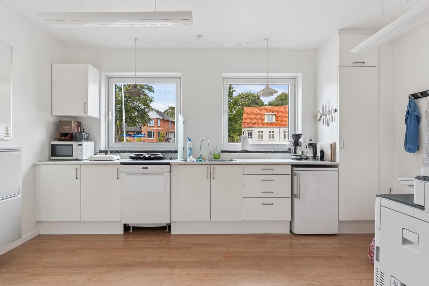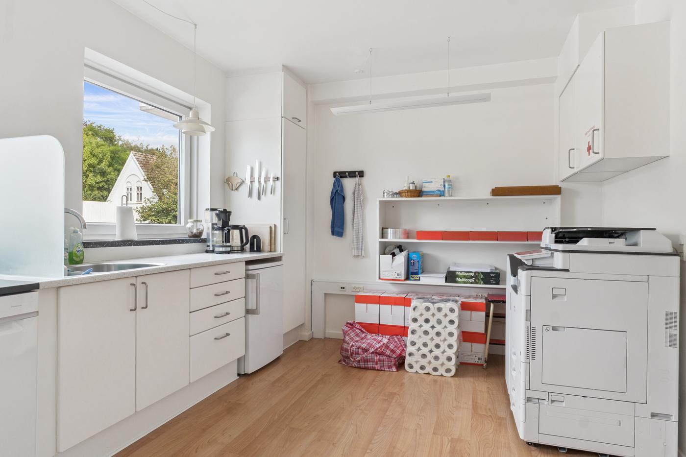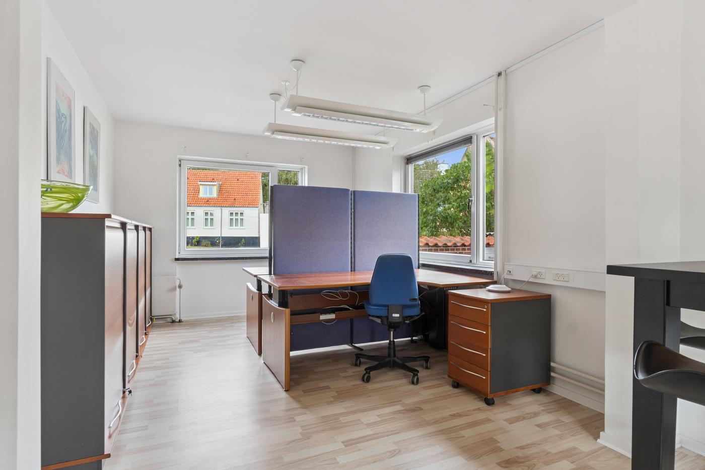 Indrettet med indgangsparti med kunde-/gæstetoilet, 3-4 kontorer/klinik-/møderum, personaletoilet, samt køkken/frokoststue.