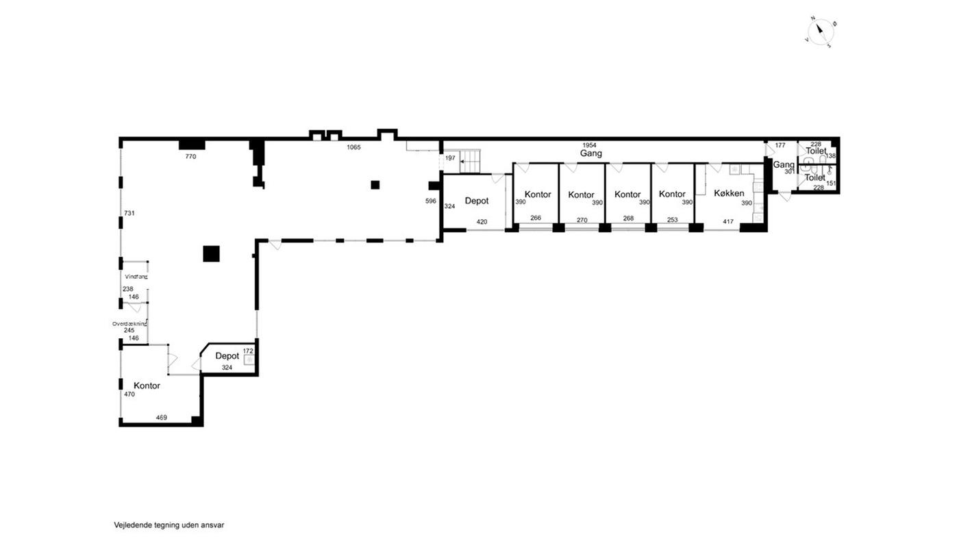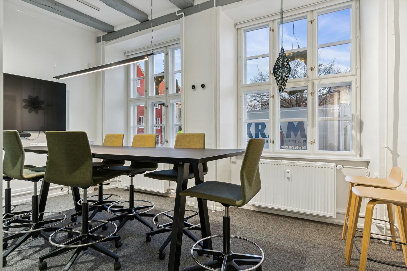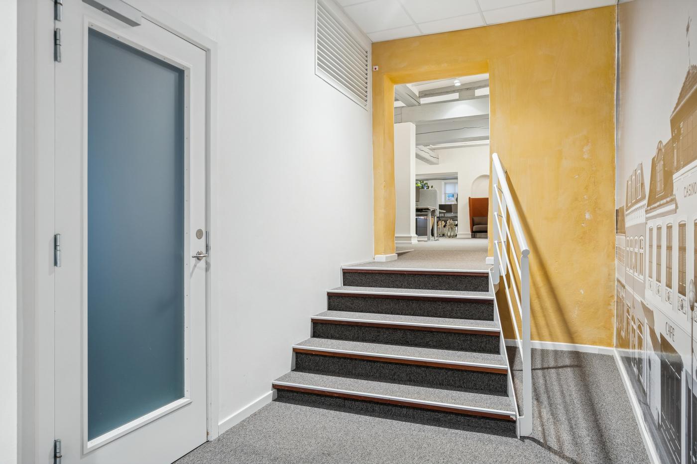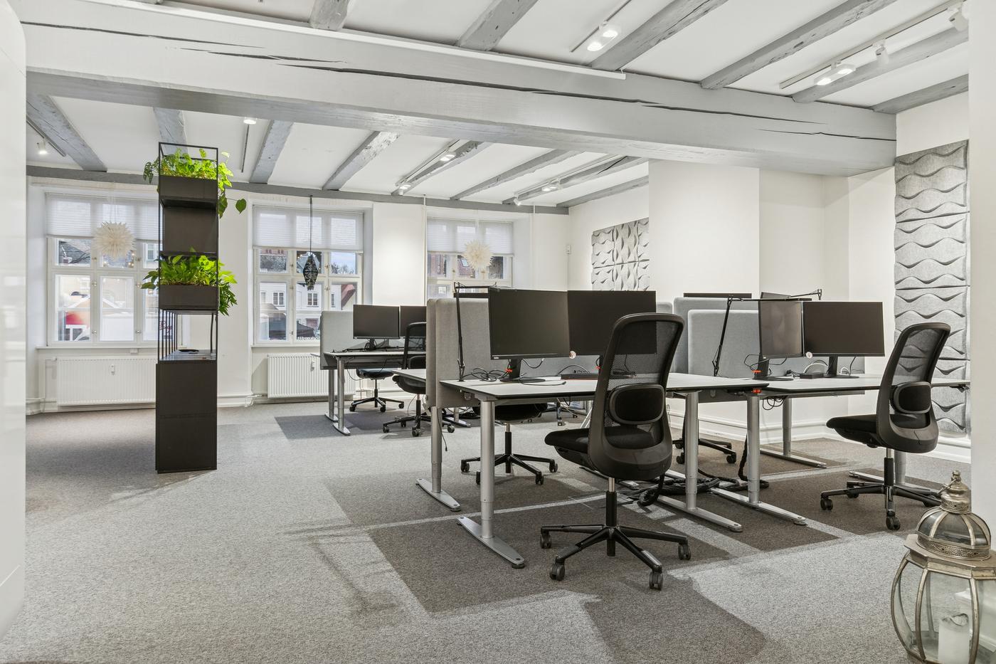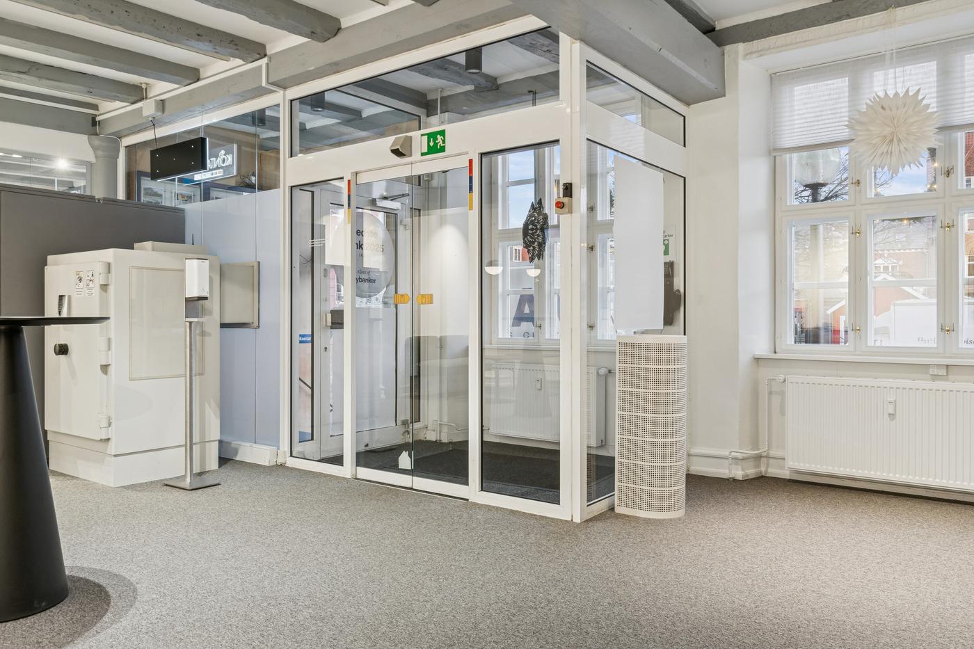 Indretningen er både fleksibel og effektiv. I den forreste del af lejemålet - direkte mod Torvet - mødes man af to store og lyse åbne kontormiljøer eller butikslokaler, der giver en imødekommende atmosfære og mange indretningsmuligheder. Herudover rummer lejemålet fem kontorer og møderum i varierende størrelser, hvilket giver optimale rammer for både fortrolige samtaler, online-møder og større møder/arbejdszoner. Der er to toiletter og et rummeligt køkken.