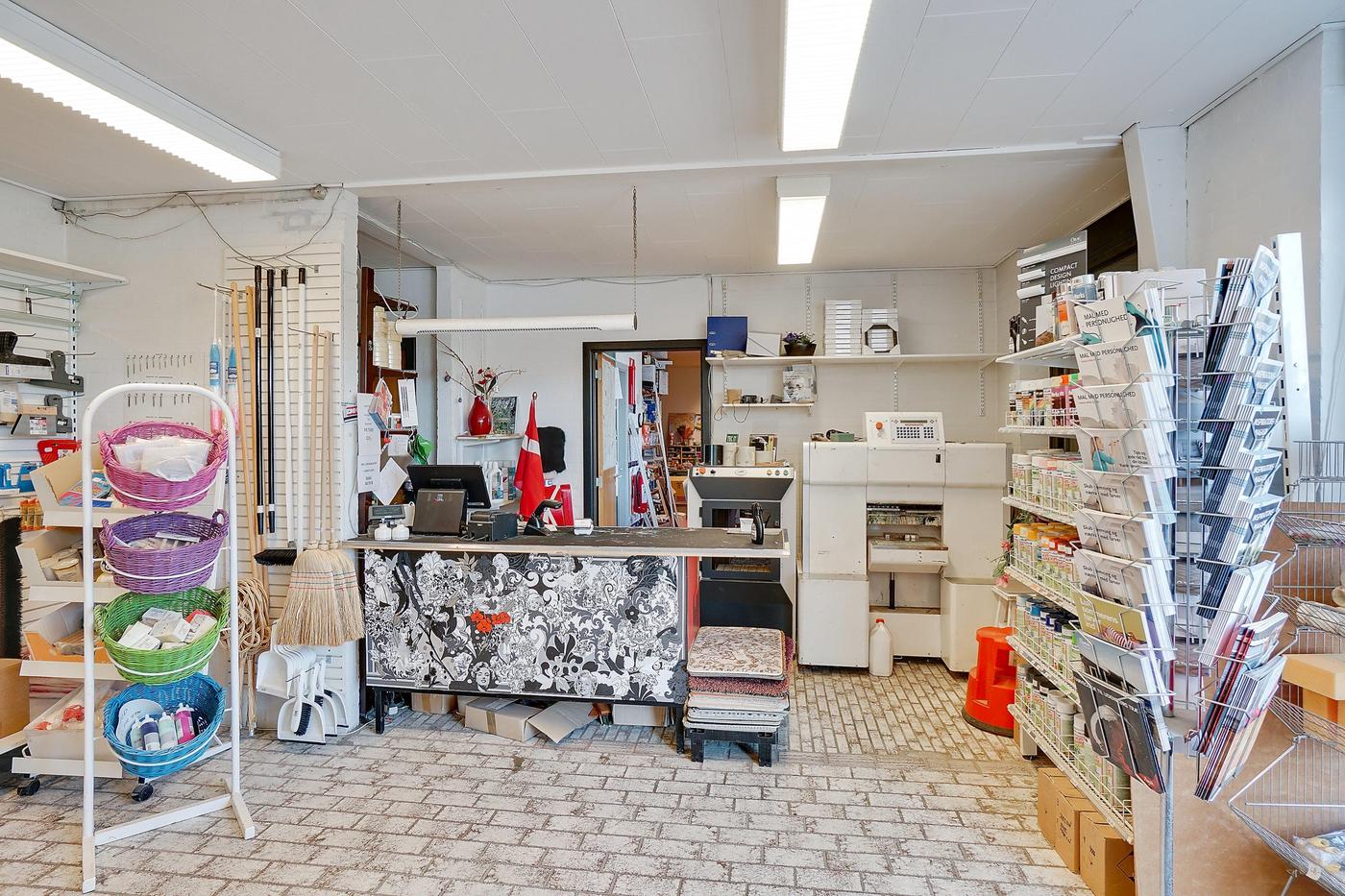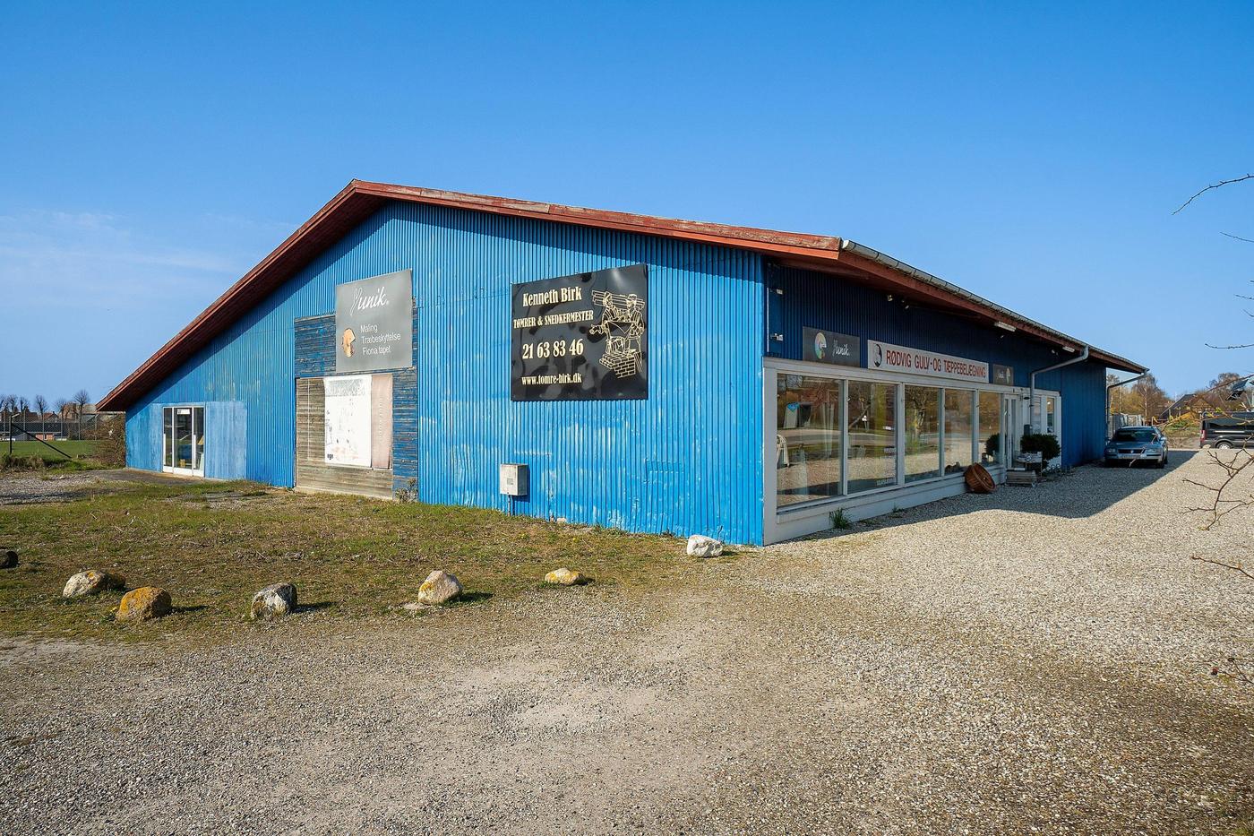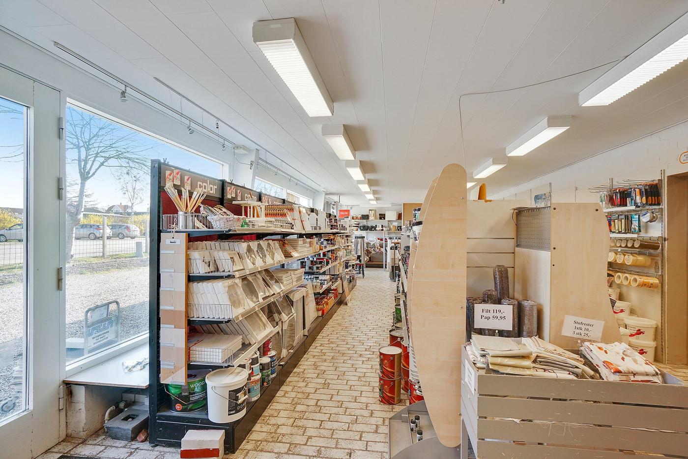 Ejendommen er indrettet mindre butik/udstilling, kontor med frokoststue og toilet. Fra butikken er der udgang til isoleret og opvarmet lager, der er delt op i flere mindre rum, som let kan gøres større efter eget ønske. Der er 6 meter til loft, gulvet er beton samt port i begge gavle.