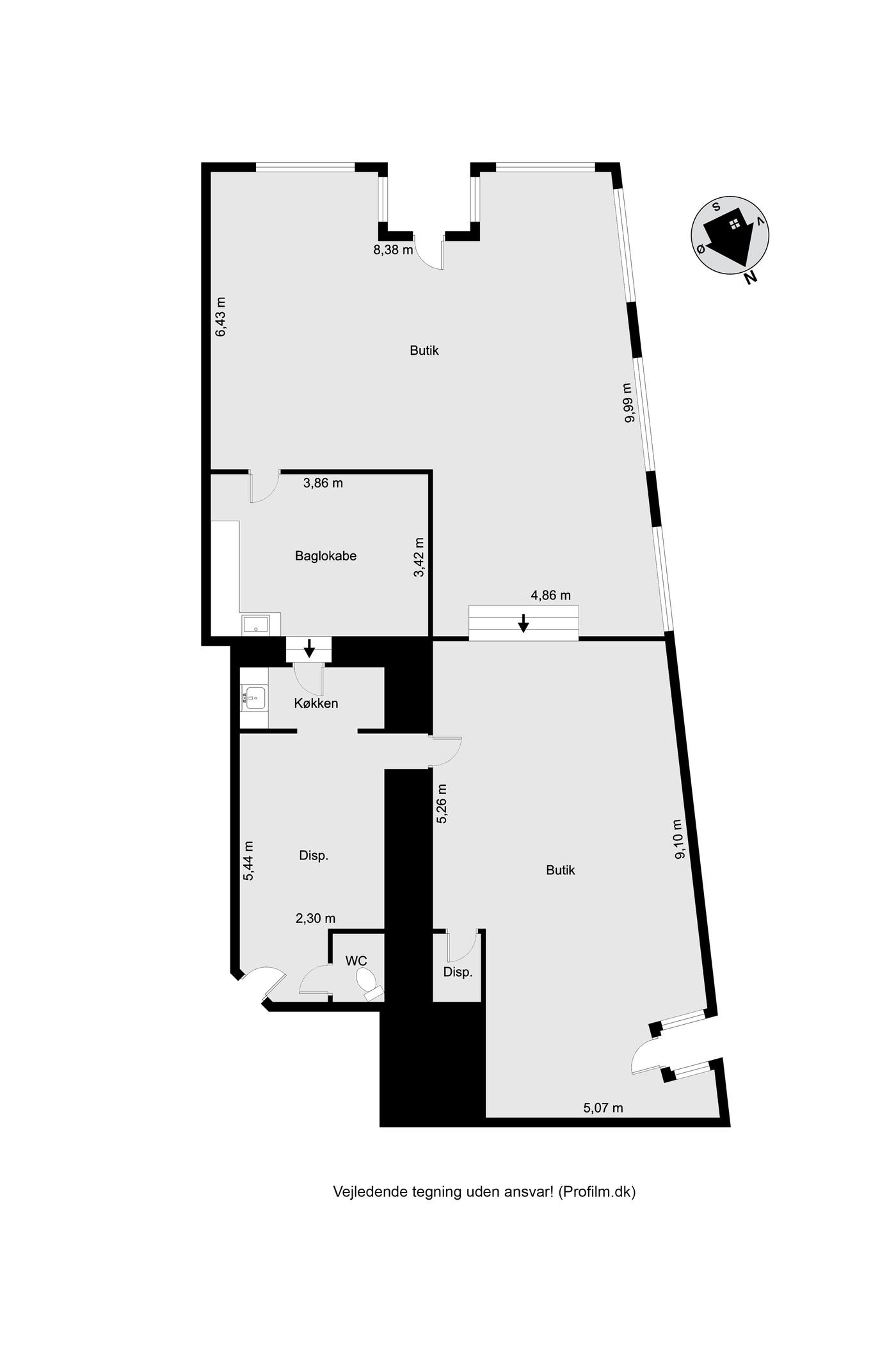 Butikken har tidligere været opdelt i to butikker hvilket gør at der er mulighed for to indgange. Butikker indeholder to store salgslokaler, samt et mindre baglokale, tekøkken og toilet.