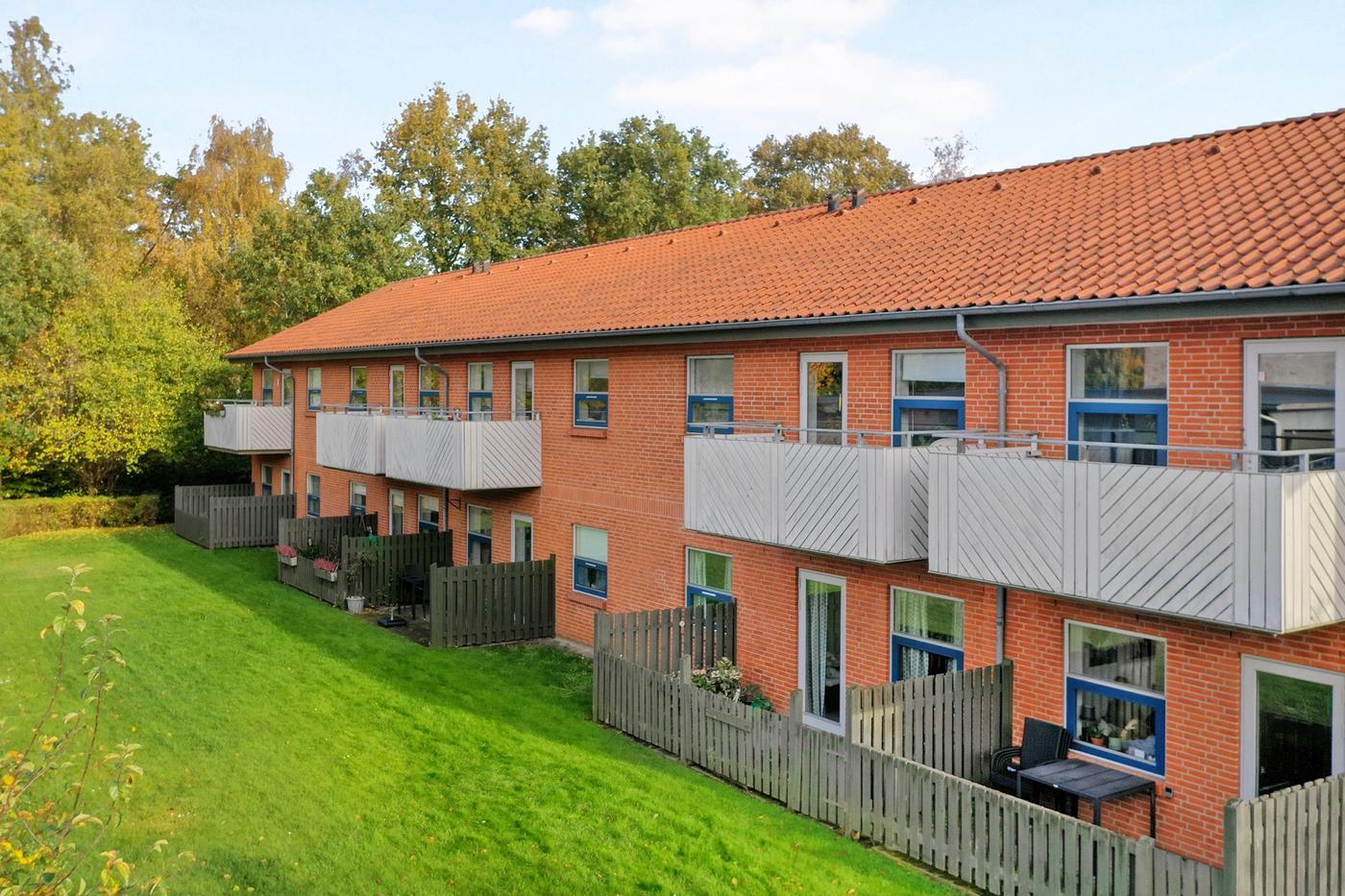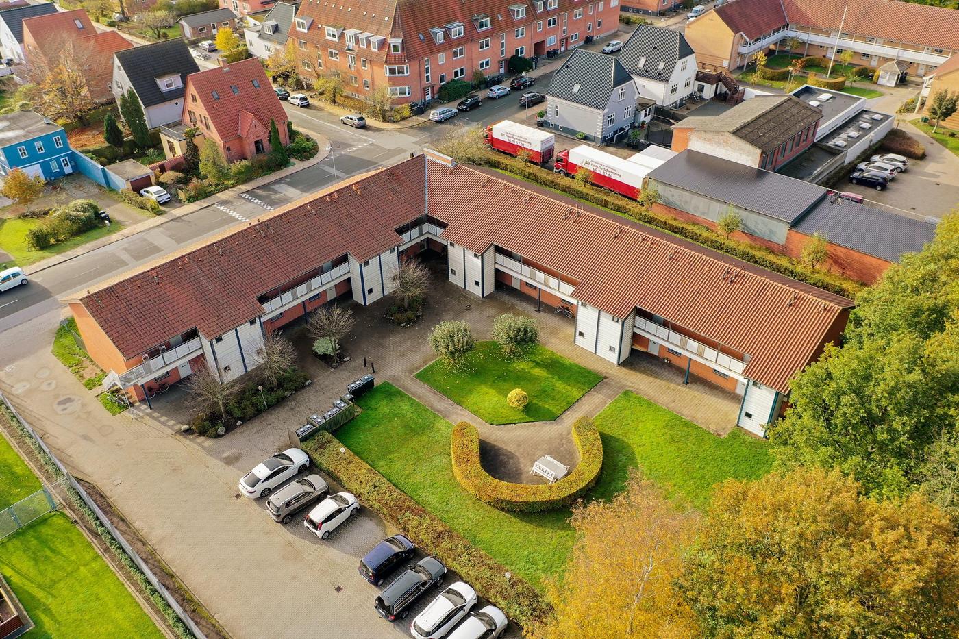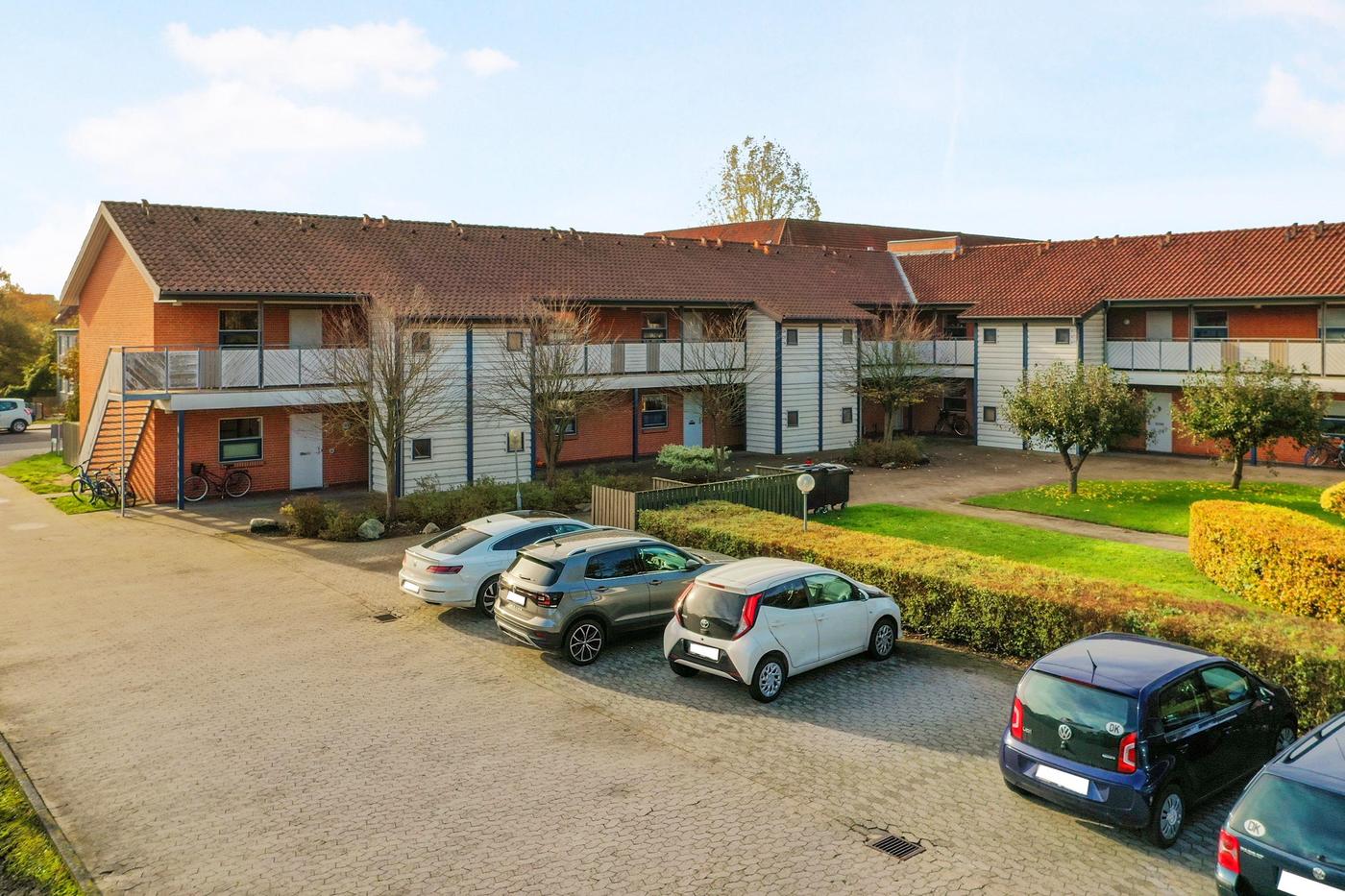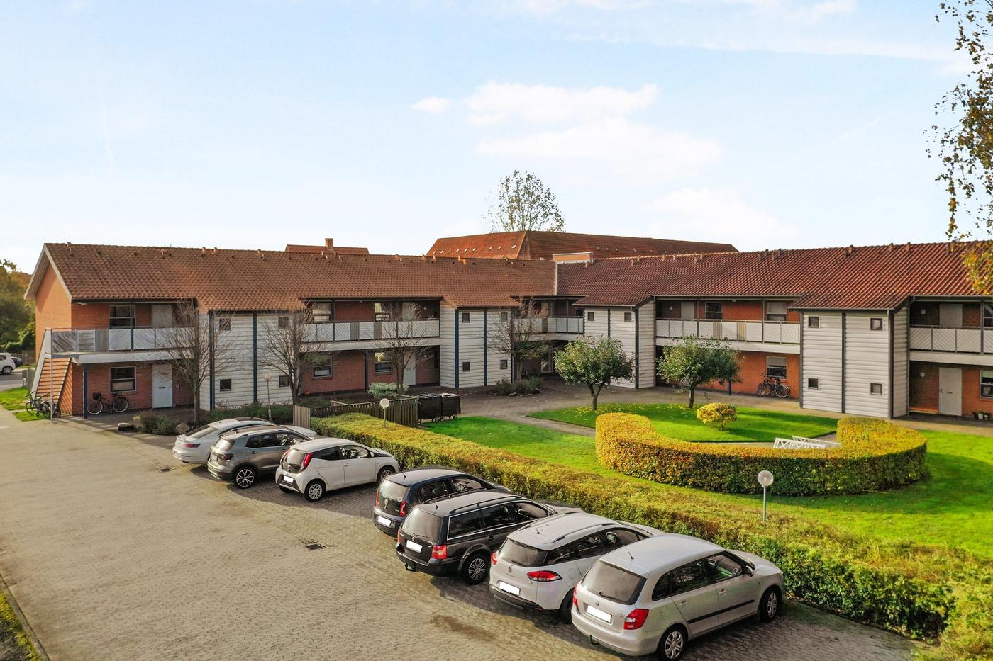Den samlede ejendom rummer i alt 18 boliger, der har pæne grønne arealer og tilhørende parkeringspladser.