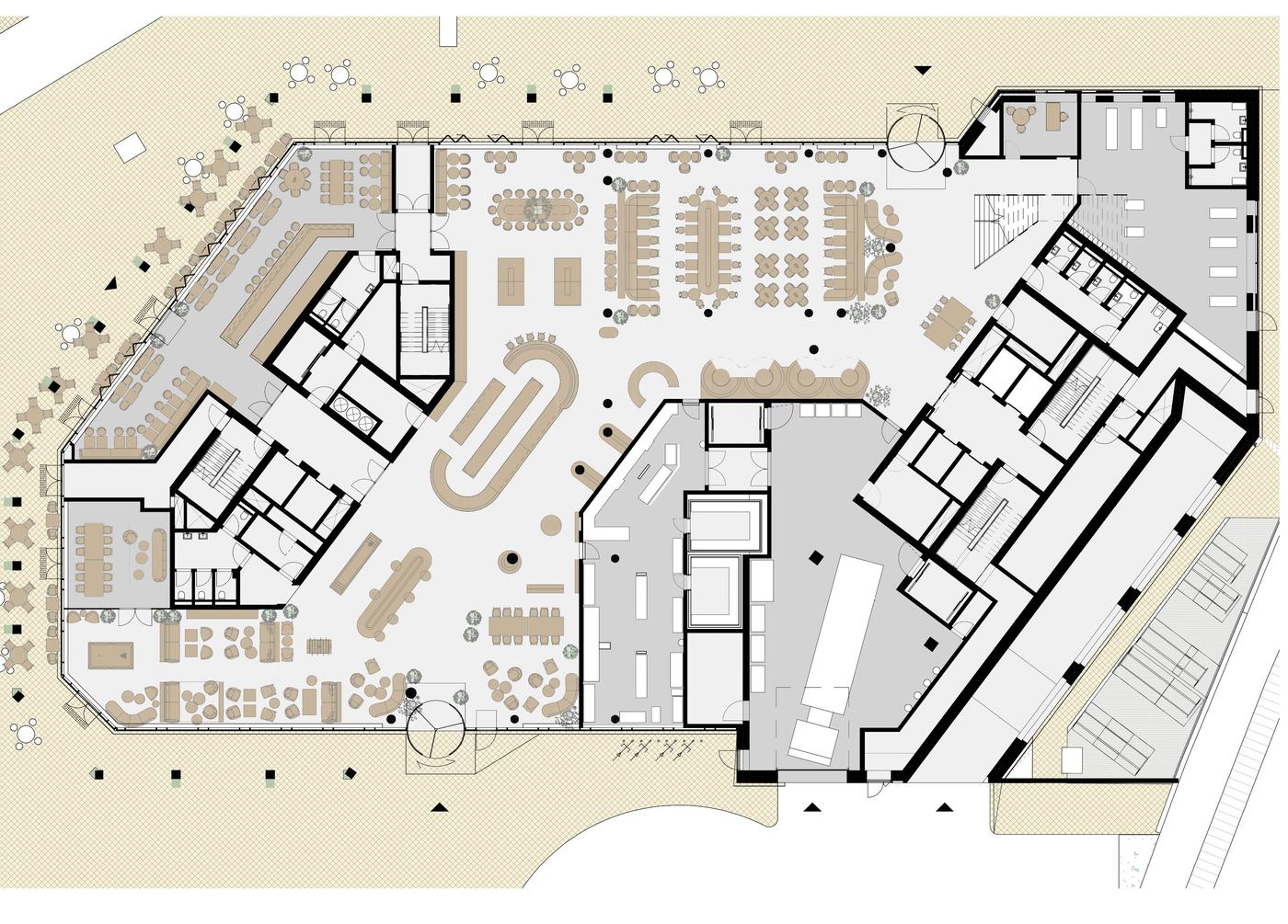 Tanken er, at selve indretningen på etagerne alene er forbeholdt mindre møderum til interne møder, mens kundemøder afholdes i selve mødecentret. Dette giver nogle rigtige gode "driftstal" for så vidt angår "antal m² pr. medarbejder".