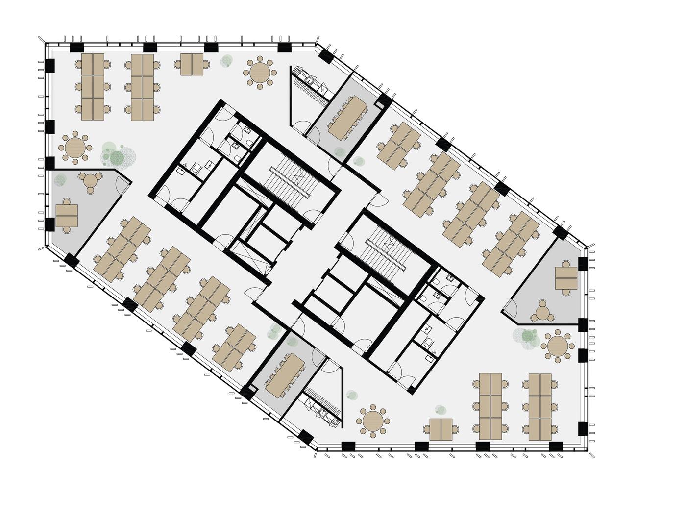 Kontordomicilet udføres i 11 etager, med ca. 903 m² på hver etage. De foreløbige skitser fremhæver unikke og topmoderne faciliteter.