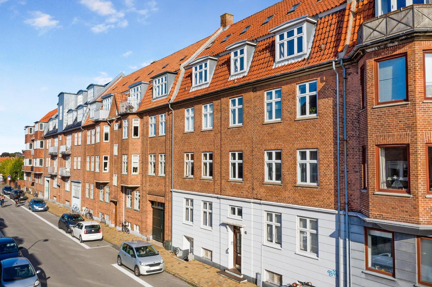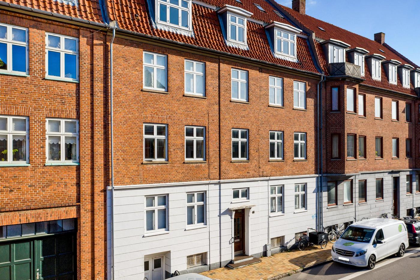 2 tv.: Moderniseret med flisebadeværelse samt hvidt køkken fra år 2004. Afhøvlede gulve. Ældre radiatorer.