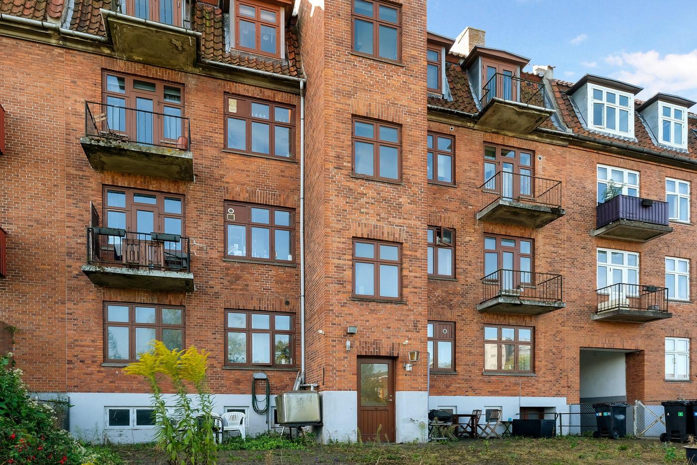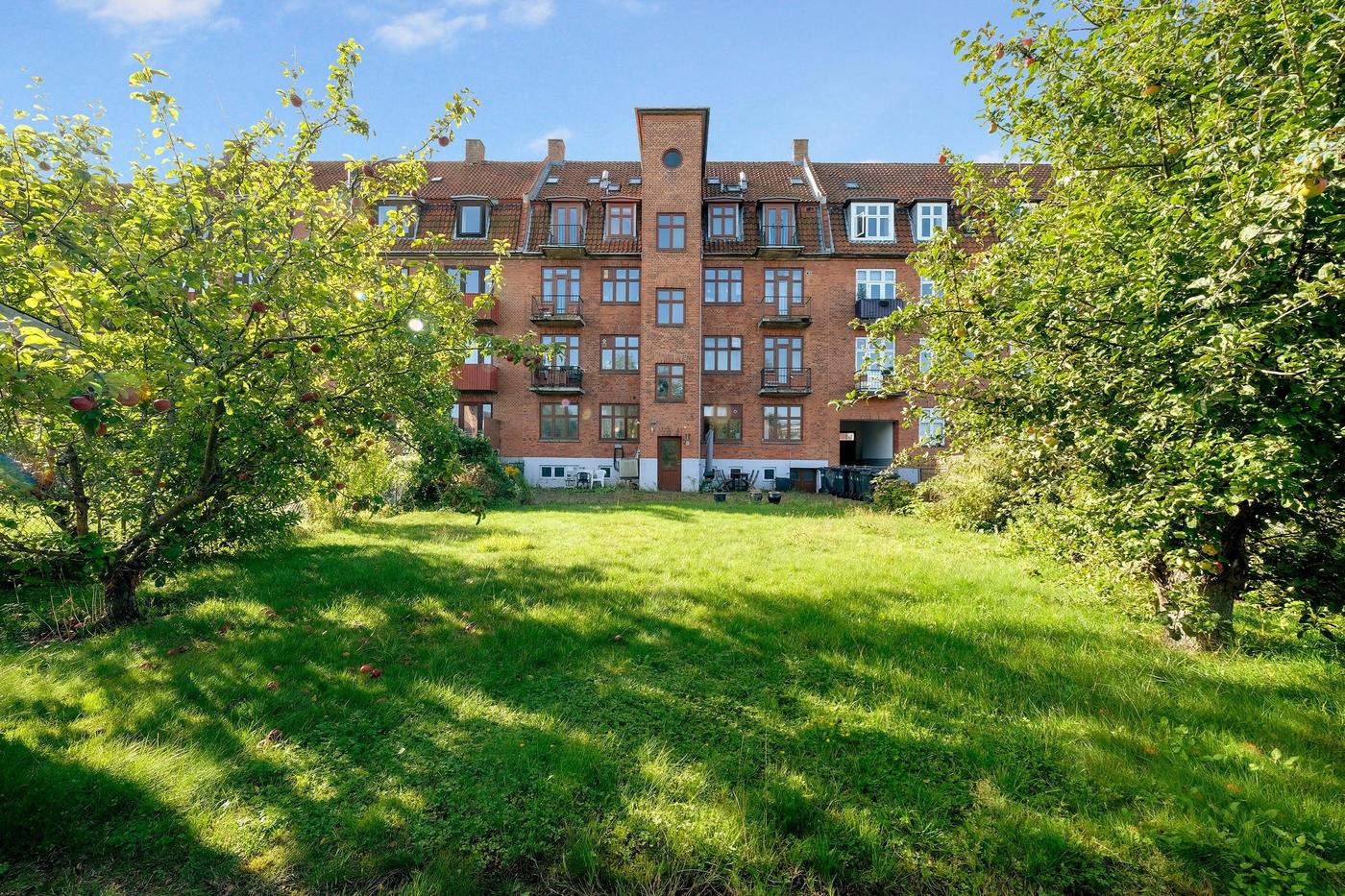 Der er have bag ejendommen, primært udlagt med græs. Andelsboligforeningen har en aftale med naboen om, at de må køre renovationsspande igennem naboens port.
