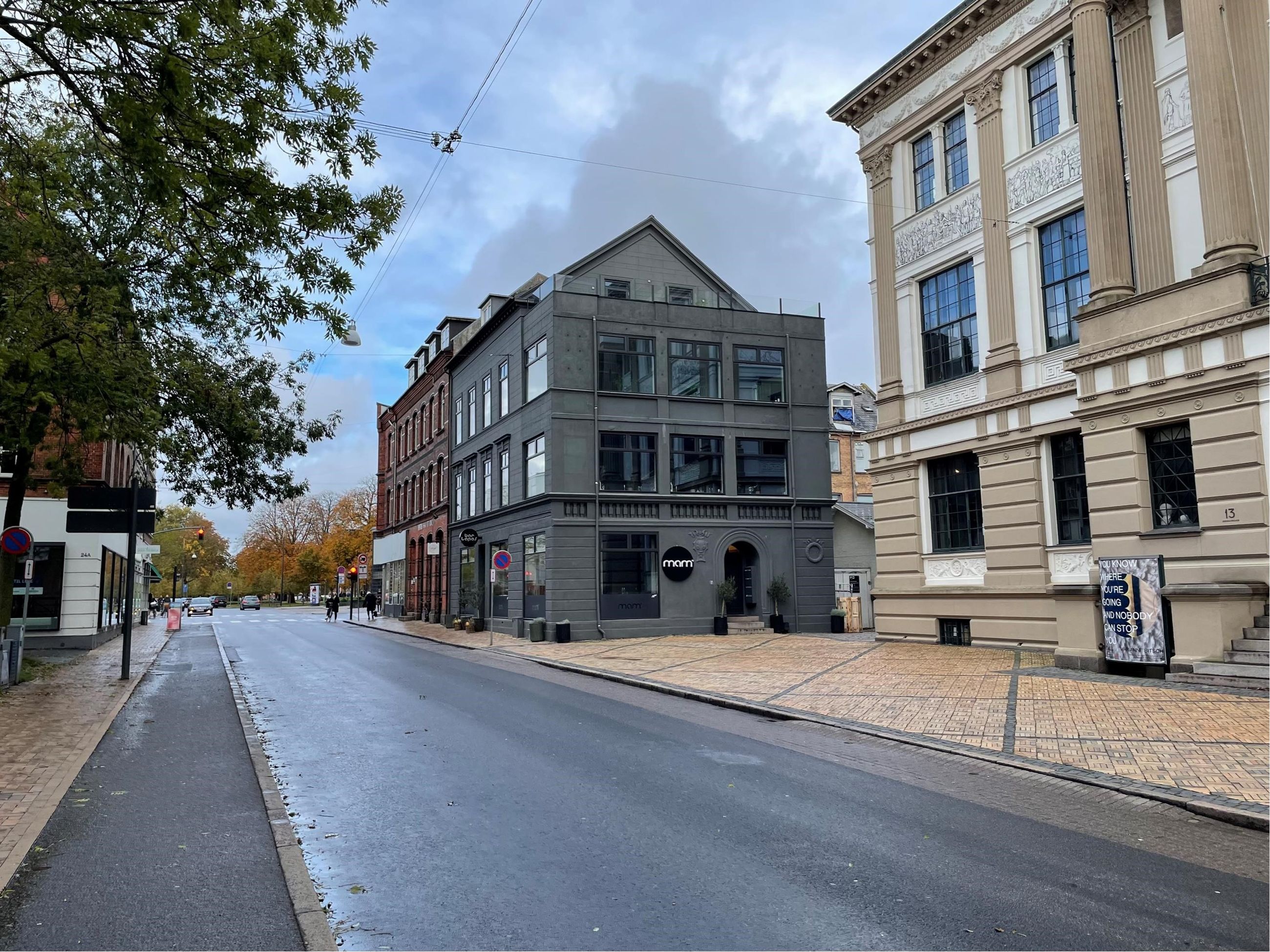 Ejendommen blev opført i 1900 og fremstår i dag velholdt med en enkel men dekorativ facade og store vinduespartier. Med meget kort afstand til både gågaden og Odense Banegård, er placeringen absolut primær.