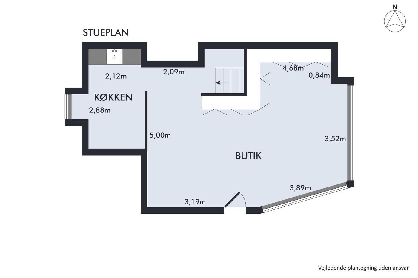 Lejemålet er indrettet med et regulært butikslokale med stort gulv til loft vinduesparti, som giver et rigtig godt lysindfald i lejemålet, men også giver en kommende lejer gode udstillings- og eksponeringsmuligheder for de mange forbipasserende.