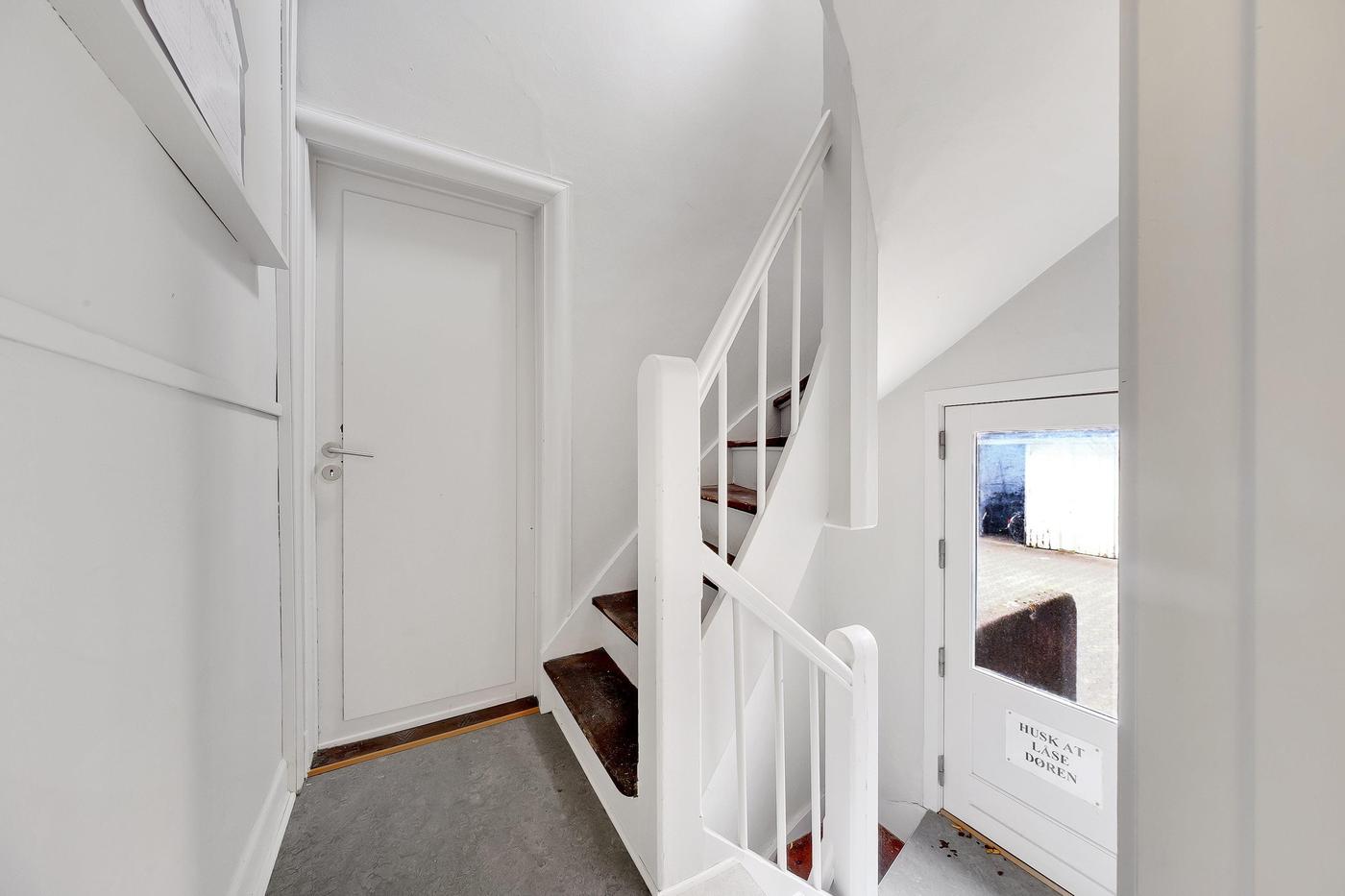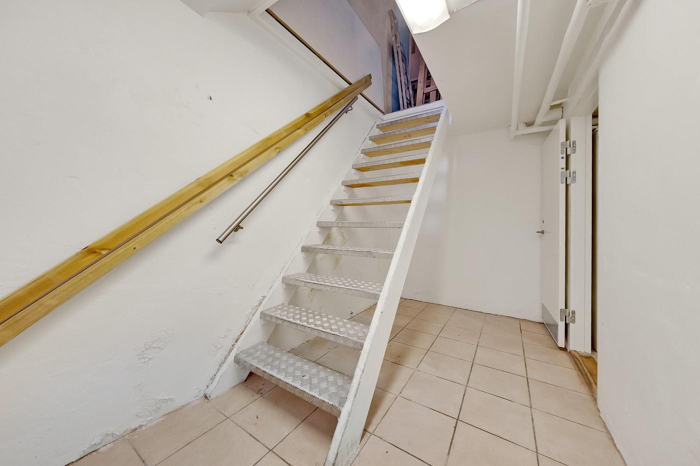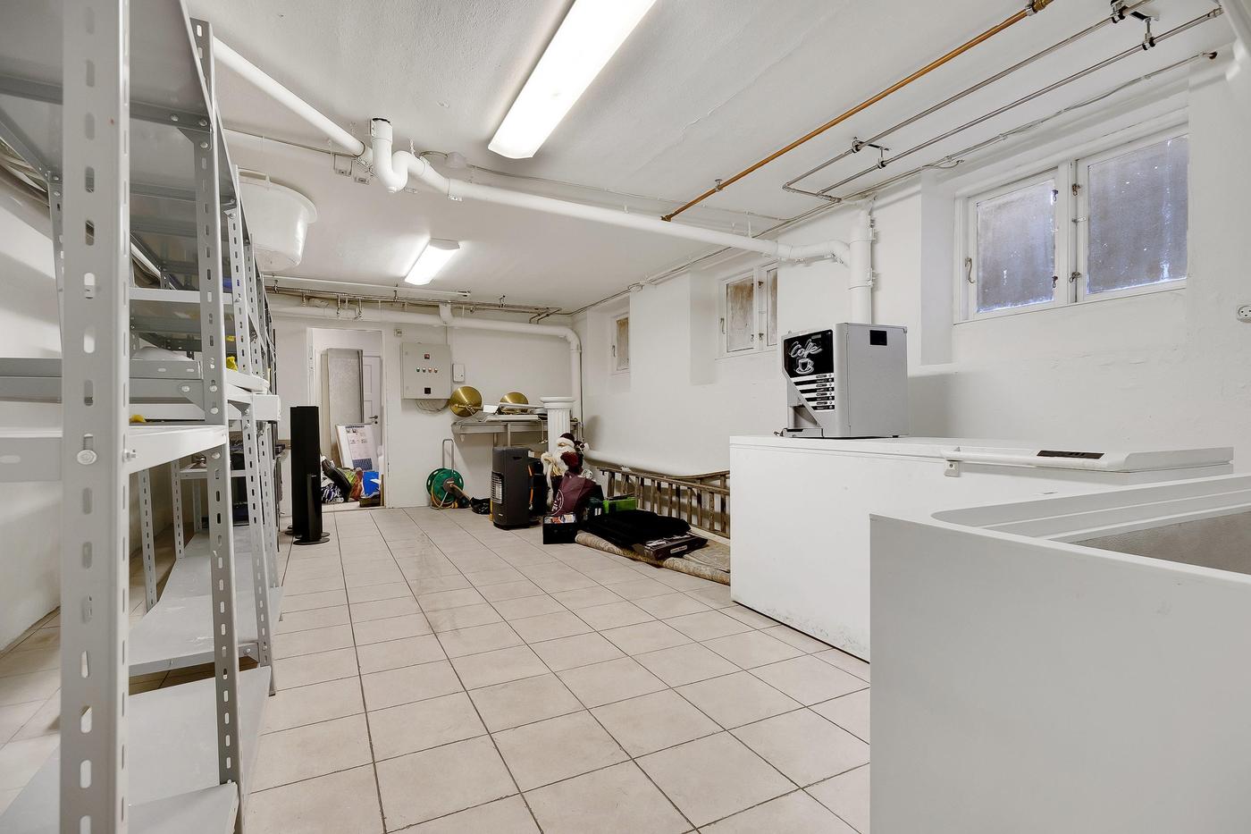 Fra baglokalet er der egen indvendig trappenedgang til medfølgende kælderlokale, indrettet i dag som lager, og kontorområde.