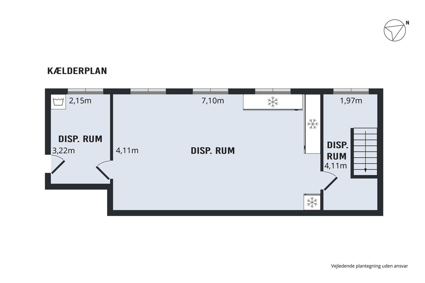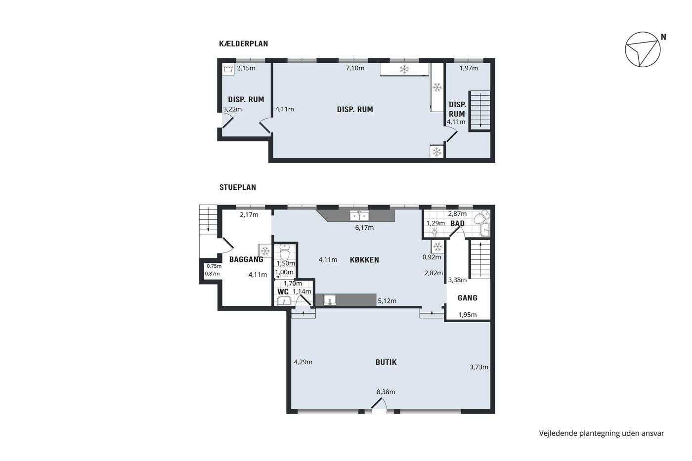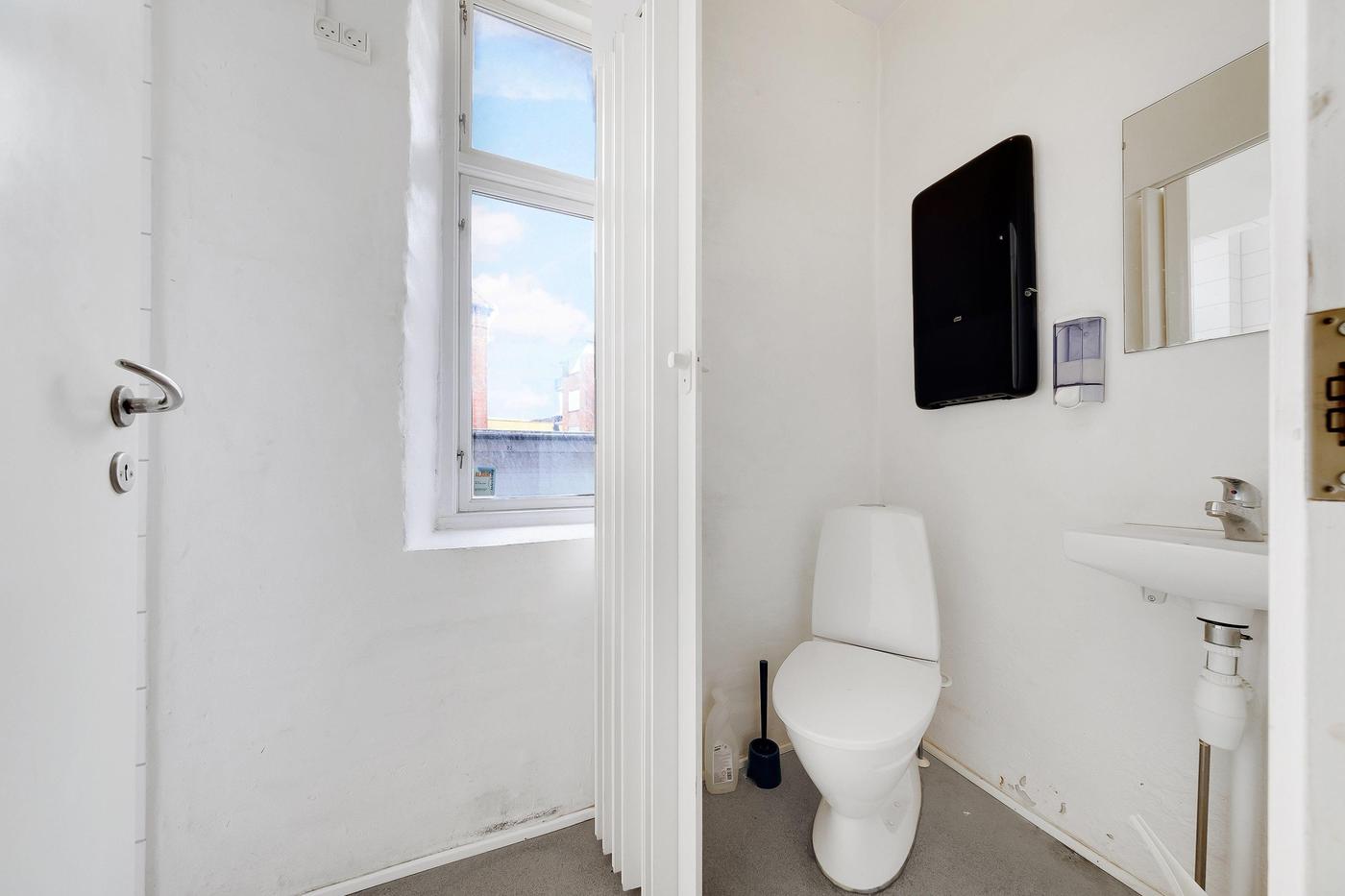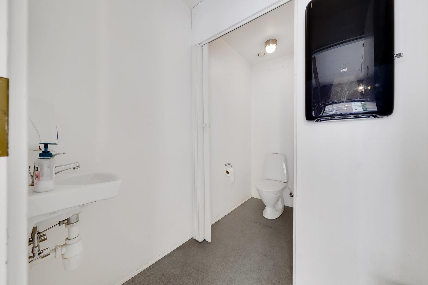 Fra baglokalet er der egen indvendig trappenedgang til medfølgende kælderlokale, indrettet i dag som lager, og kontorområde.