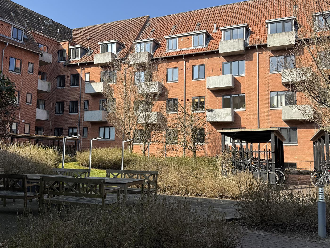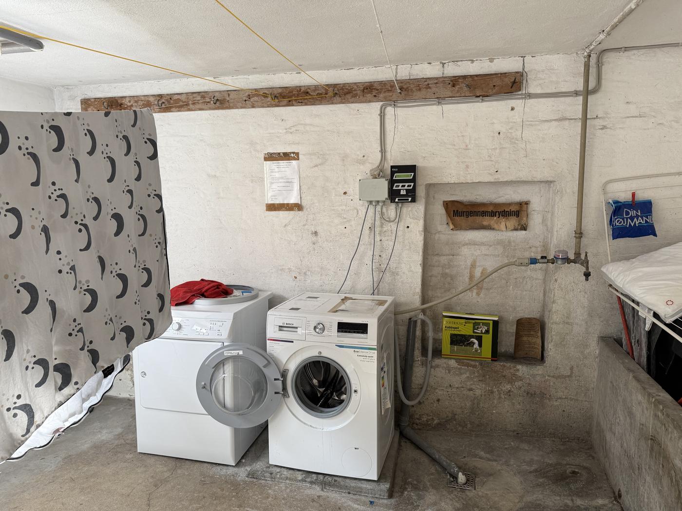 Der er kælderrum til lejligheder, tørrerum med vaskemaskine/tumbler mod kortbetaling (kr. 25 for vask og kr. 15 for tørring), cykelparkering m.m.