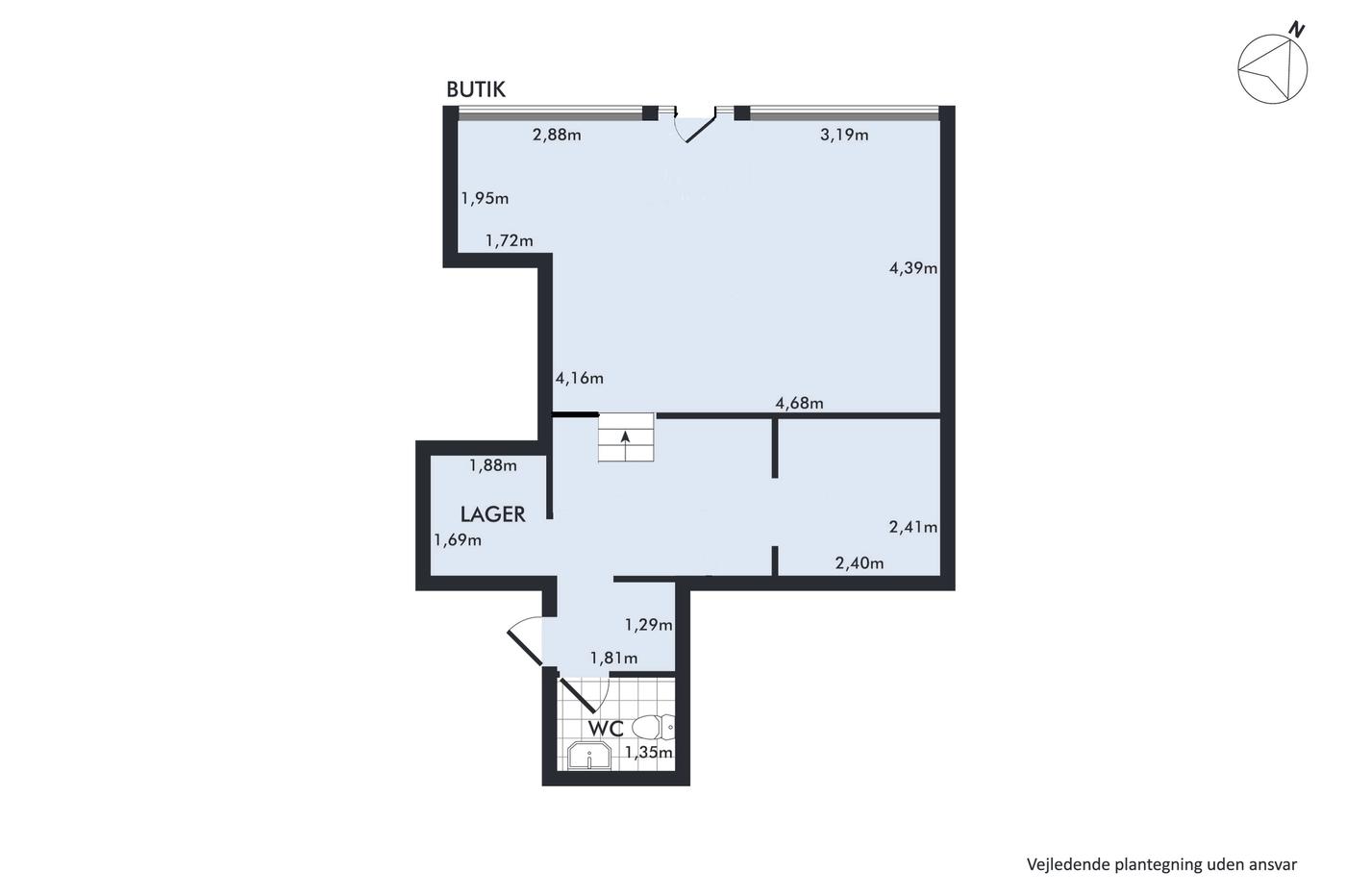 Lejemålet omfatter pænt og bredt butikslokale med flisebelægning, hvide glatte vægge. Herefter via trappe med 3 trin er der fra butik adgang til pænt toilet samt 2 mindre kontorer/rum. I alt ca. 59 m².