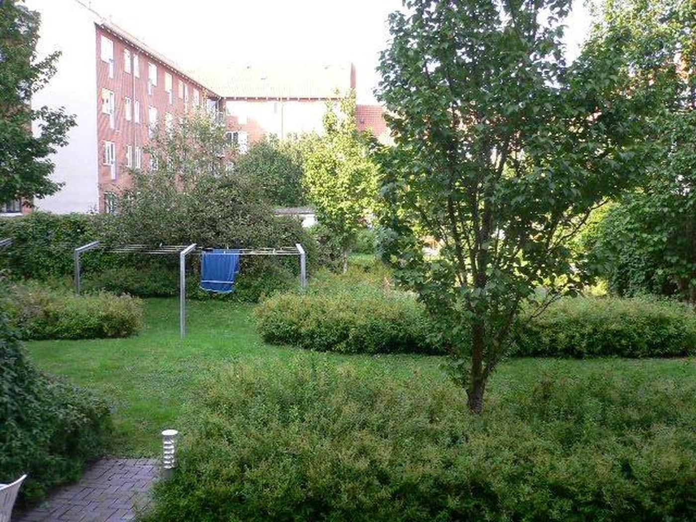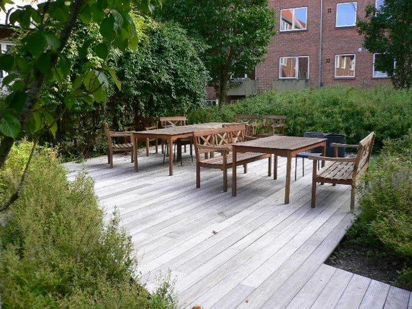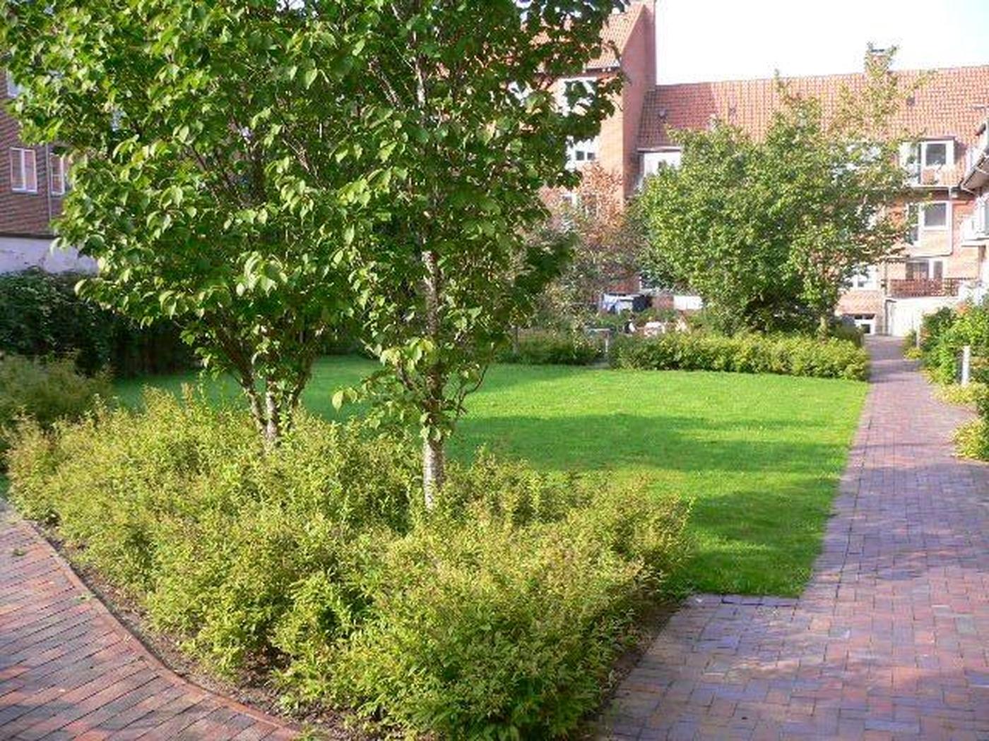 Der er adgang til fælles, flot og spændende gårdmiljø med fælles renovation, cykelparkering, græs, træterrasser med bænke m.m. Der betales i fællesskab til pasning af dette gårdanlæg fra omkringliggende udlejningsejendomme/ejerforeninger, hvilket også er årsagen til reduceret afsætning af vicevært udgift i driftsudgifterne.