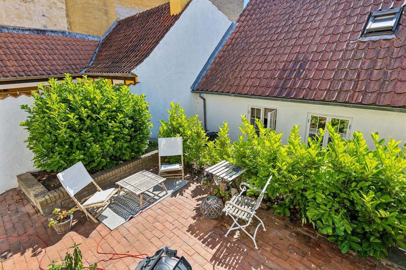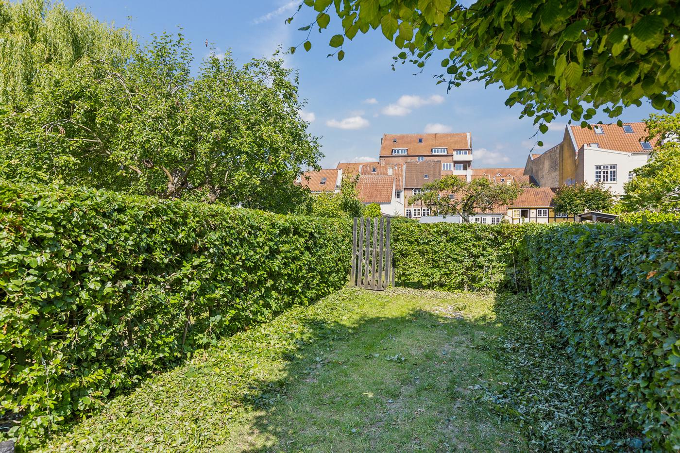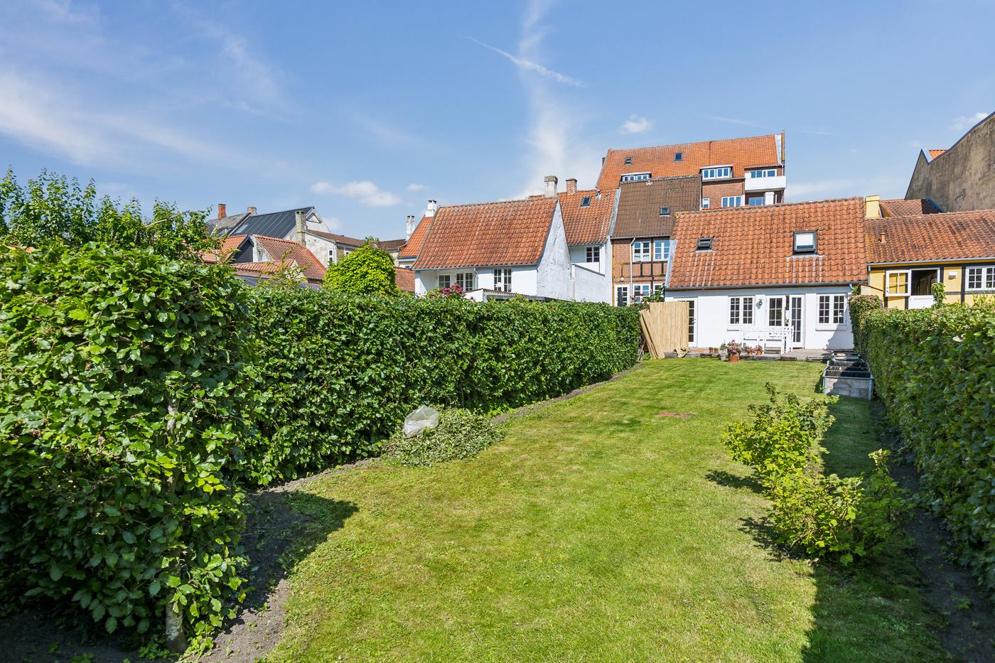 Ejendommen er beriget med en skøn, solrig have, som fremstår velplejet med grøn græsplæne, tætte hække og et roligt, privat udtryk. Haven skaber en naturlig forlængelse af ejendommen og især baghuset som nyder godt af denne. Der er desuden flere terrasser omkring ejendommen, som giver mulighed for at nyde solen hele dagen og skabe hyggelige uderum til både hverdag og gæstebesøg.