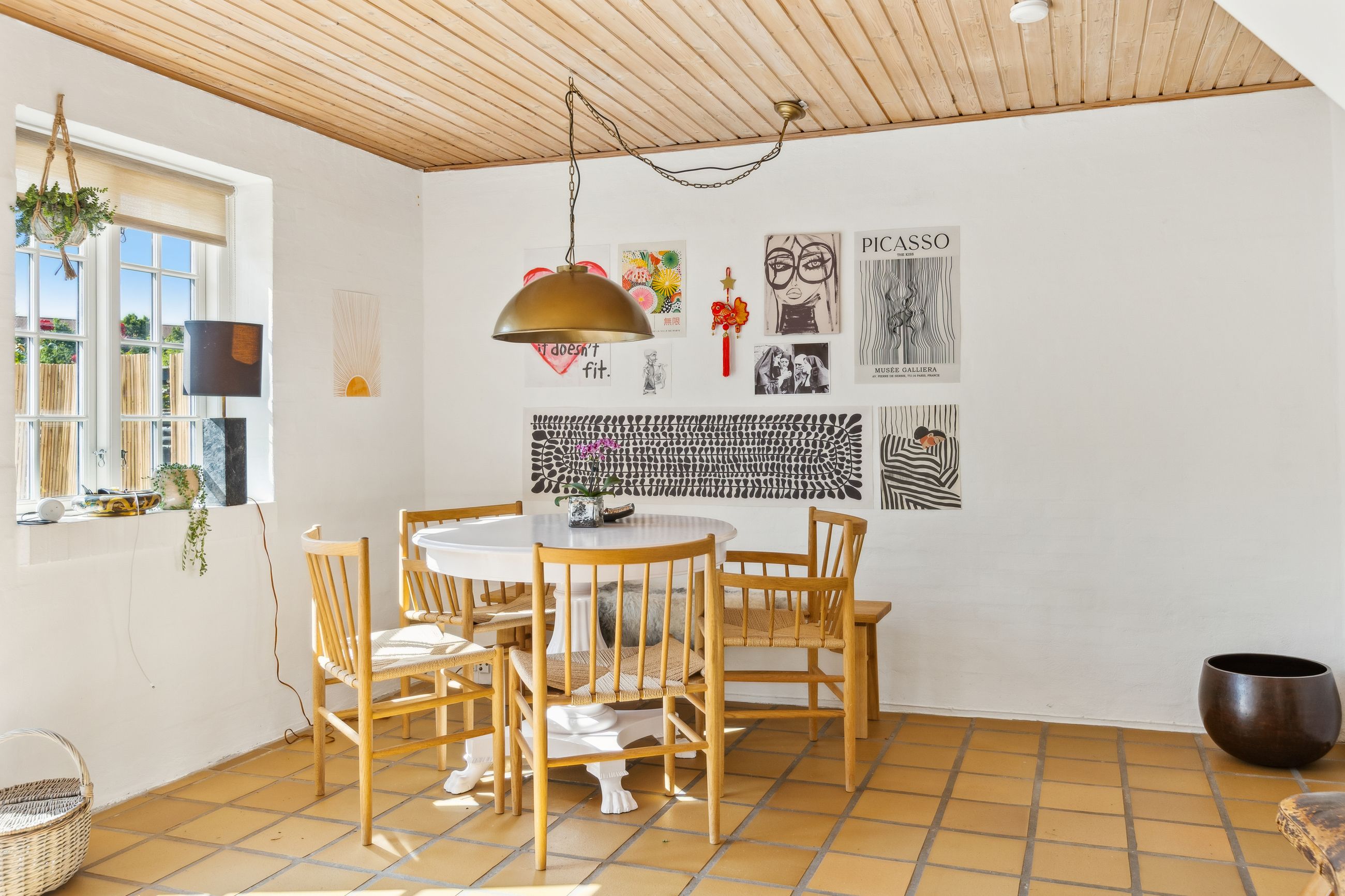 Ejendommen fremstår generelt i god og velholdt stand med hvidpudsede facader, blå vinduesrammer og røde tegltage.