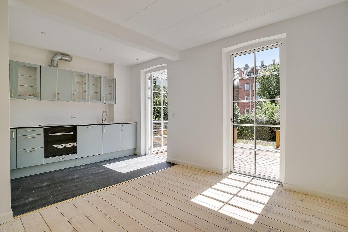 Lejligheden i baghuset er moderniseret og indeholder i stueplan entré, to sammenhængende stuer og åbent køkken. Fra køkkenet er der udgang til en dejlig terrasse og egen lukket have. 1. salen er indrettet med 2 soveværelser samt større badeværelse.