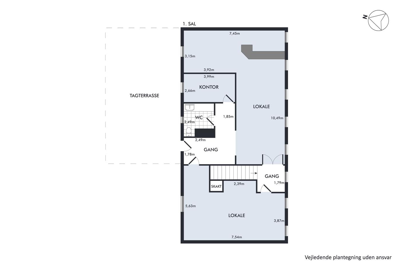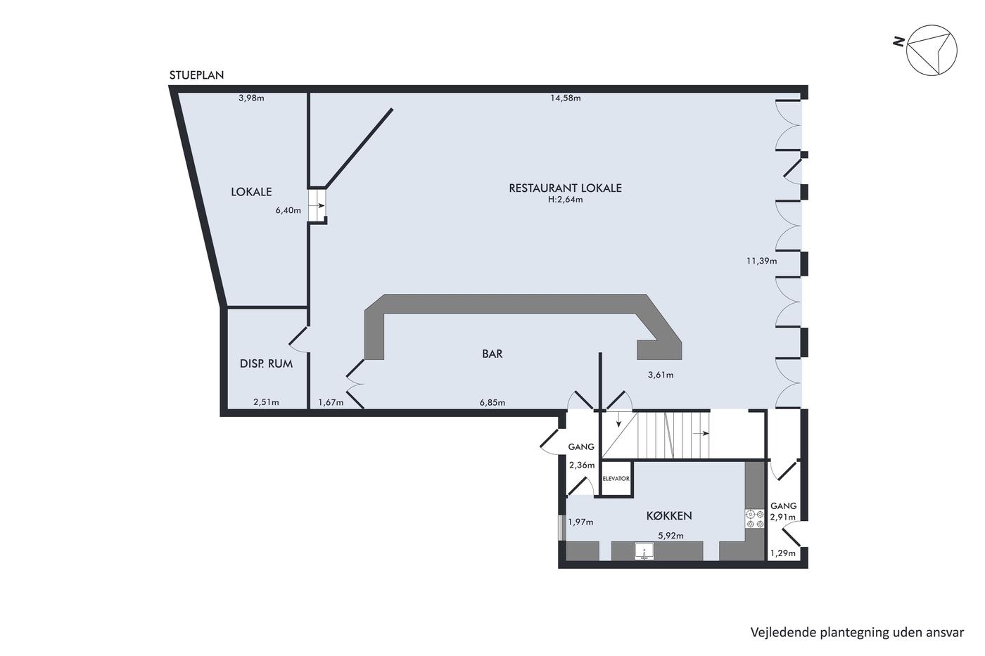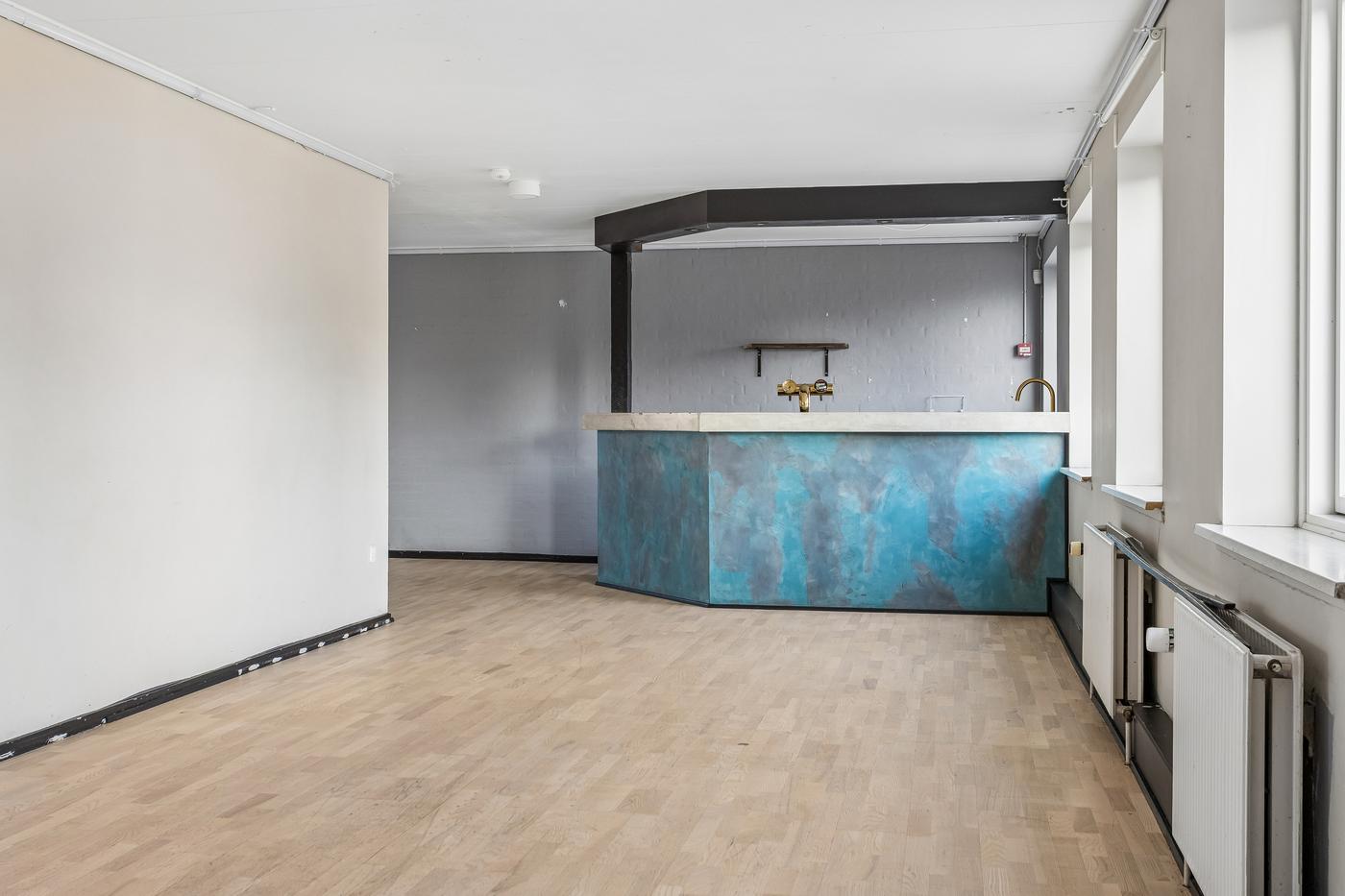 På lejemålets 1. sal er indrettet eventlokale med egen bar, toilet og dansegulv.