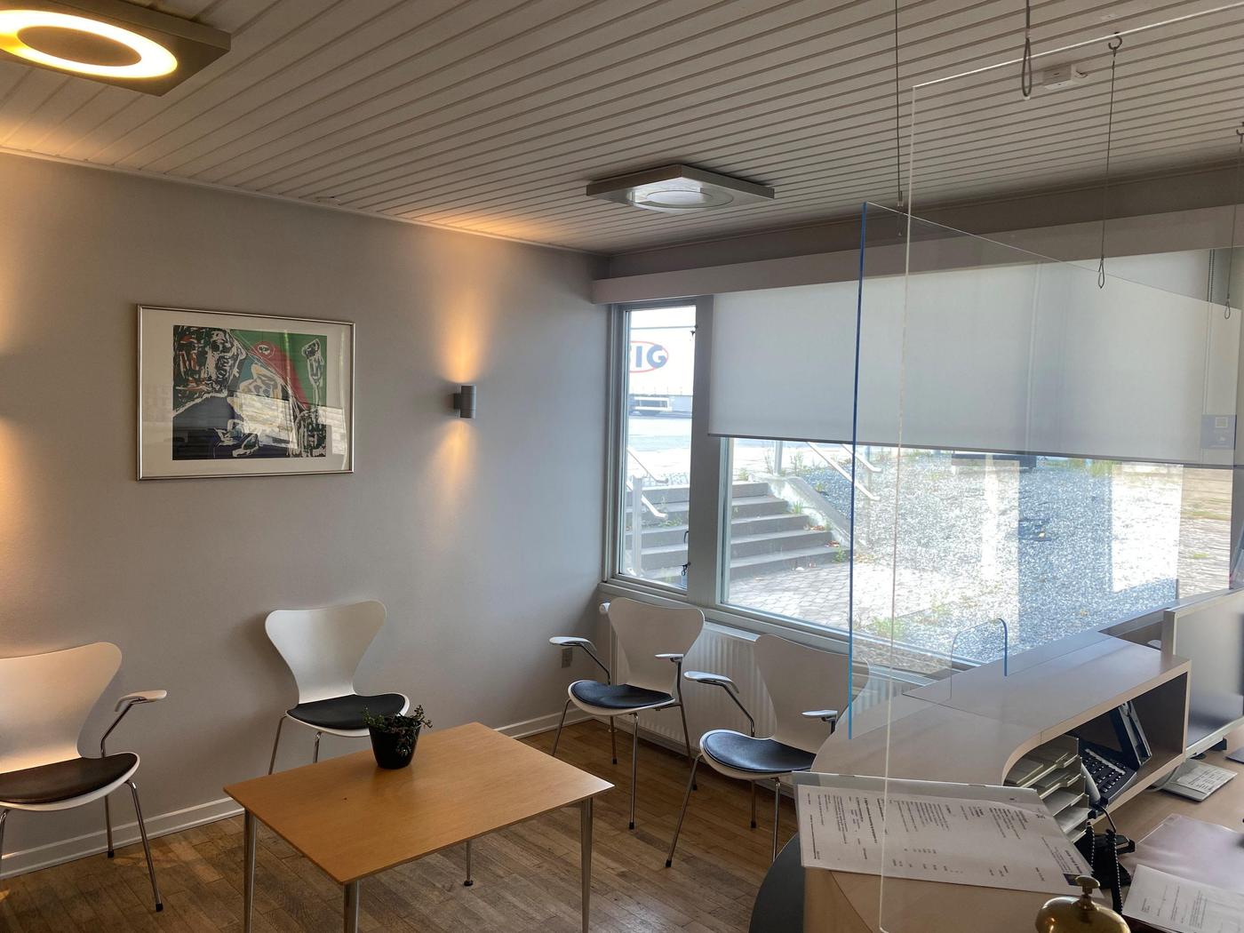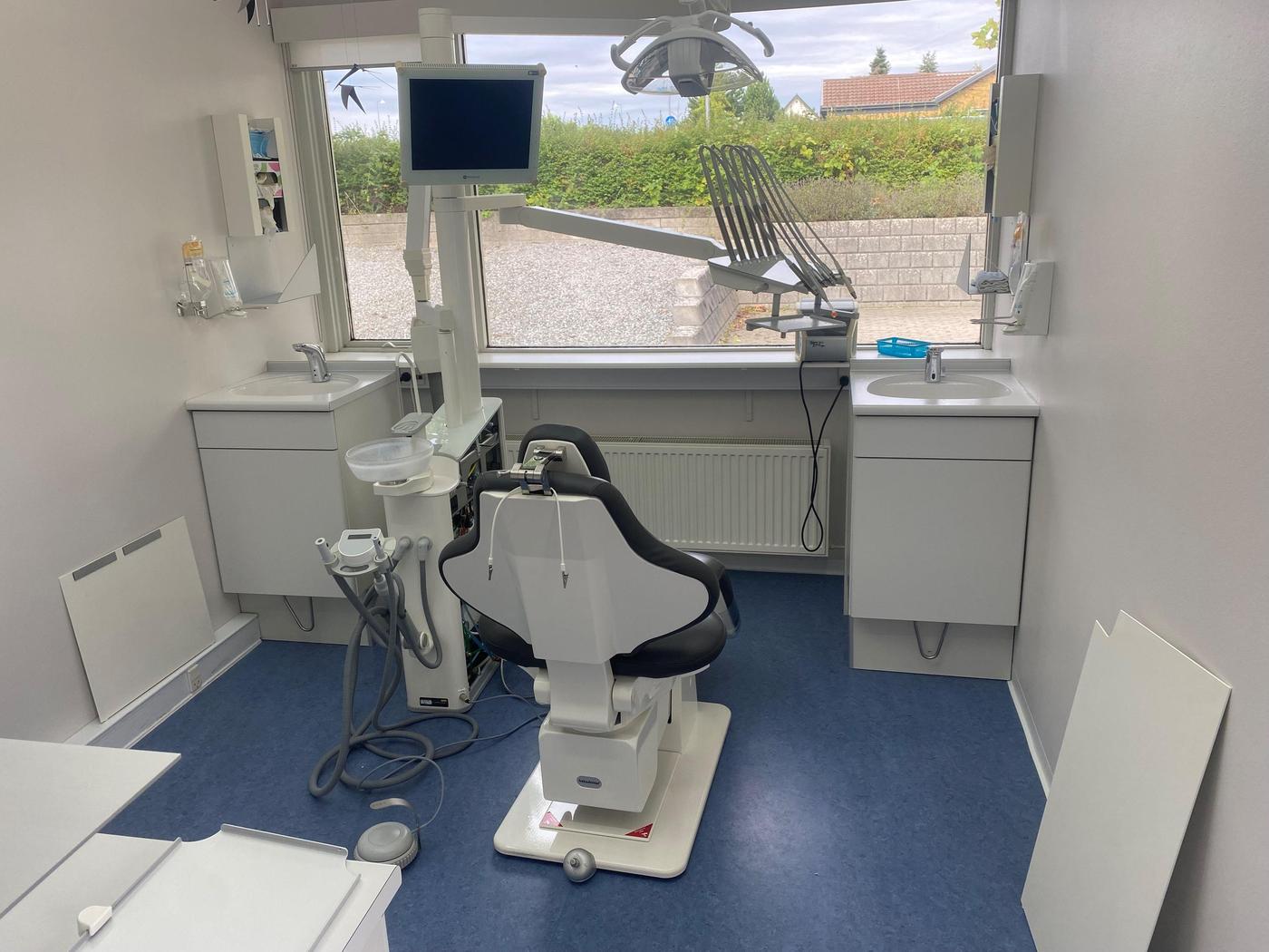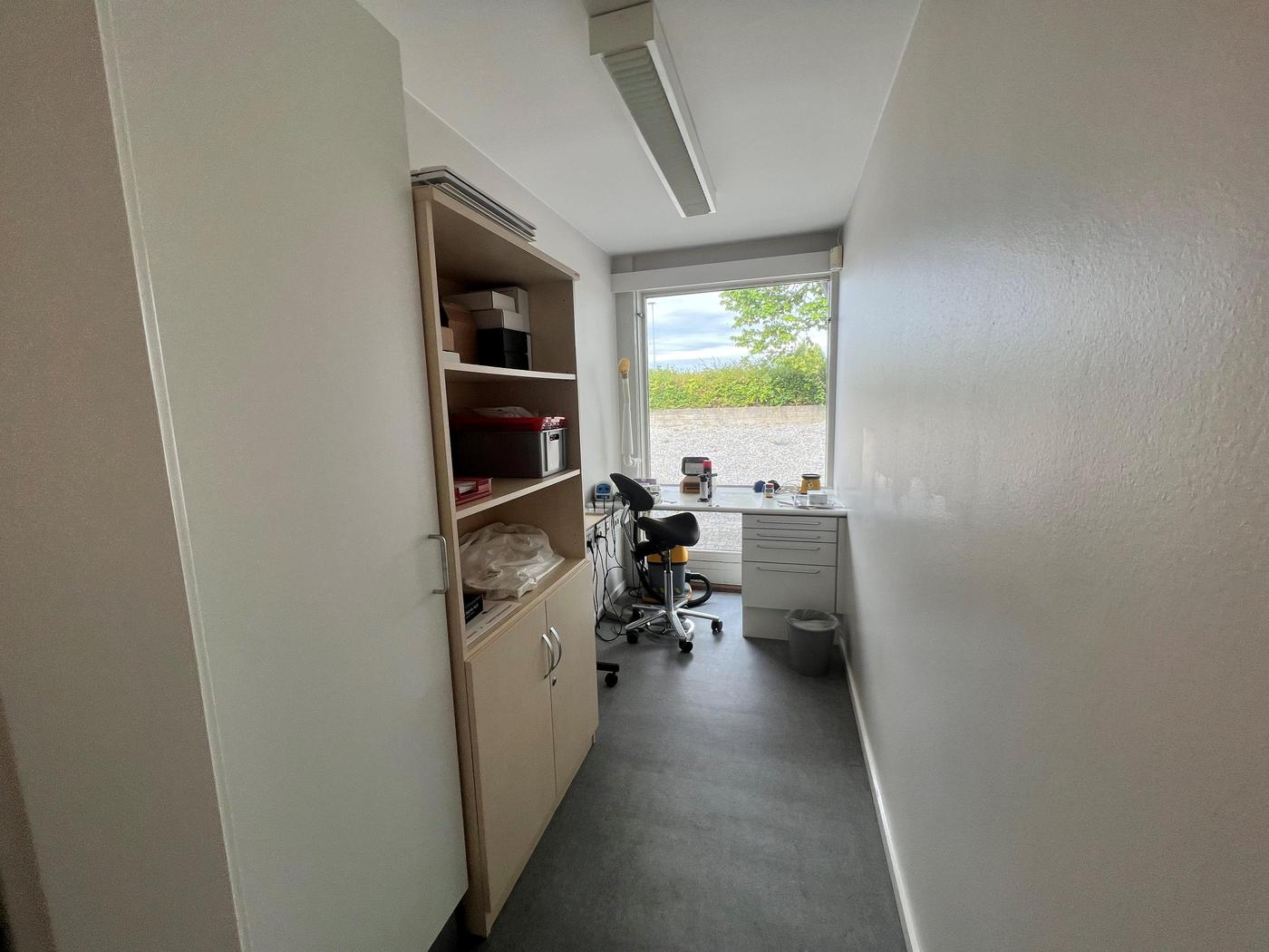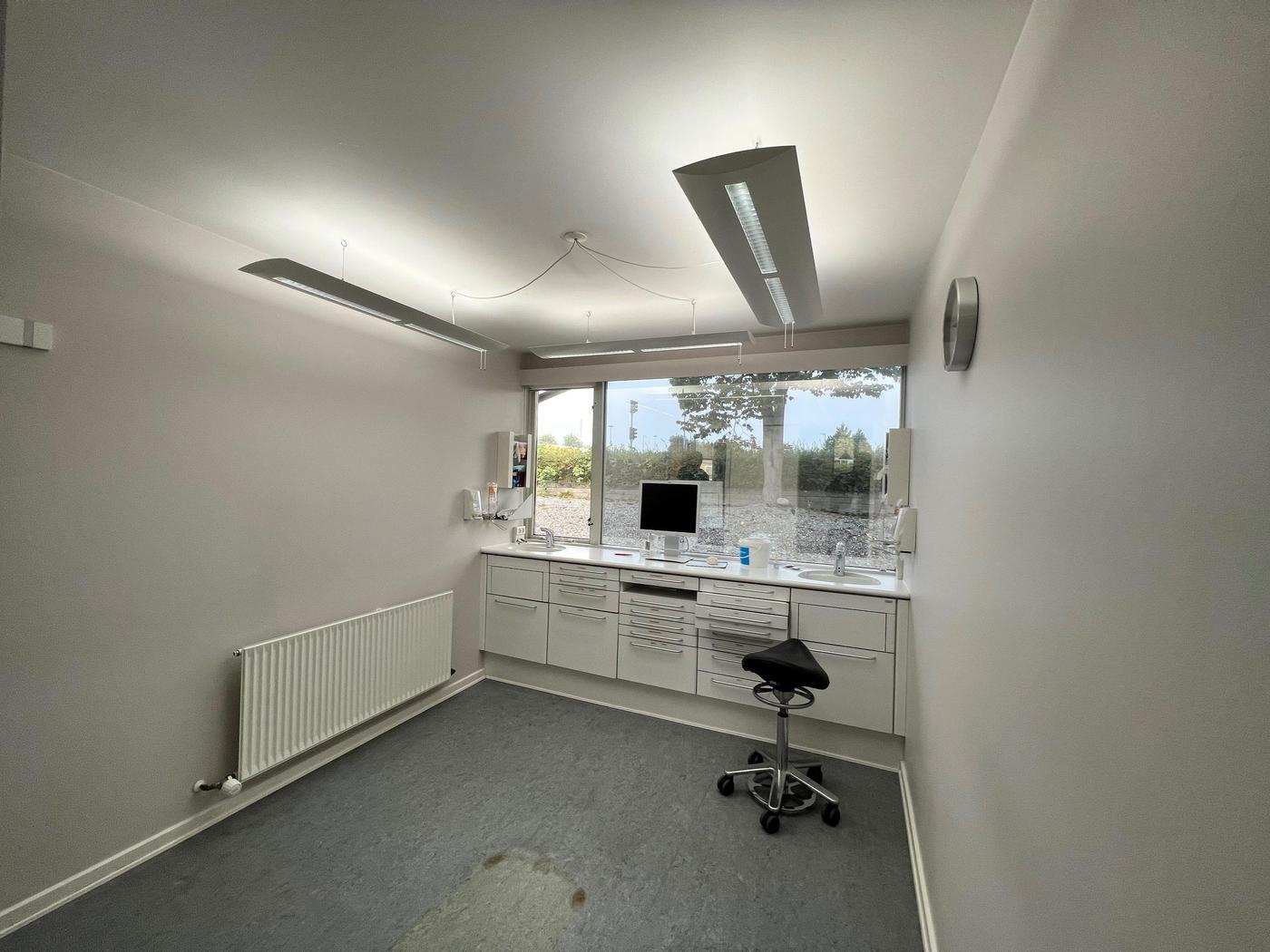 Indvendig består ejendommen af en entre med adgang til pænt kundetoilet, en stor åben reception samt venteværelse med pejs. Derudover består ejendommen af 5 rum af fin størrelse, toilet og eget køkken, mens der udendørs er et skur. Ejendommens hidtidige benyttelse har været til tandlægeklinik.