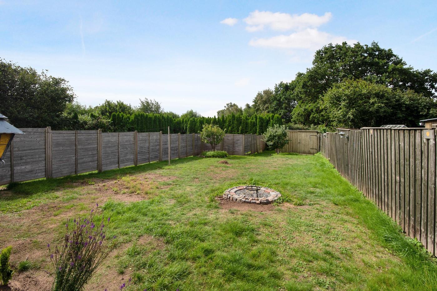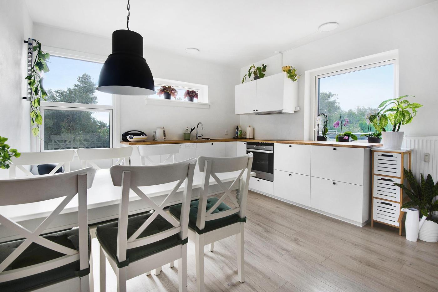 En del af vinduerne/døre er skiftet til træ/alu. mens resten er malede trætermovinduer i nydelig stand.