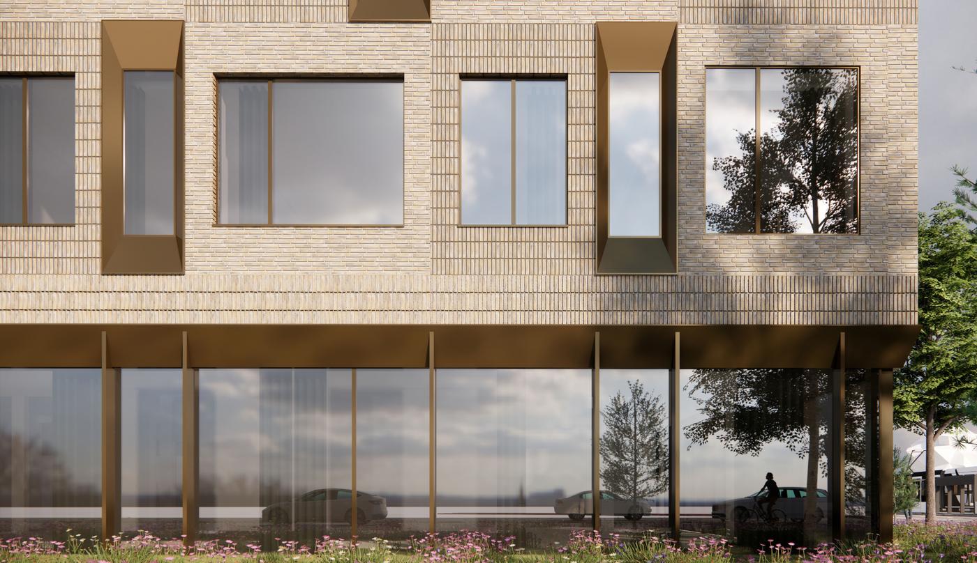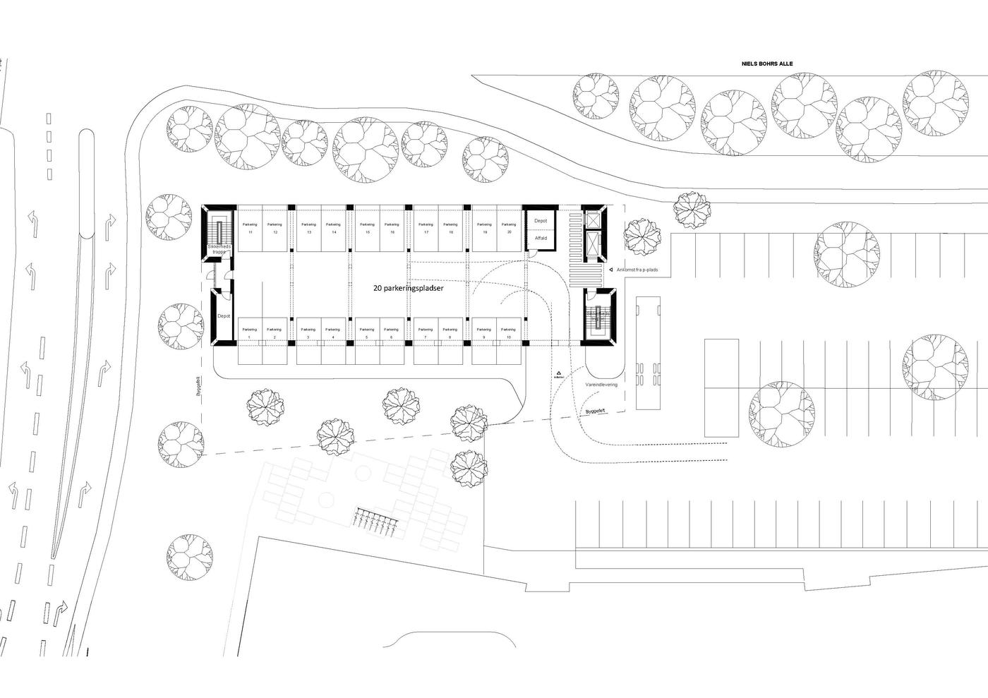 Hovedankomsten i bygningen vil ske i det rekreative mellemrum mellem bygningen og nabobygningen (kontordomicil for GF Forsikring).