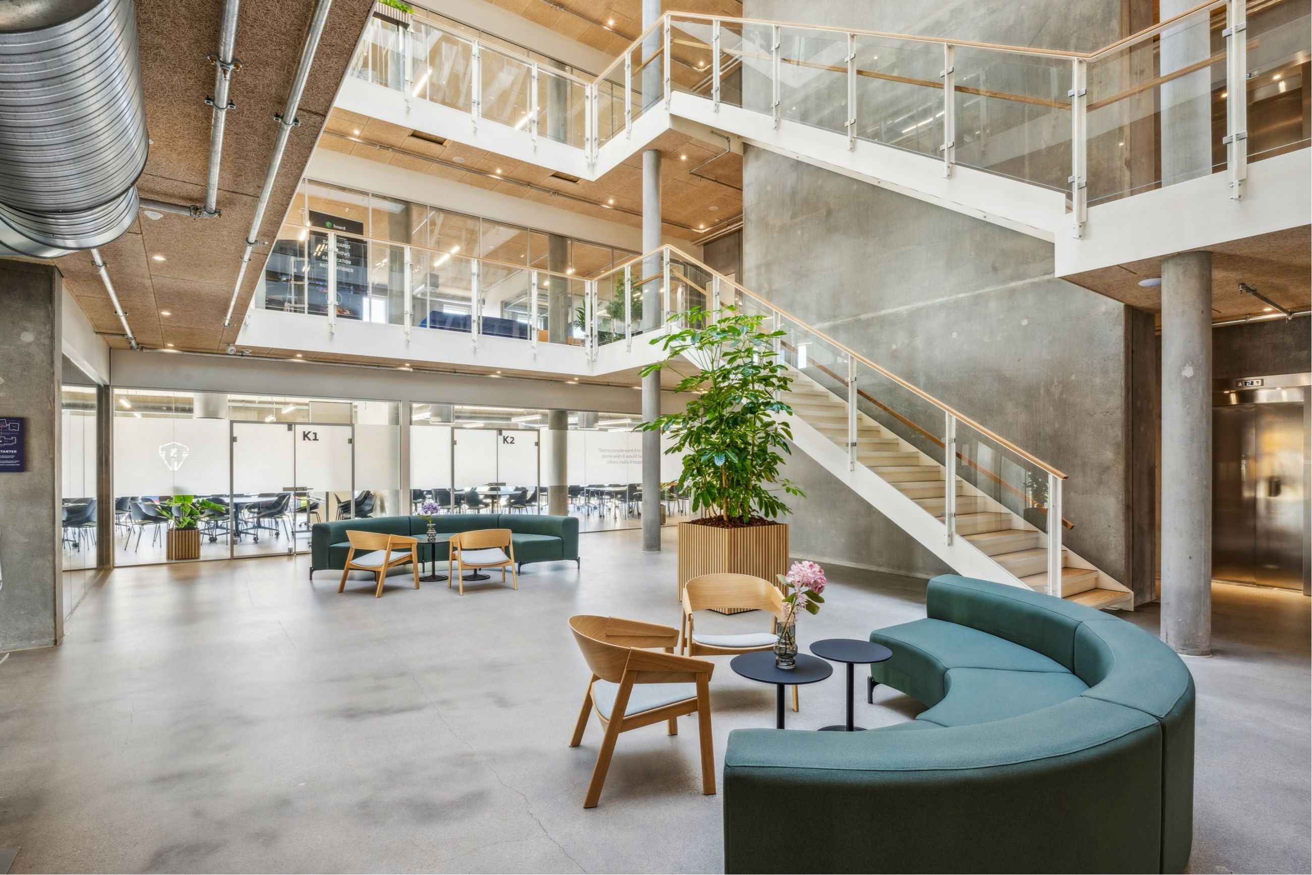 Kontorarealerne er helt regulære og kan indrettes efter lejers ønske. Interiør, hvilket omfatter vægge, gulve m.v. fremstår i råmaterialer, der suppleres med store vinduespartier fra gulv til loft. Alle toiletfaciliteter, gangarealer og elevator er samlet i en fælles kerne på hver etage, hvor der tillige findes tekøkken.