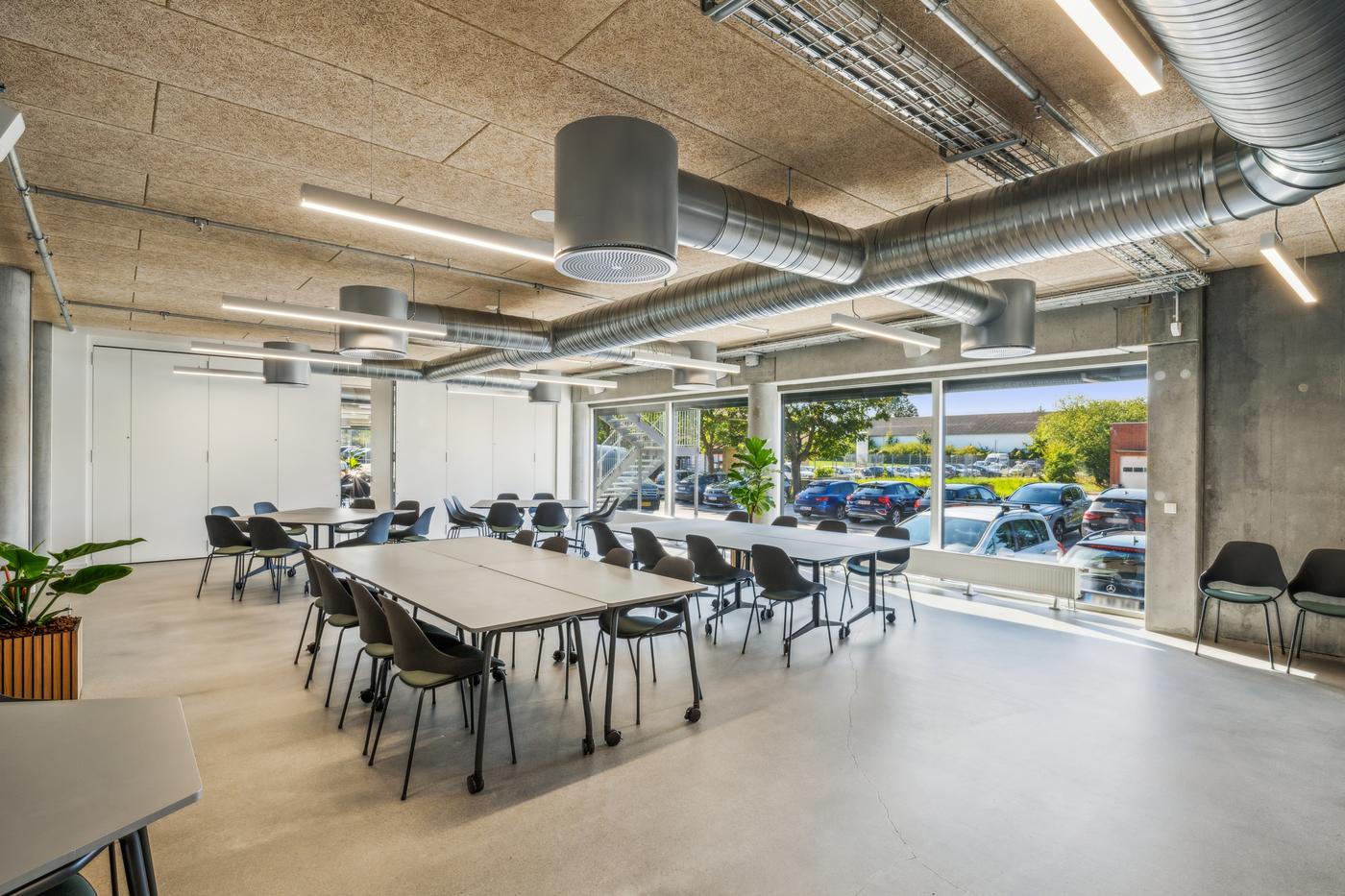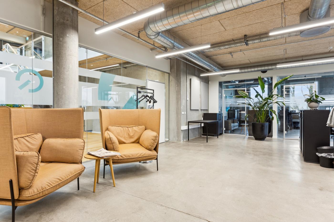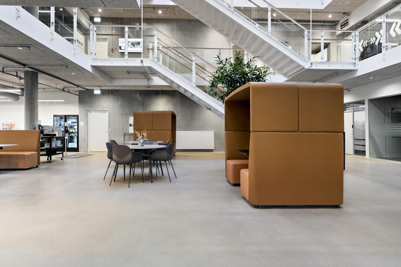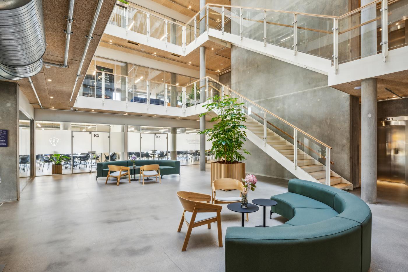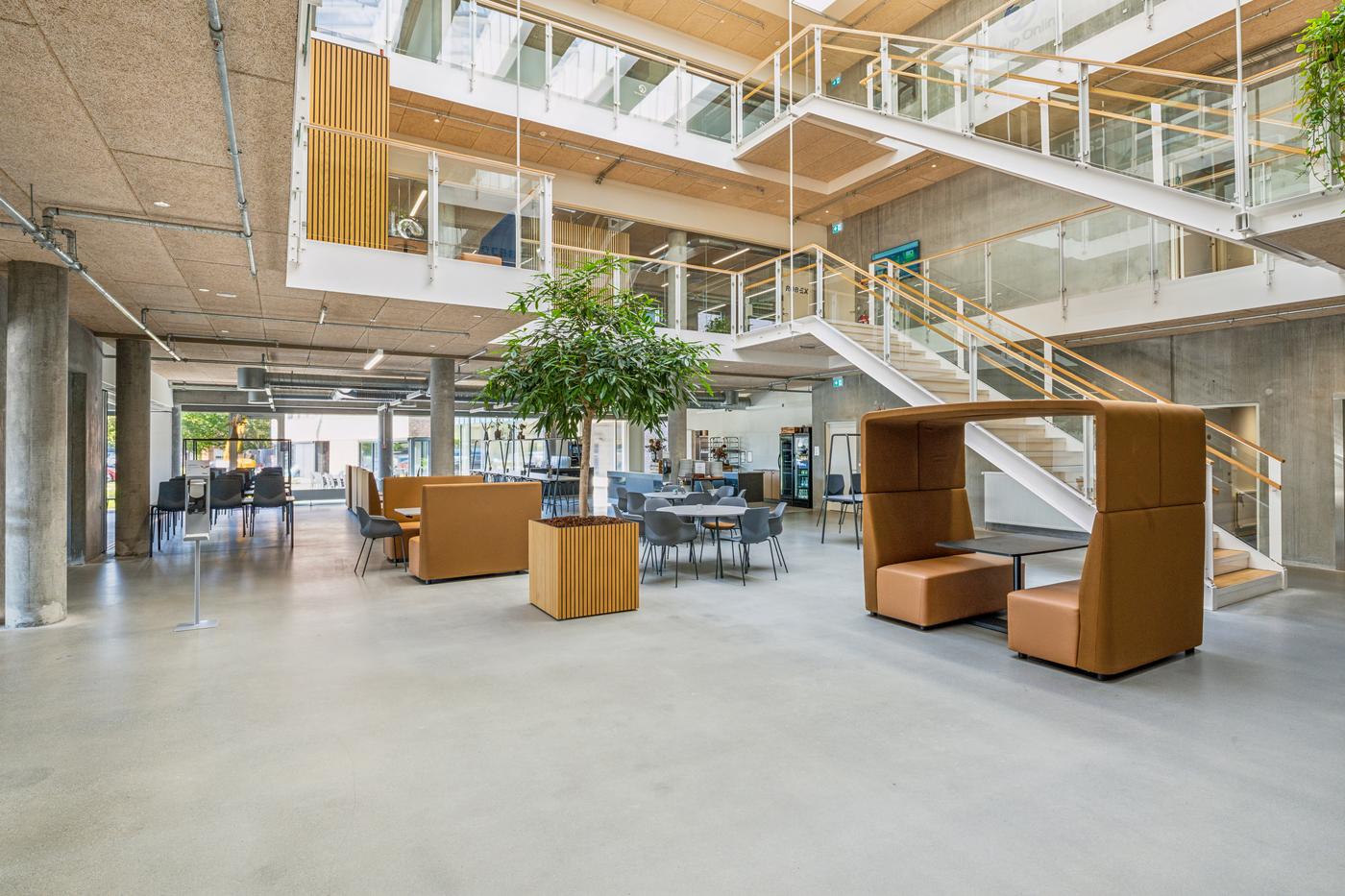 Når du entrerer ejendommen, mødes du af en åben og imødekommende hall, oplyst af store ovenlysvinduer. I stueetagen er der fælles konferencelokaler, mødelokaler, loungeområder og kantine.