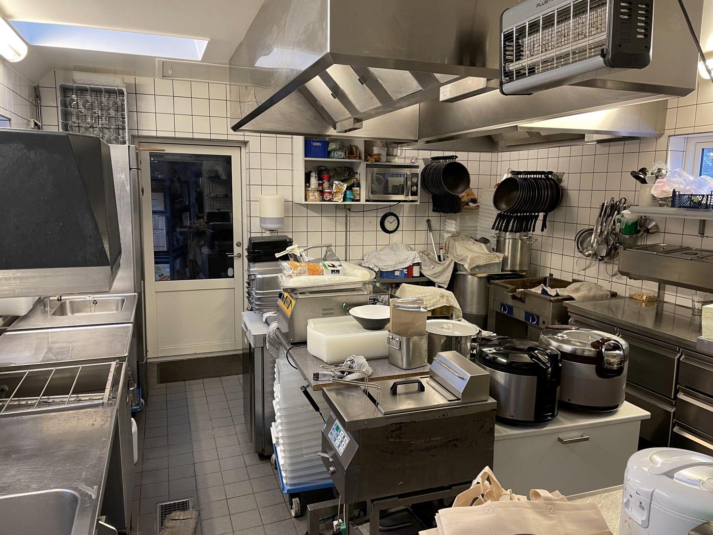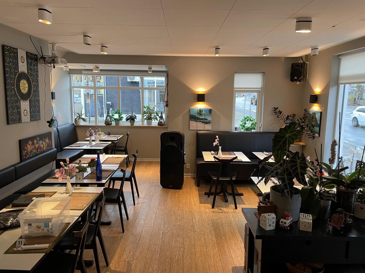 Stueplan, som udgør 124 m², er indrettet med flot restaurationslokale med plads til 34 spisende gæster, 2 flotte toiletter - heraf 1 handicaptoilet, personaleområde/disk med adgang til industrikøkken med alt i inventar og udstyr. Bagbygning er indrettet med lagerfaciliteter.