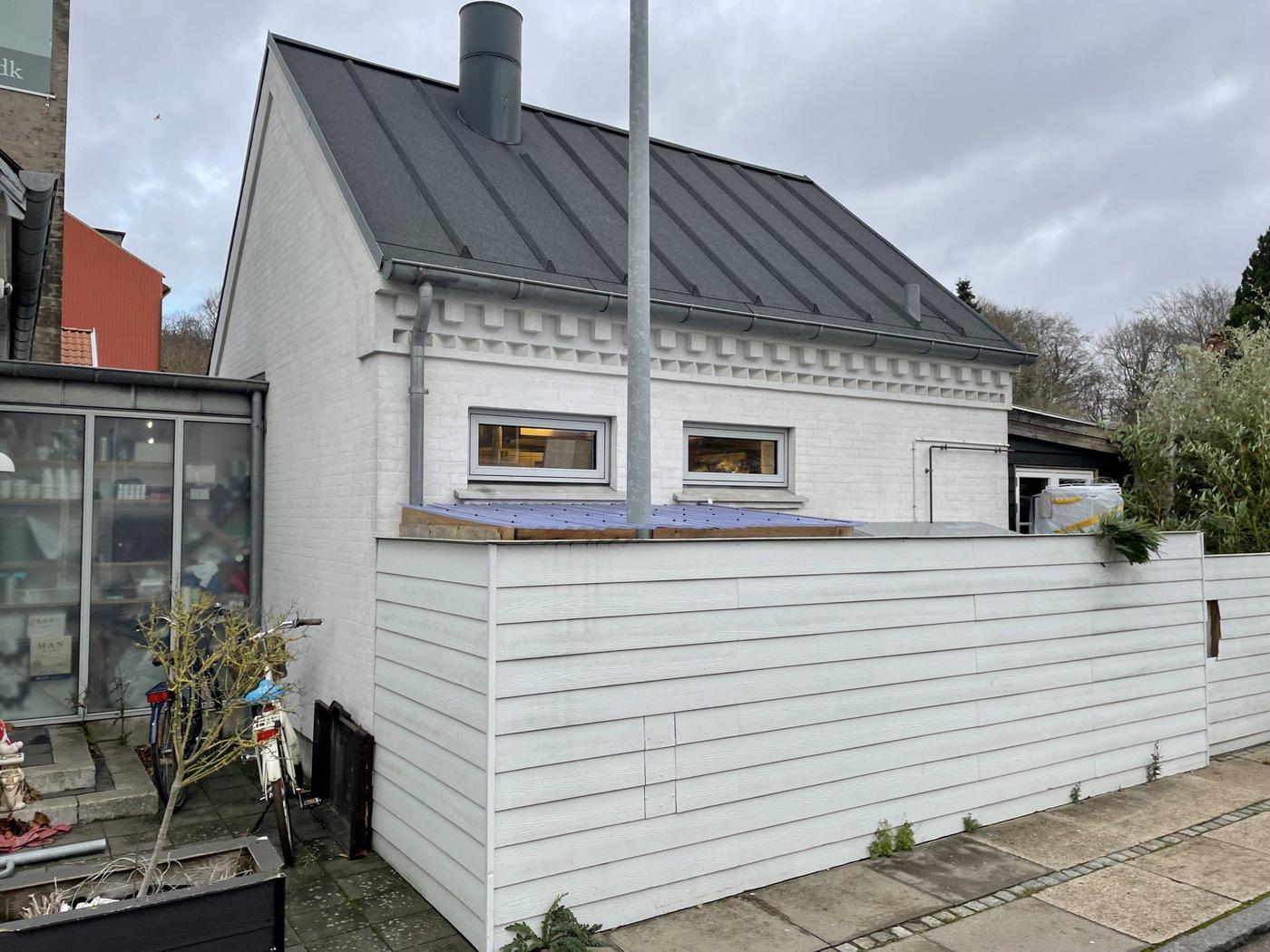 Hovedhuset er opført i mursten, som er malet samt med nye aluminiums vinduer. Tagbelægning er med skifer. Sidebygning er opført med vandskurede facader pålagt tagpap med listedækning. Desuden bagbygning med træbeklædning samt halvtag med tagpap.
