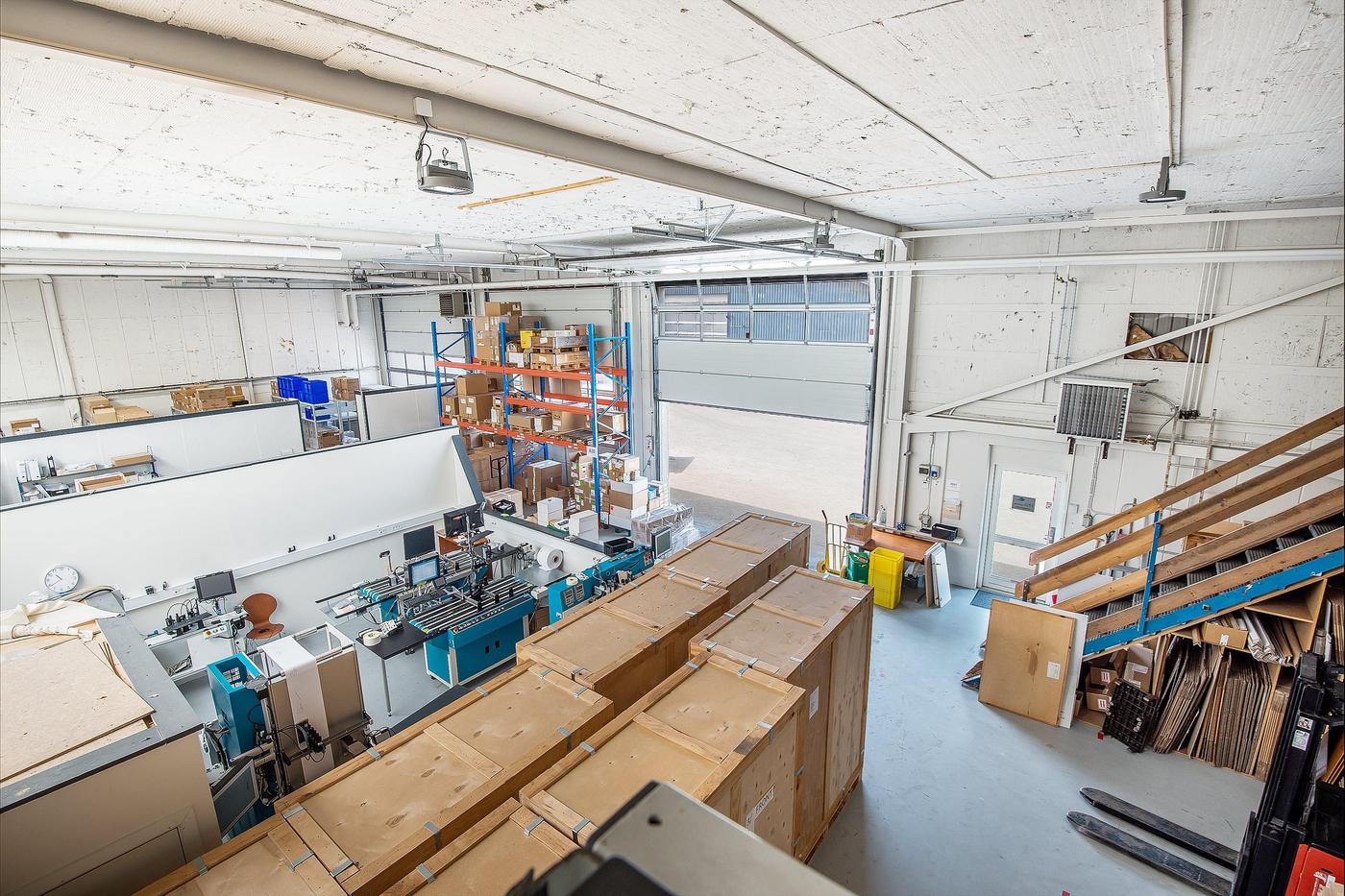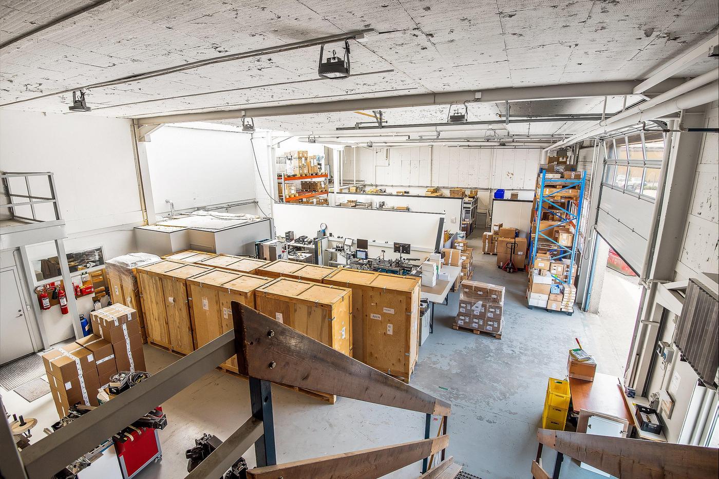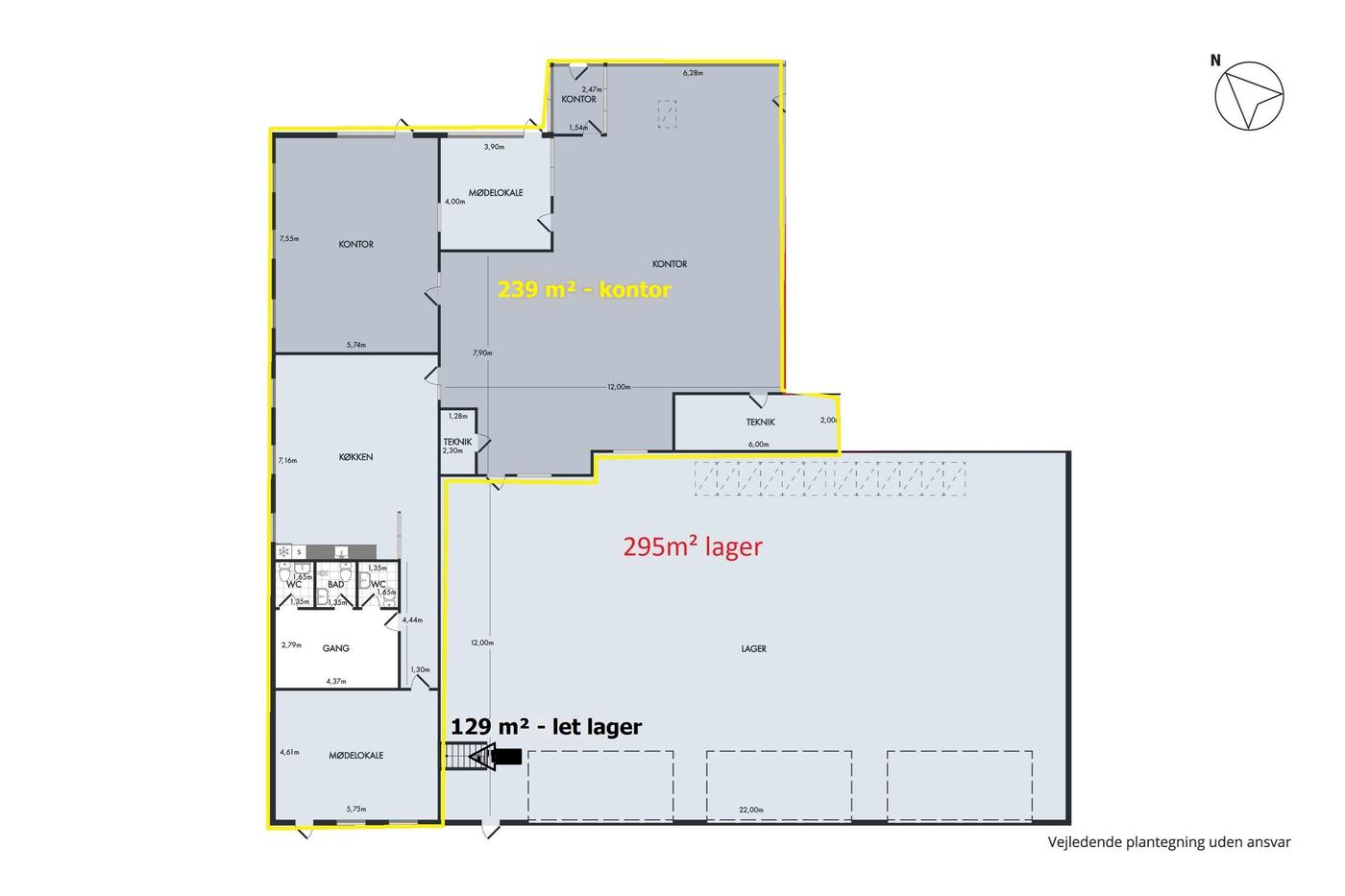 Lager/værkstedsdelen på 295 m² er med 6 meter til loftet og der er adgang fra kontor eller indgang fra bagsiden af bygningen. Adgang er via 3 store rulleporte - heraf 2 elektriske. Der er mulighed for at anvende etagedækket over kontorarealet til let lager/opbevaring.