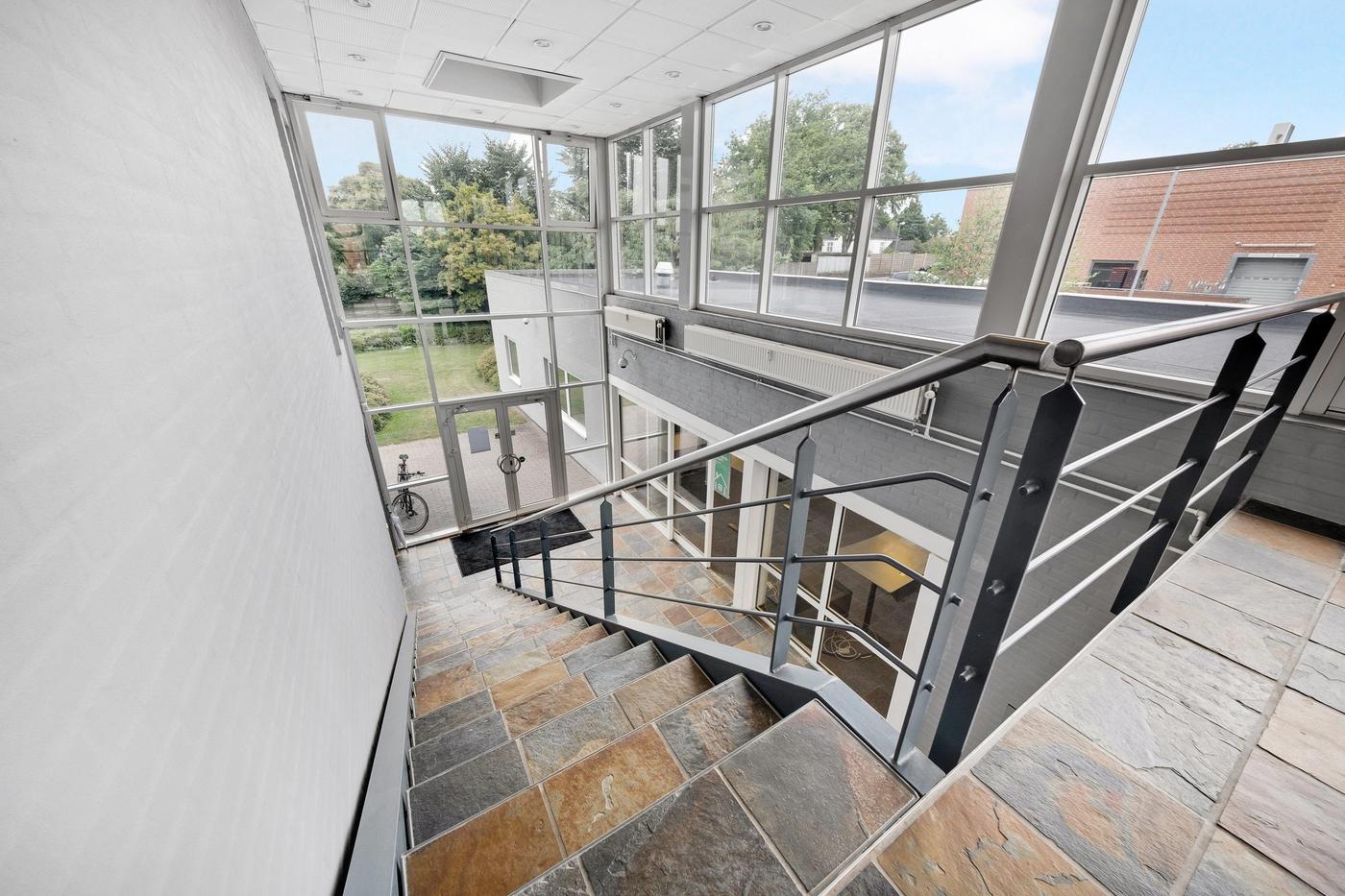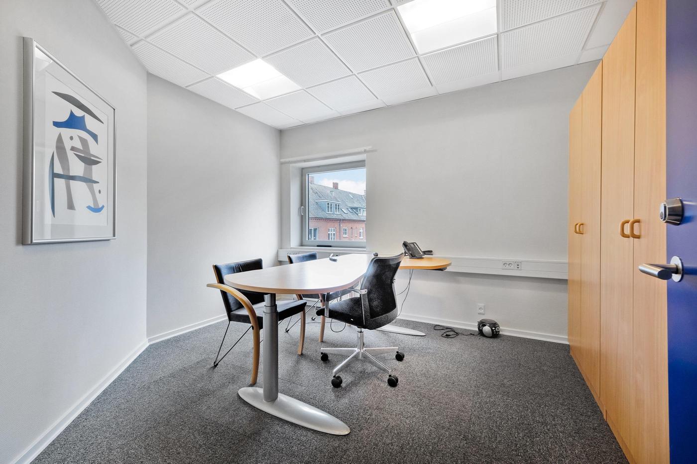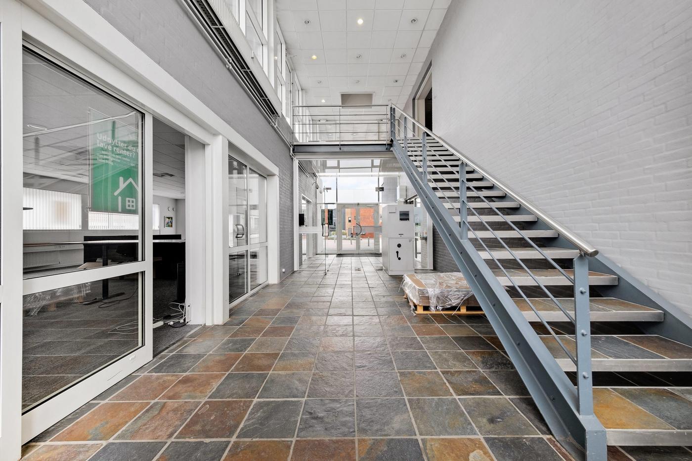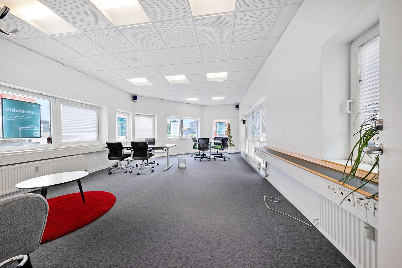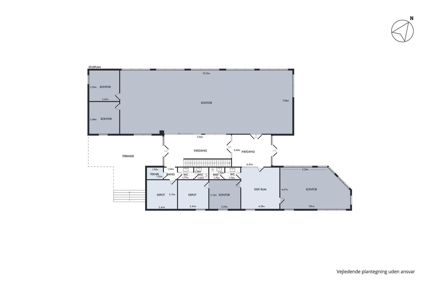 Stueplan er til venstre indrettet med storkontor, mødelokale, arkiv, toilet/bad og egen indgang (kan udlejes separat). Dernæst er der flot, luftig hall med højt til loftet og trappe til 1. sal. Til højre i stueplan er der storrumskontor til 8 mand, 2 mødelokaler, toilet, arkiv og teknik tilknyttet. Der er akustiklofter + tæpper på gulvene. Der er etableret luftcirkulation.