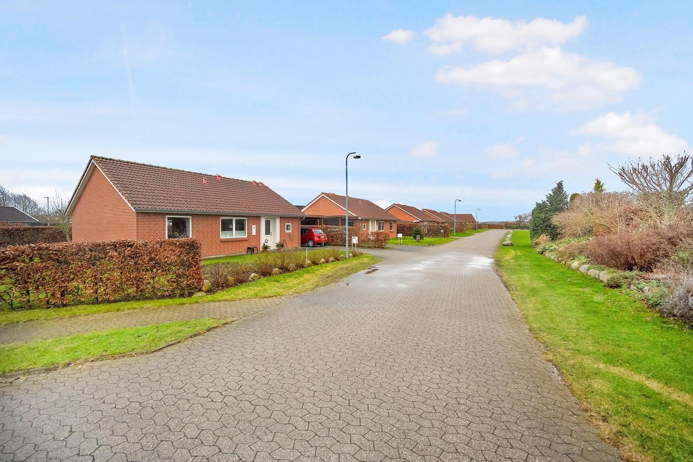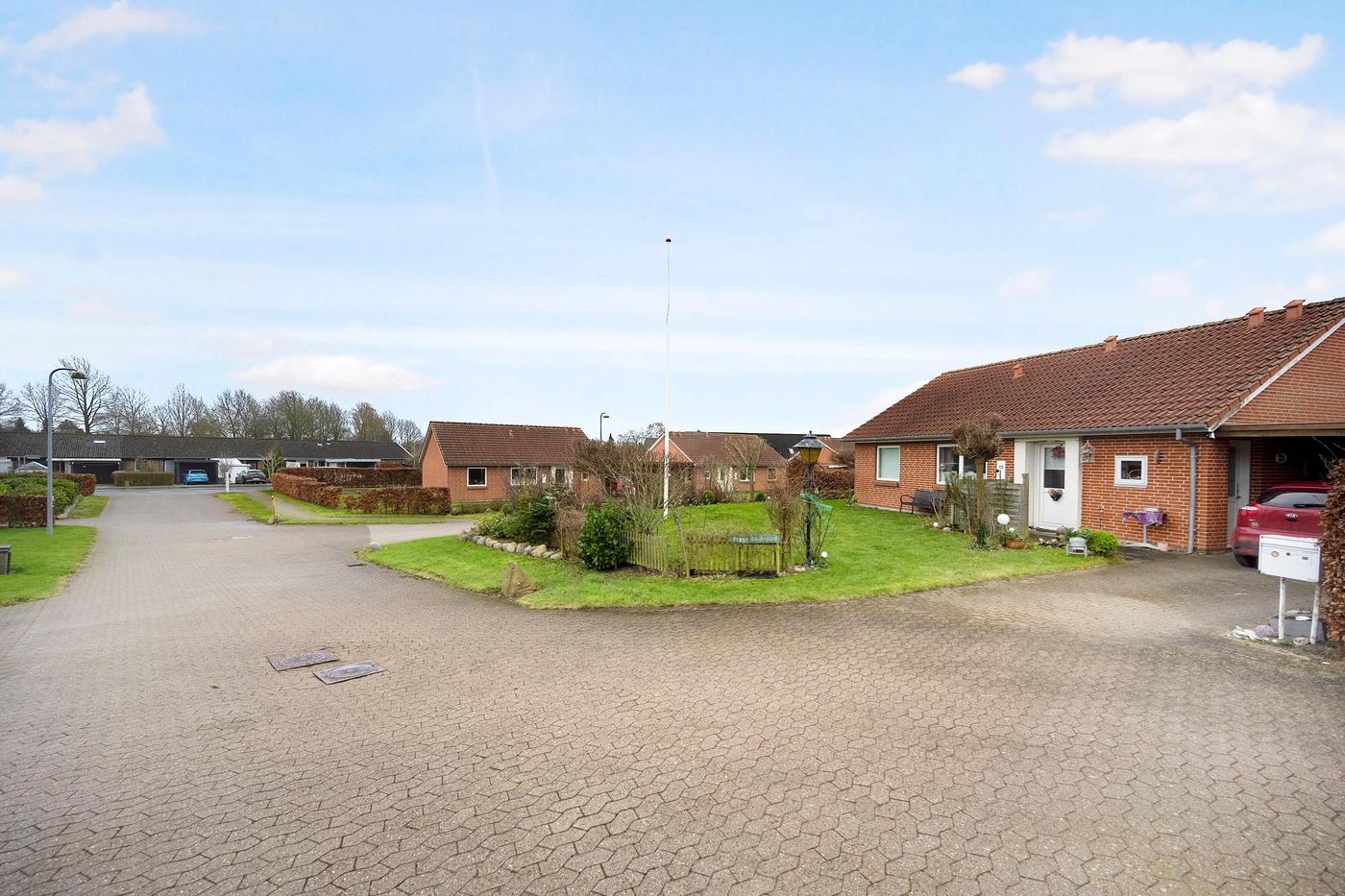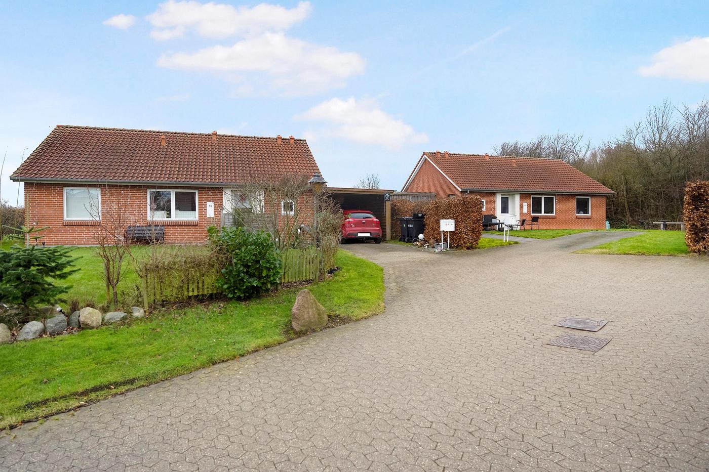 Alle boliger har egen indkørsel med plads til to mindre biler, derudover har alle boliger også egen fliseterrasse.