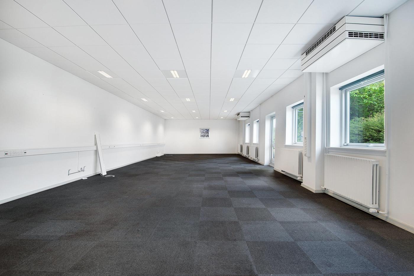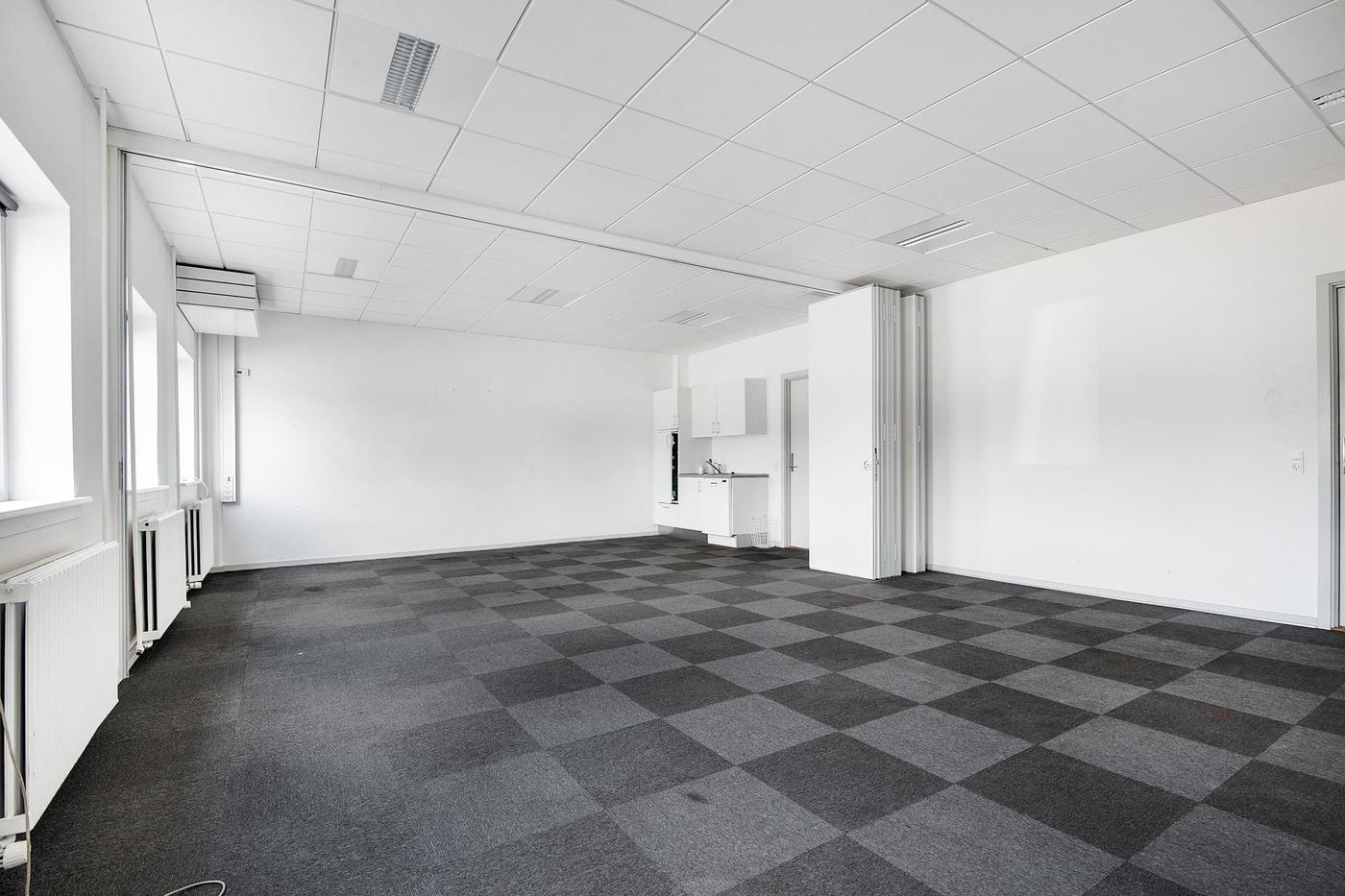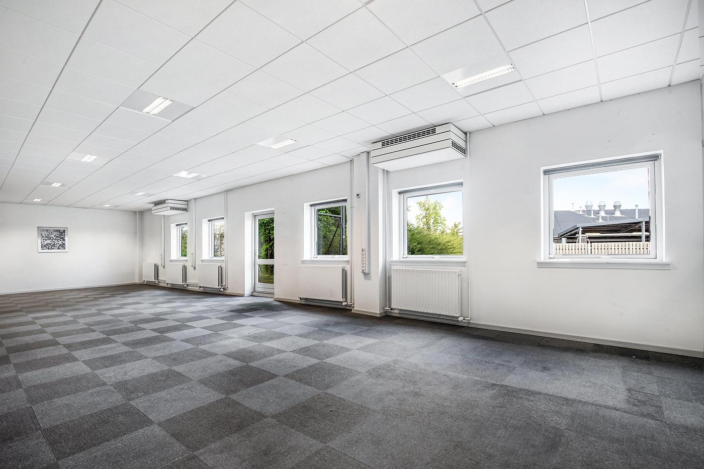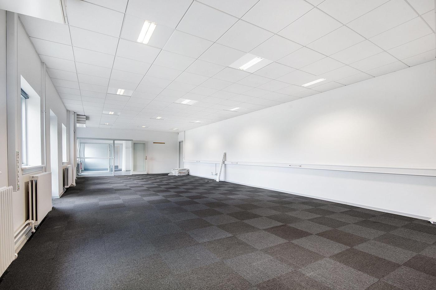 Lokalerne fremstår pæne og velvedligeholdte med tæppefliser og hvide systemlofter med indbygget grundbelysning.