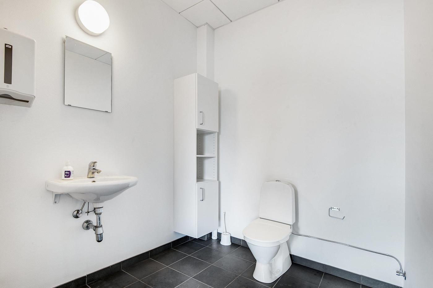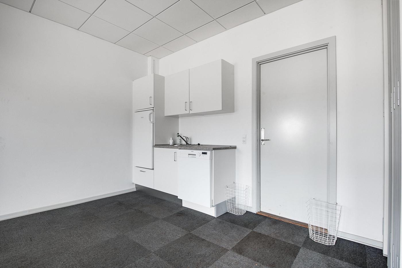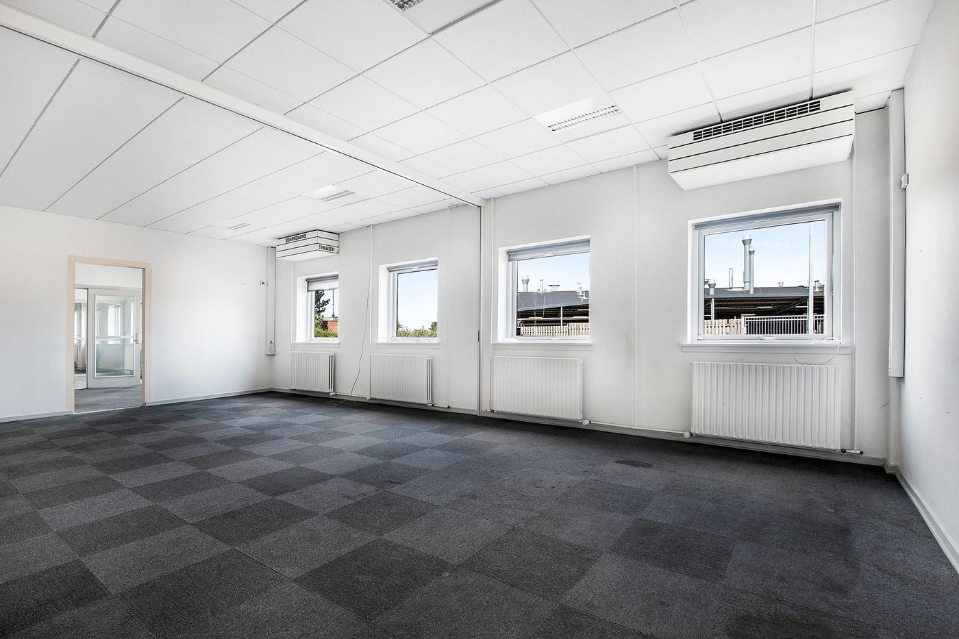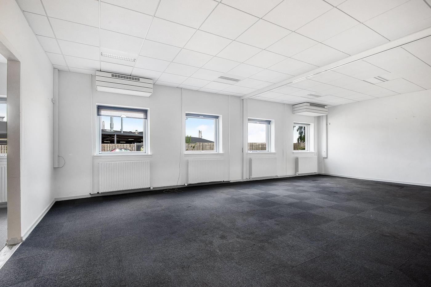 Lokalerne fremstår pæne og velvedligeholdte med tæppefliser og hvide systemlofter med indbygget grundbelysning.