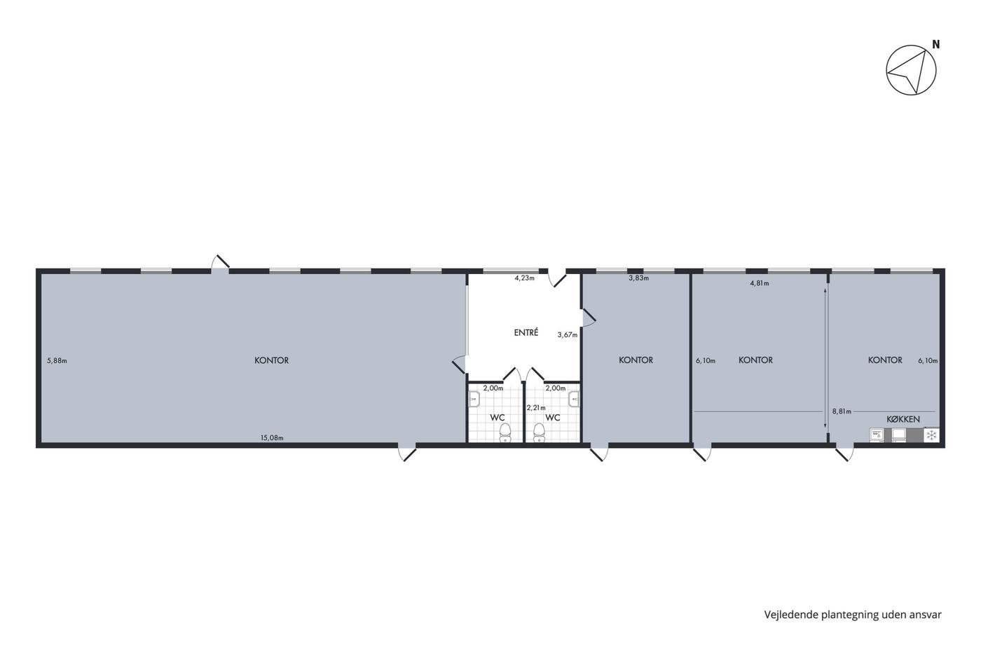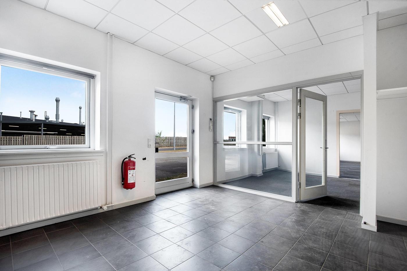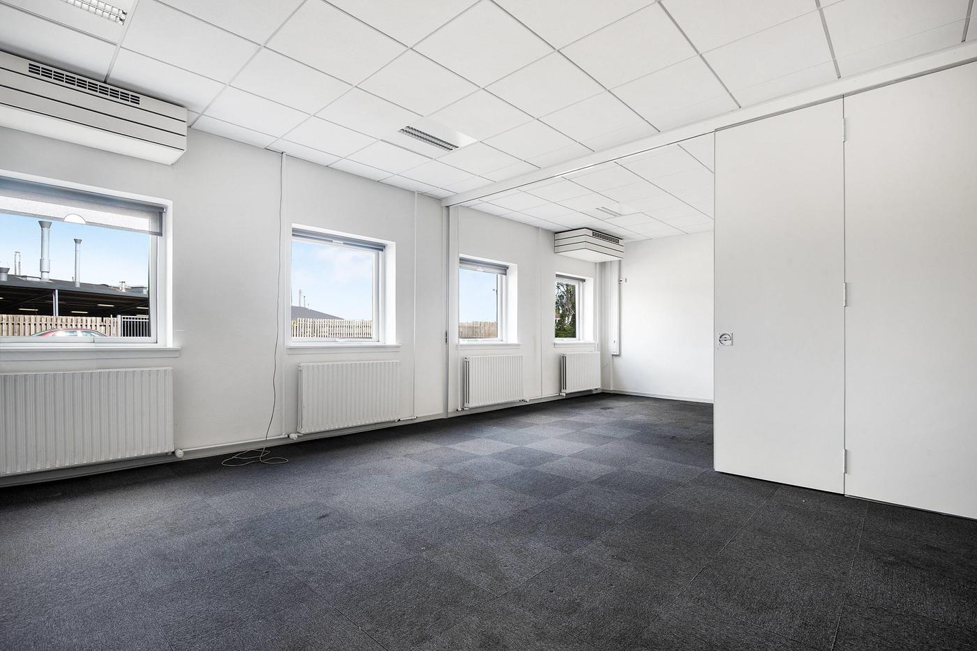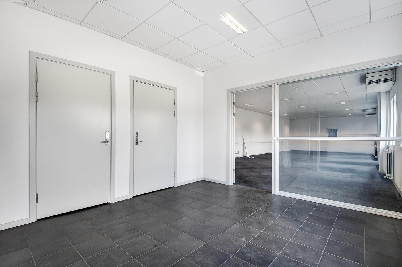 Lejemålet er indrettet med et modtagelsesområde/entré med to toiletter, et gennemgangskontor samt to store åbne kontorarealer, hvoraf det ene har tekøkken og kan opdeles med en foldedør.