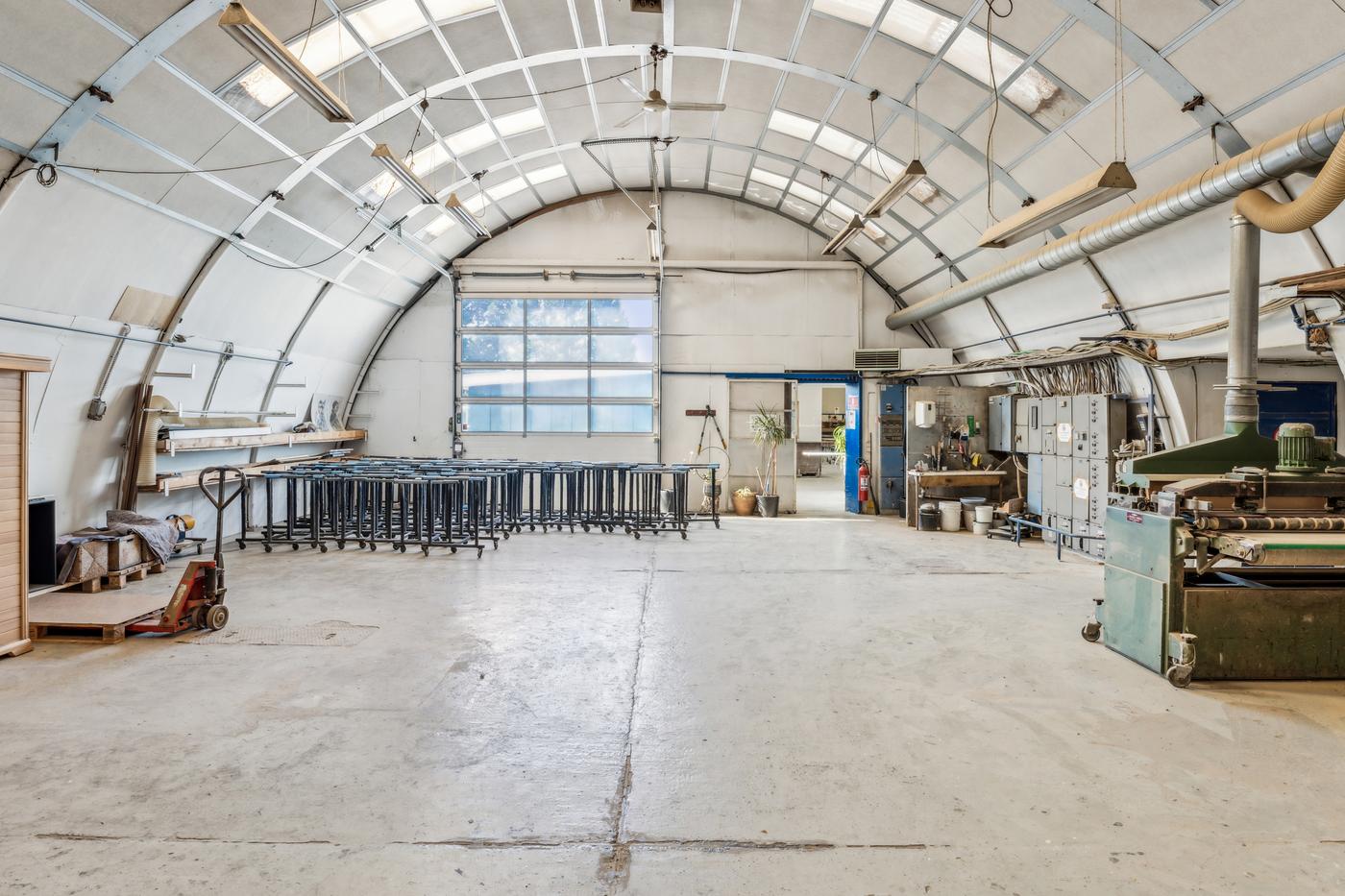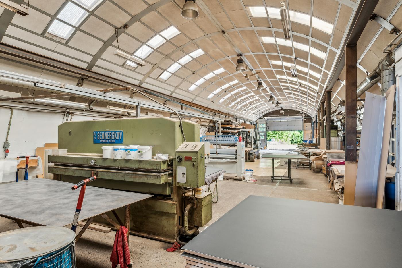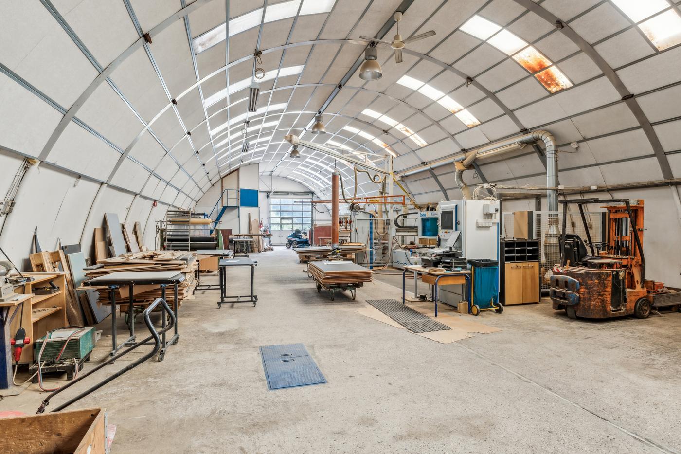 De 2 haller anvendes i dag til bearbejdning af træ og finér. Denne ene hal anvendes til produktion -hal 2 primært lager. Derudover separat malerkabine og transitområde.