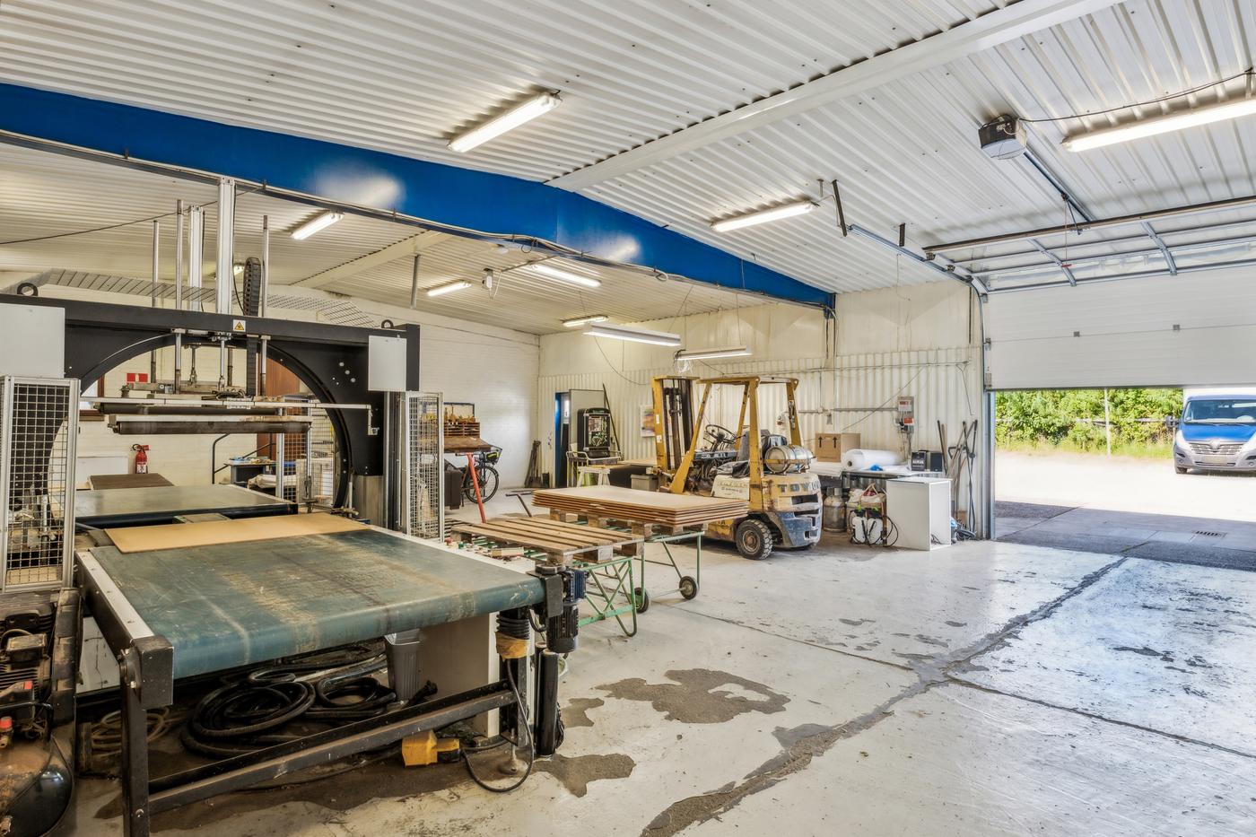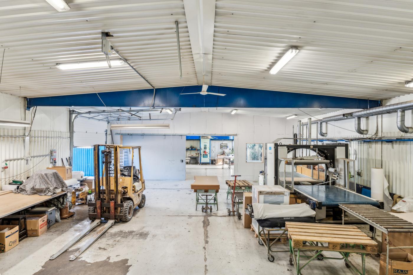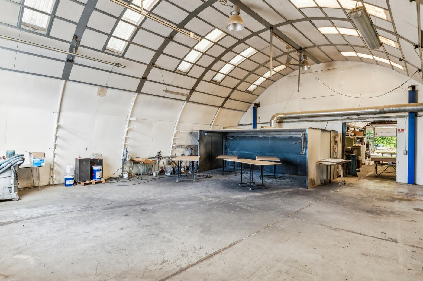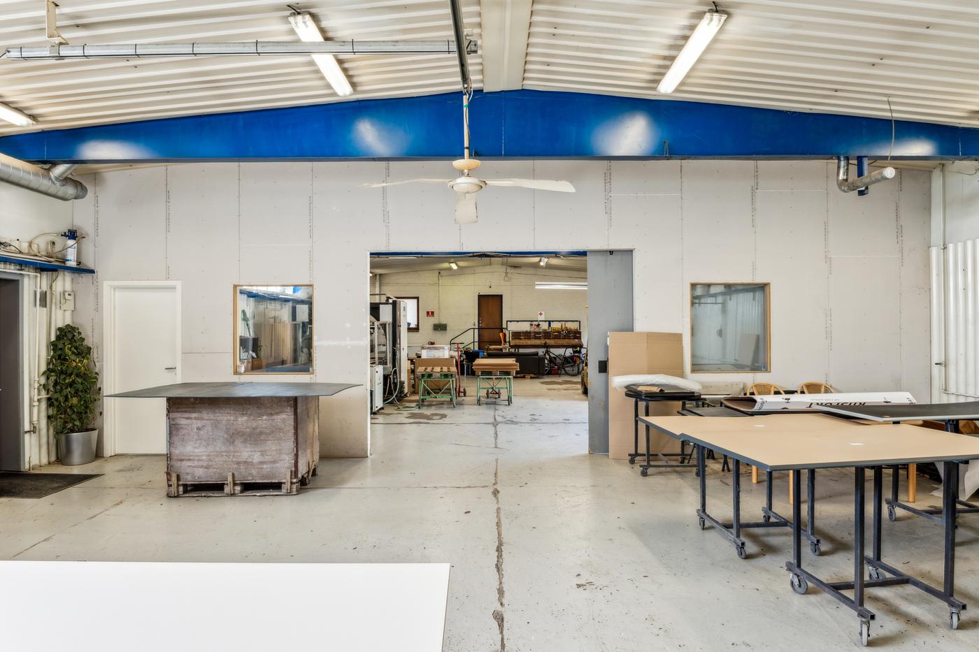 De 2 haller anvendes i dag til bearbejdning af træ og finér. Denne ene hal anvendes til produktion -hal 2 primært lager. Derudover separat malerkabine og transitområde.