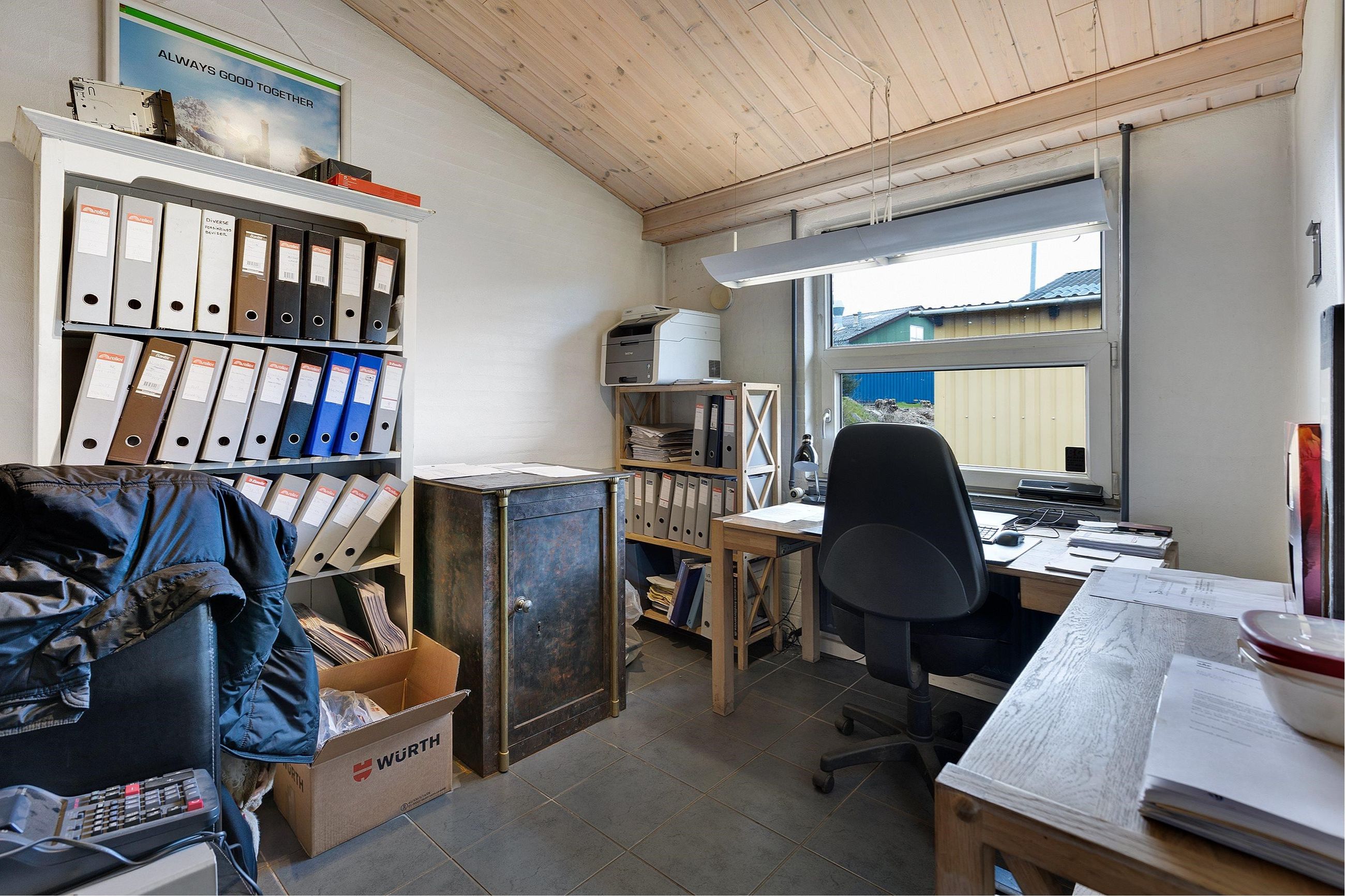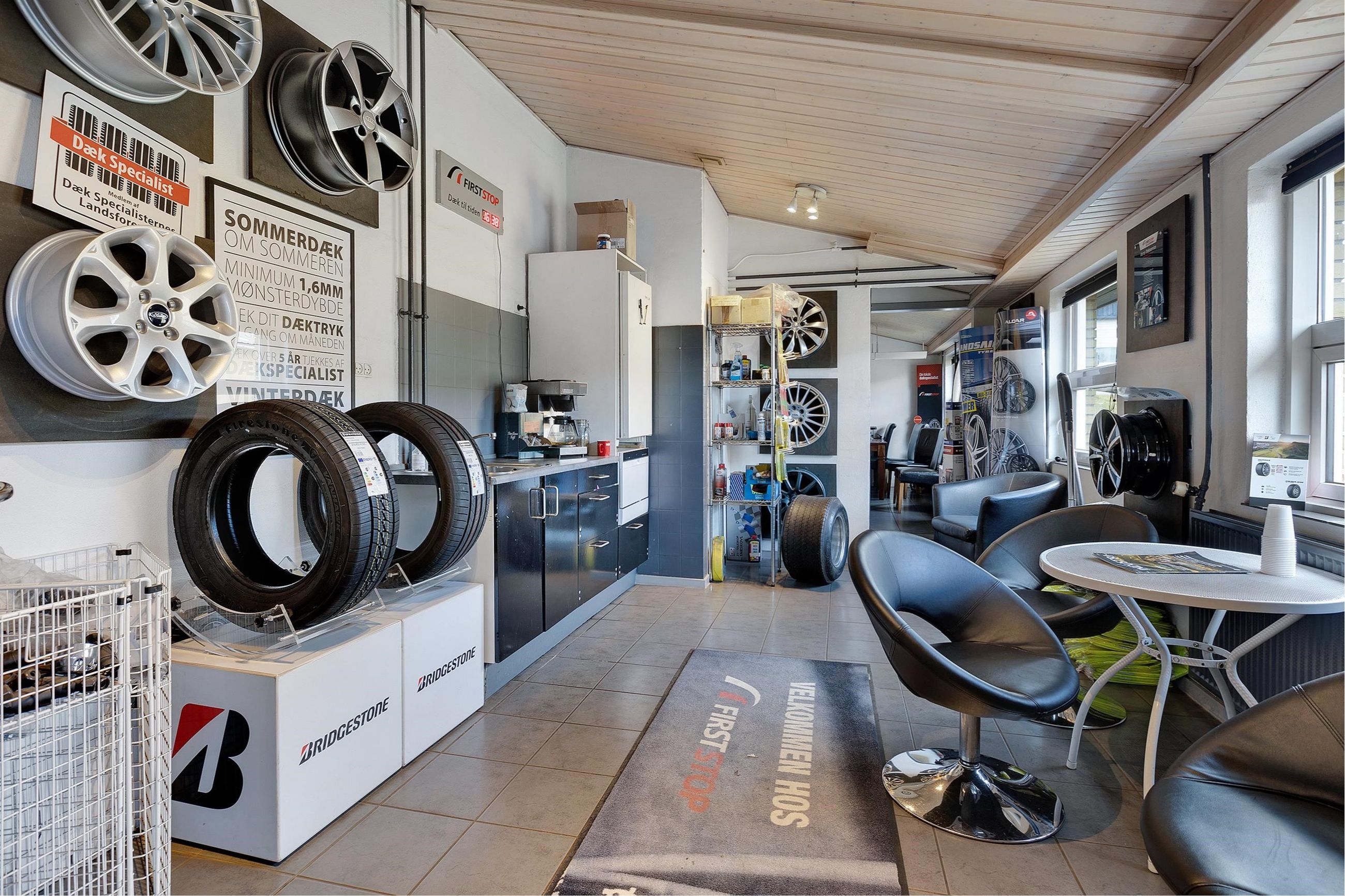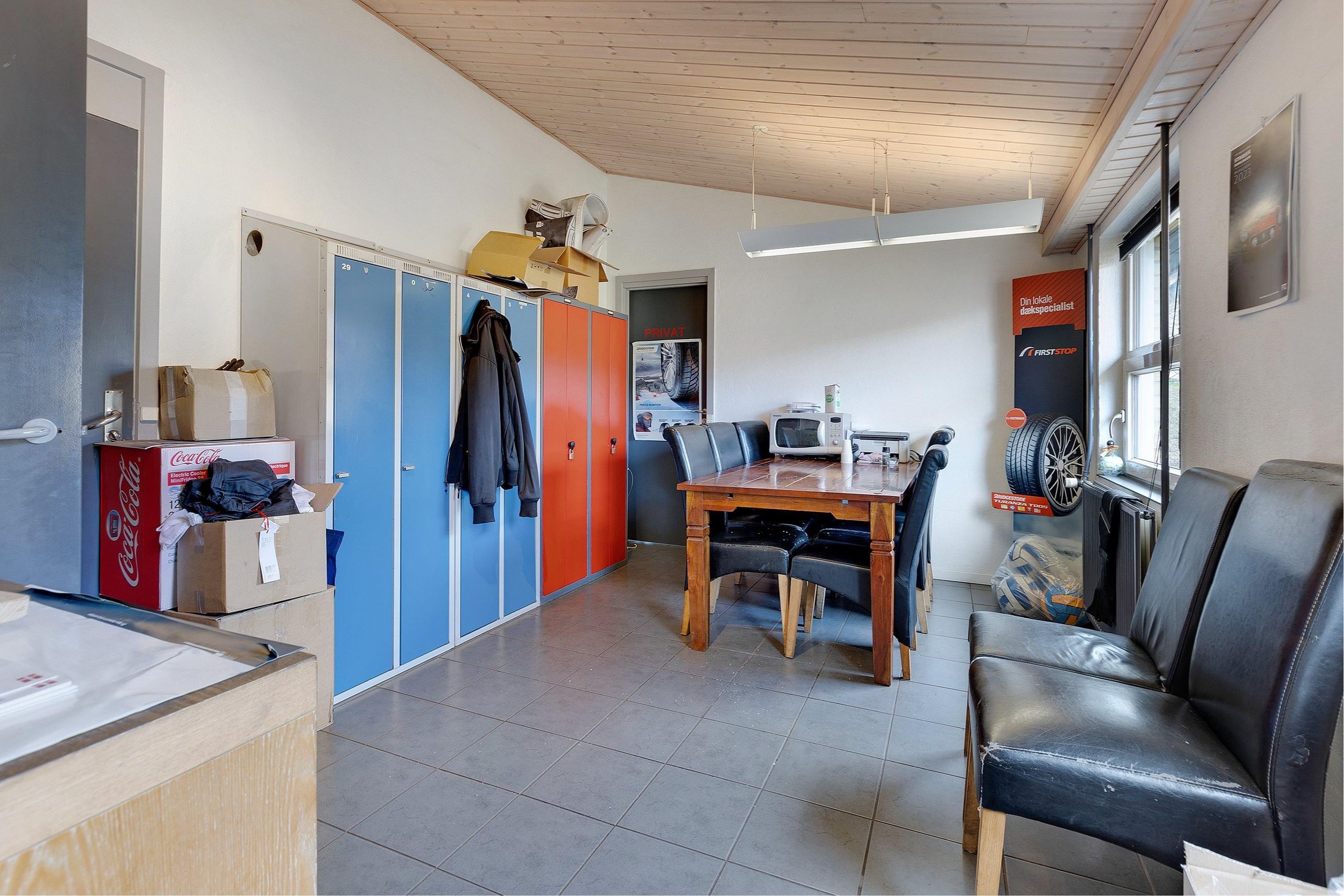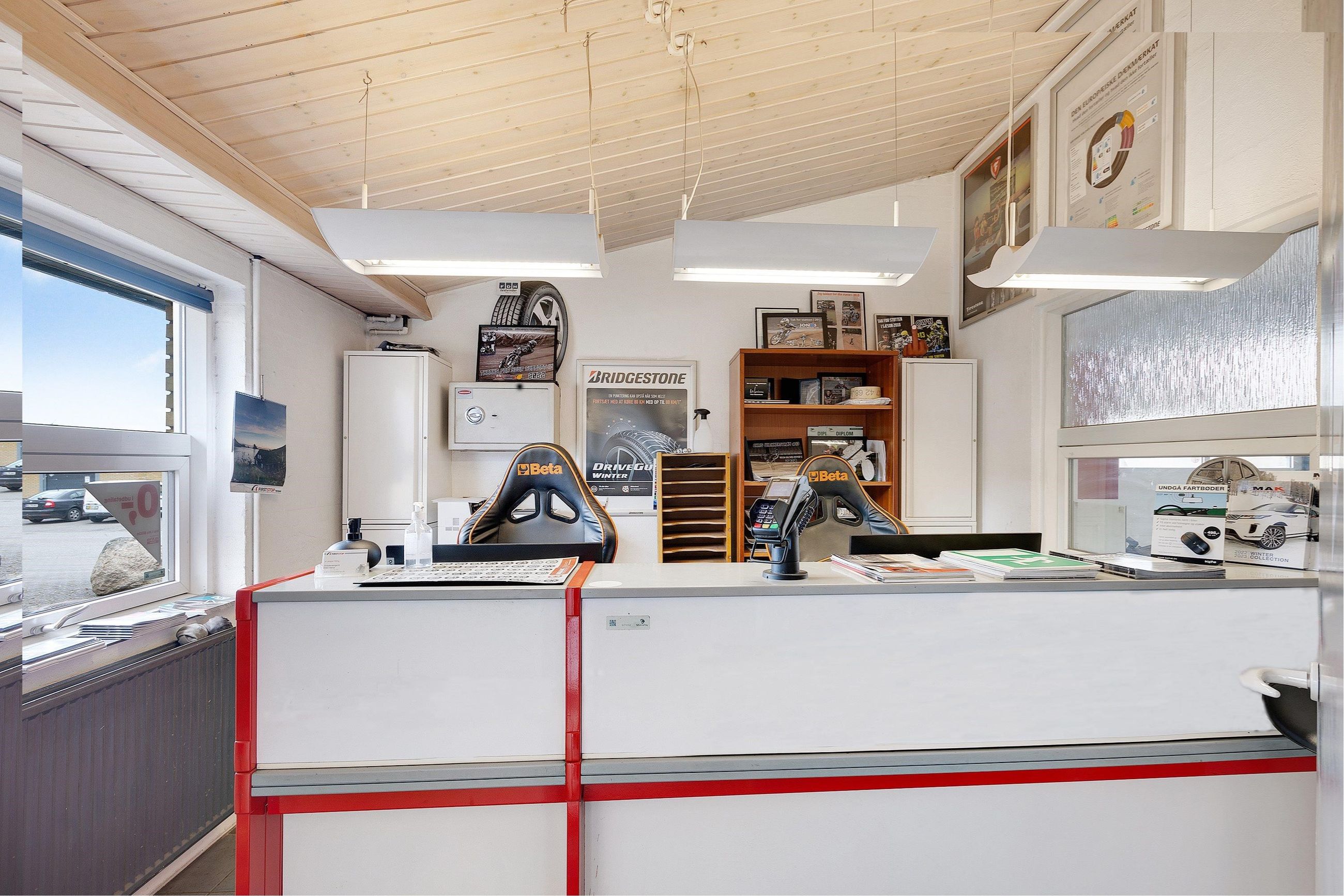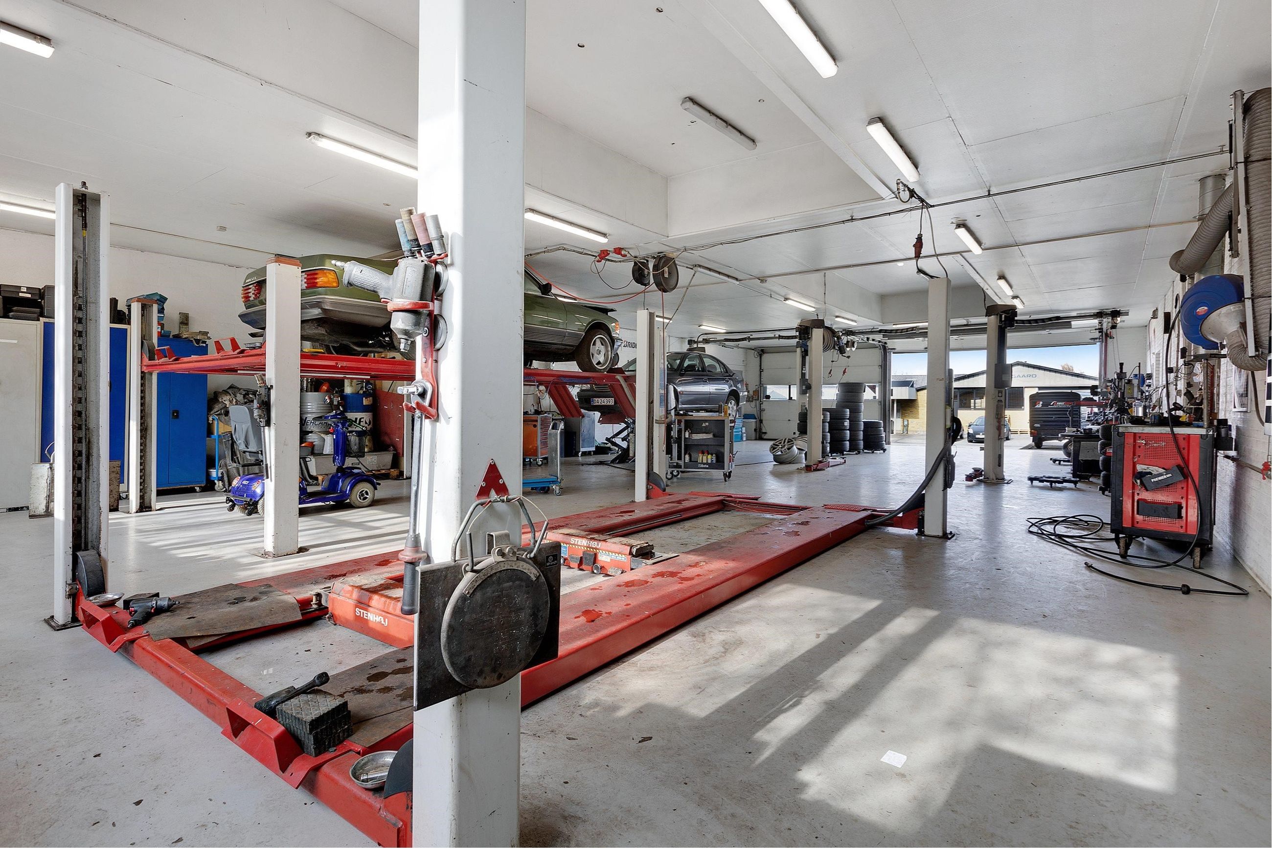 Indretningen er ideel til fortsat anvendelse som autoværksted med mindre kontor, venteværelse/mindre showroom samt værksted med 2 porte.