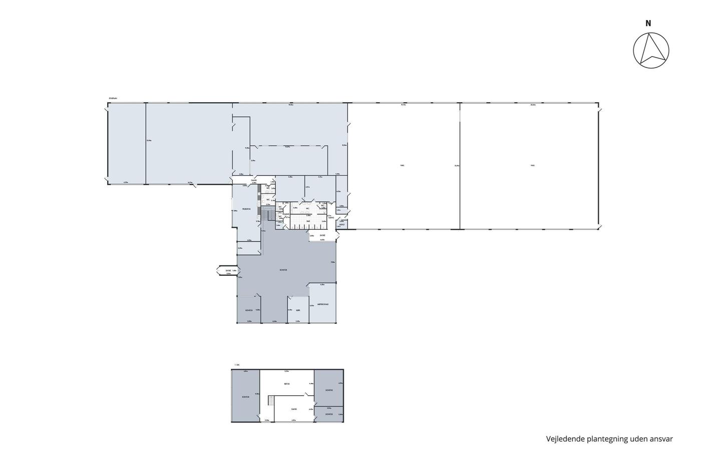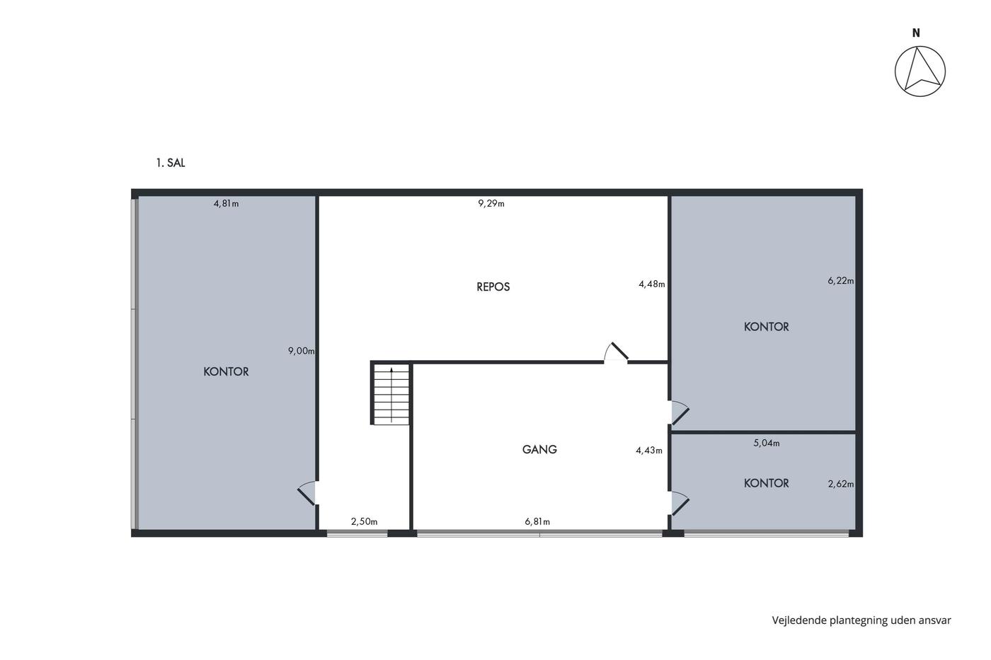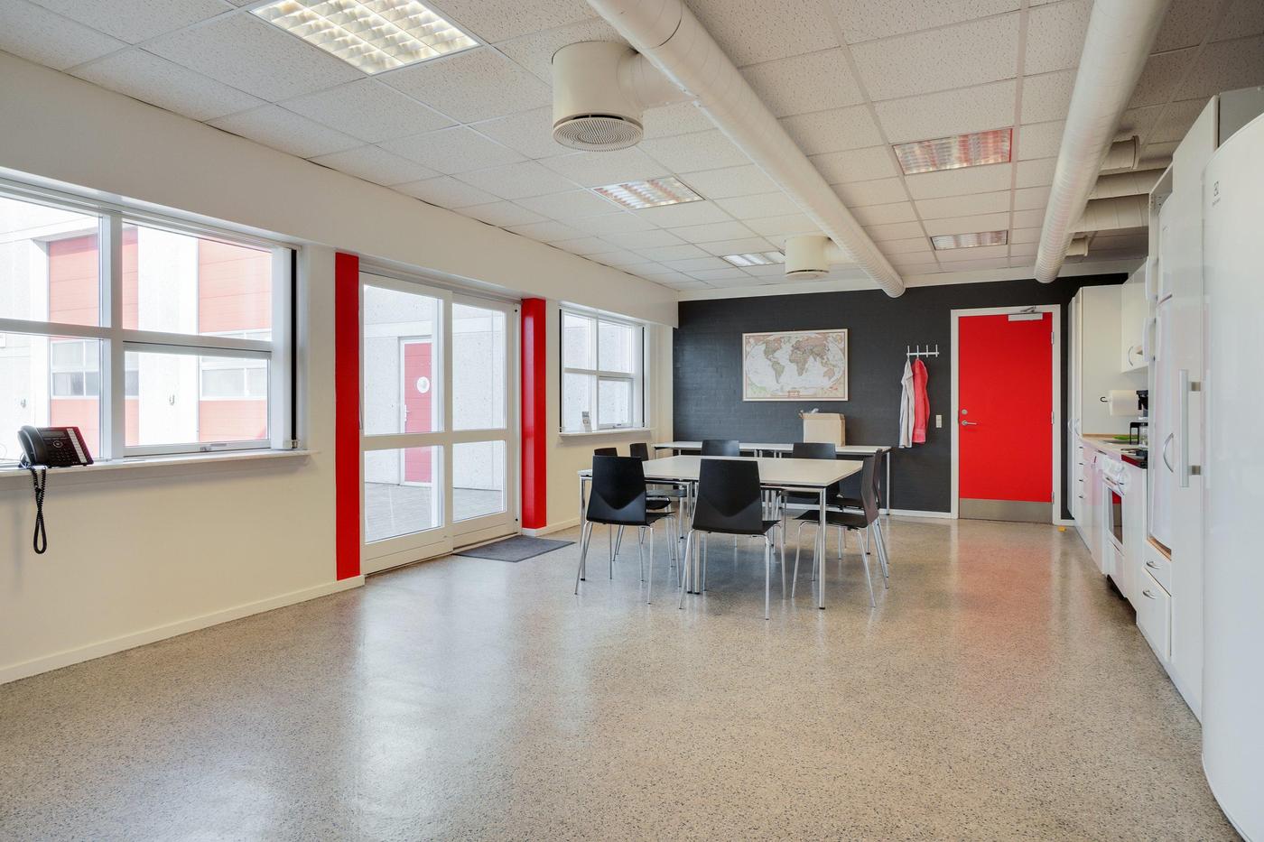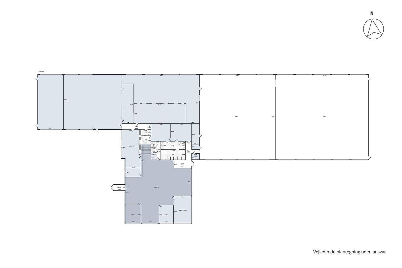 Kontorerne andrager ca. 500 m² fordelt med velfærdsområder som spisestue, køkken, gode bade- og omklædningsmuligheder, storrumskontorer, cellekontorer/mødelokaler mv.