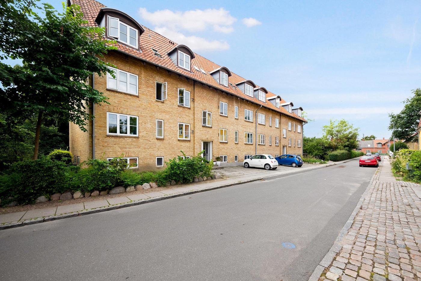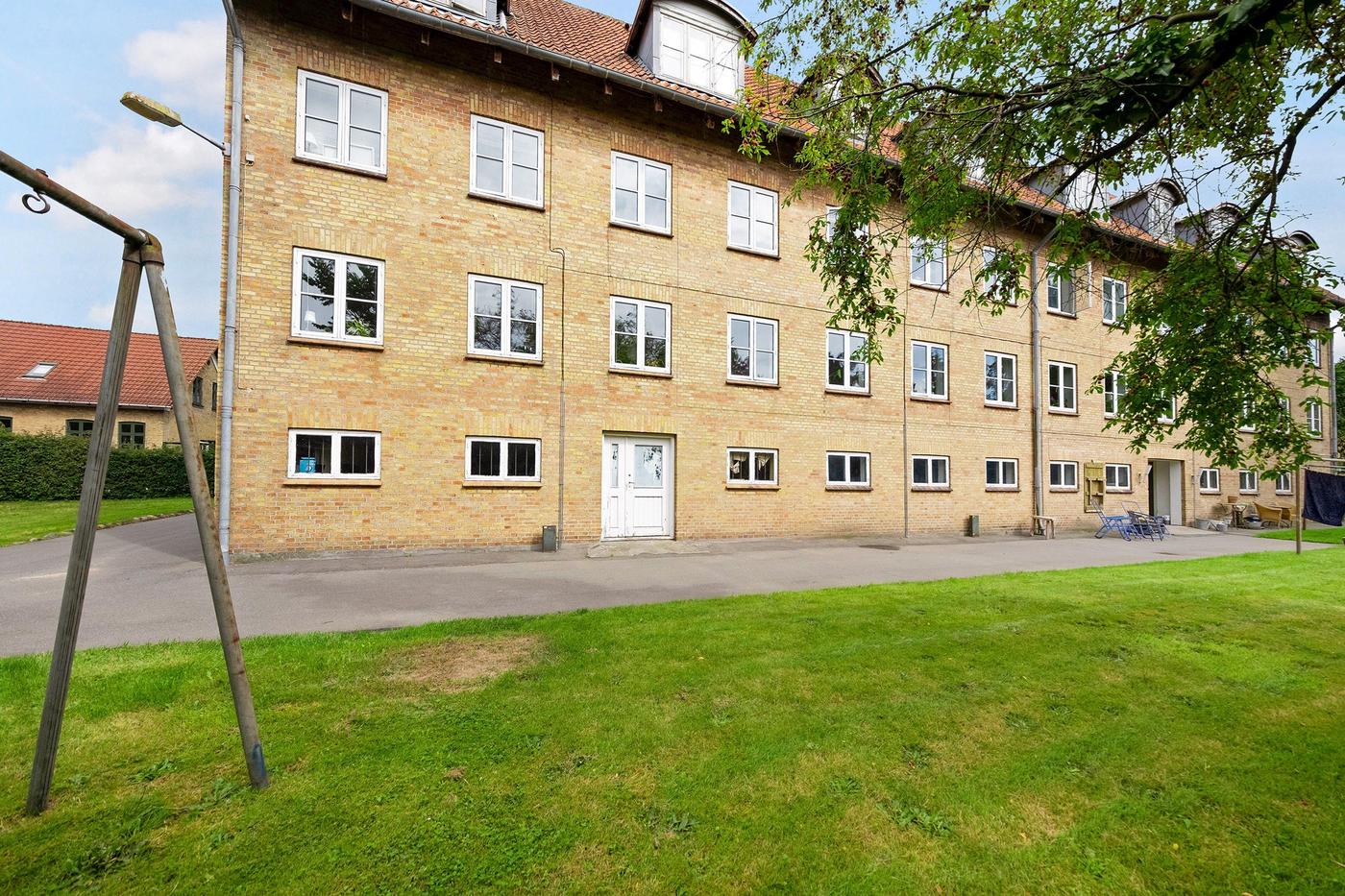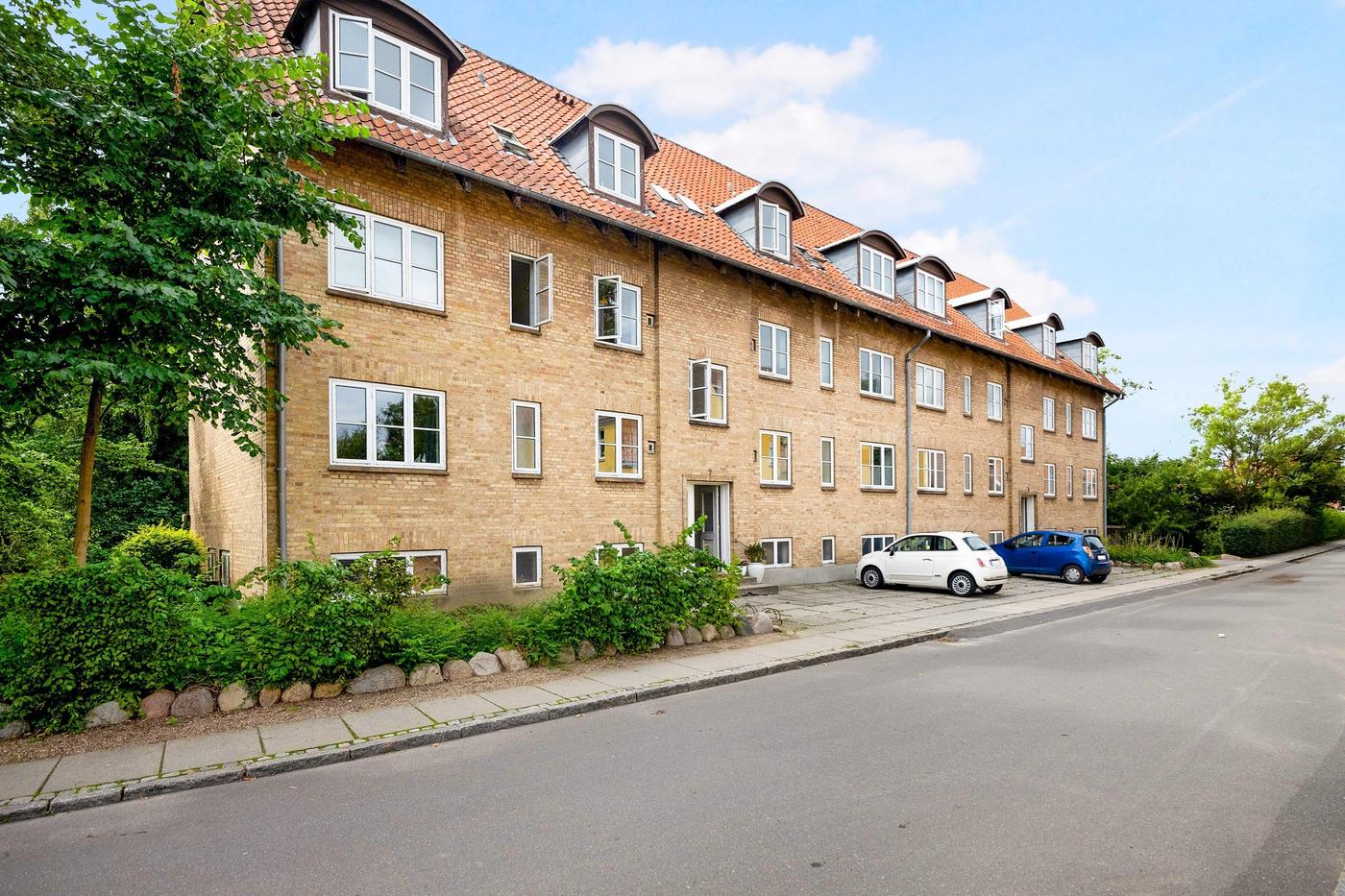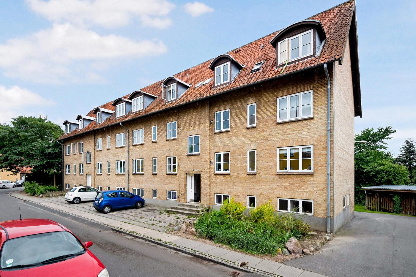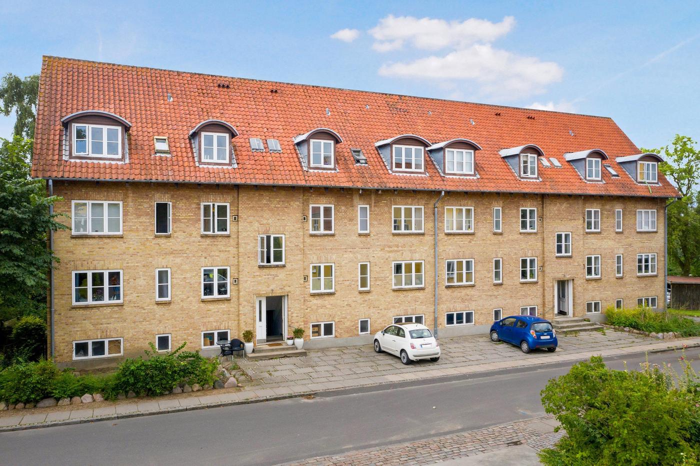 Flot boligudlejningsejendom i gule sten med sadeltag belagt med rødt tegl. Der er i alt 11 lejemål i ejendommen og boligerne varierer fra 69 m² til 81 m², dog med et enkelt lejemål på 100 m².