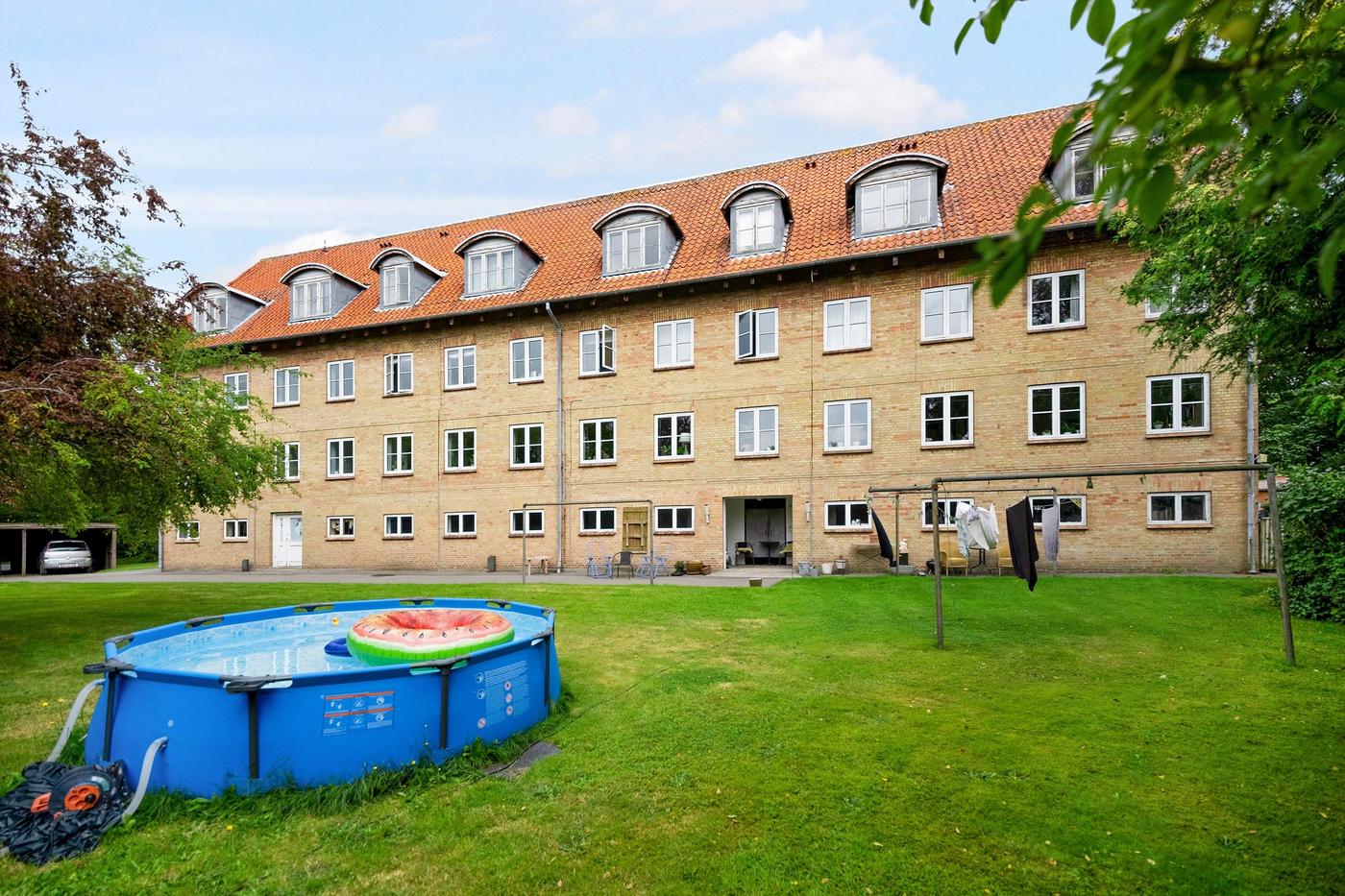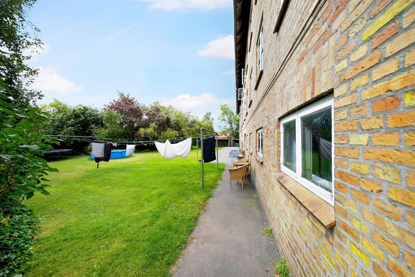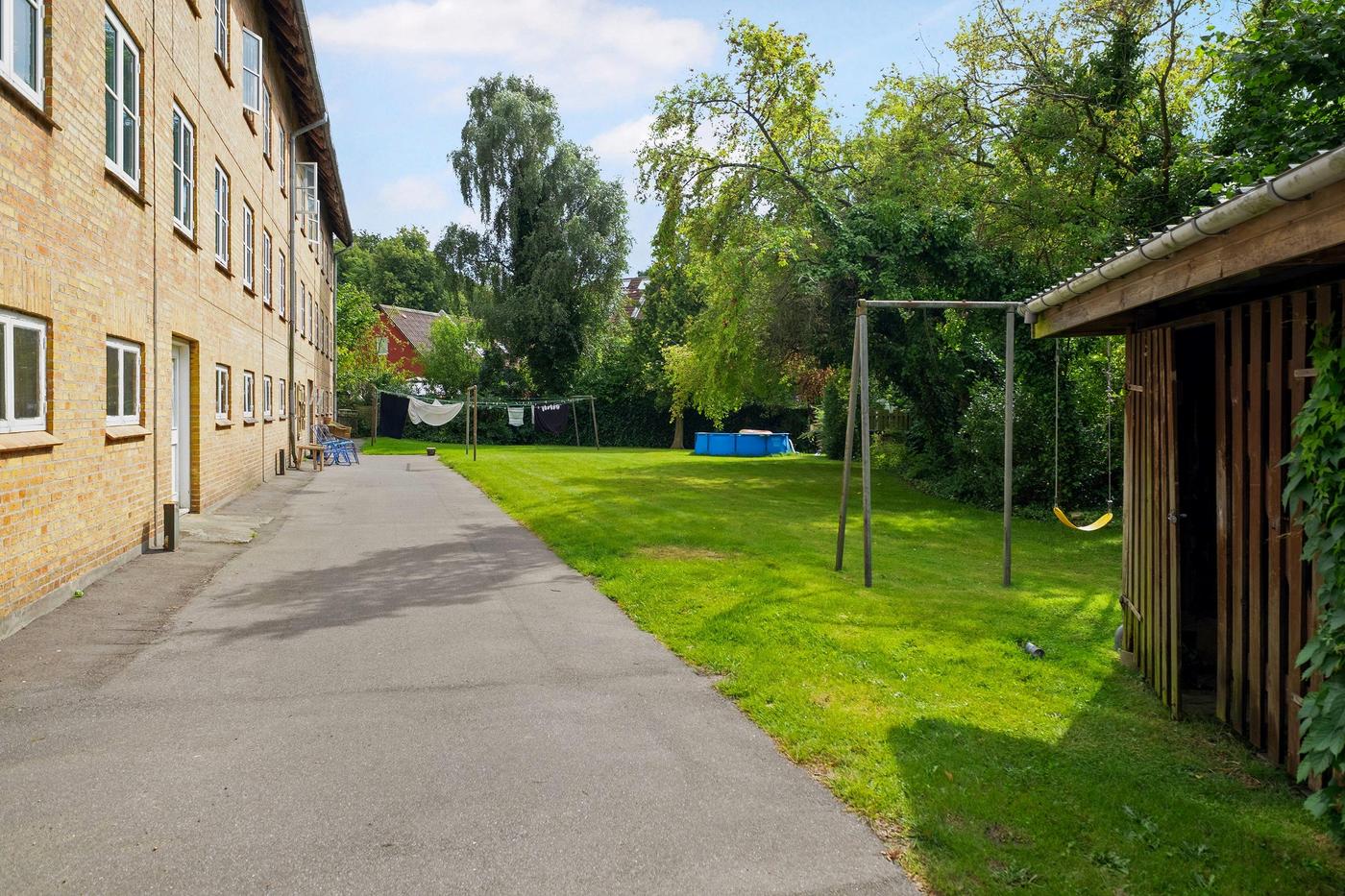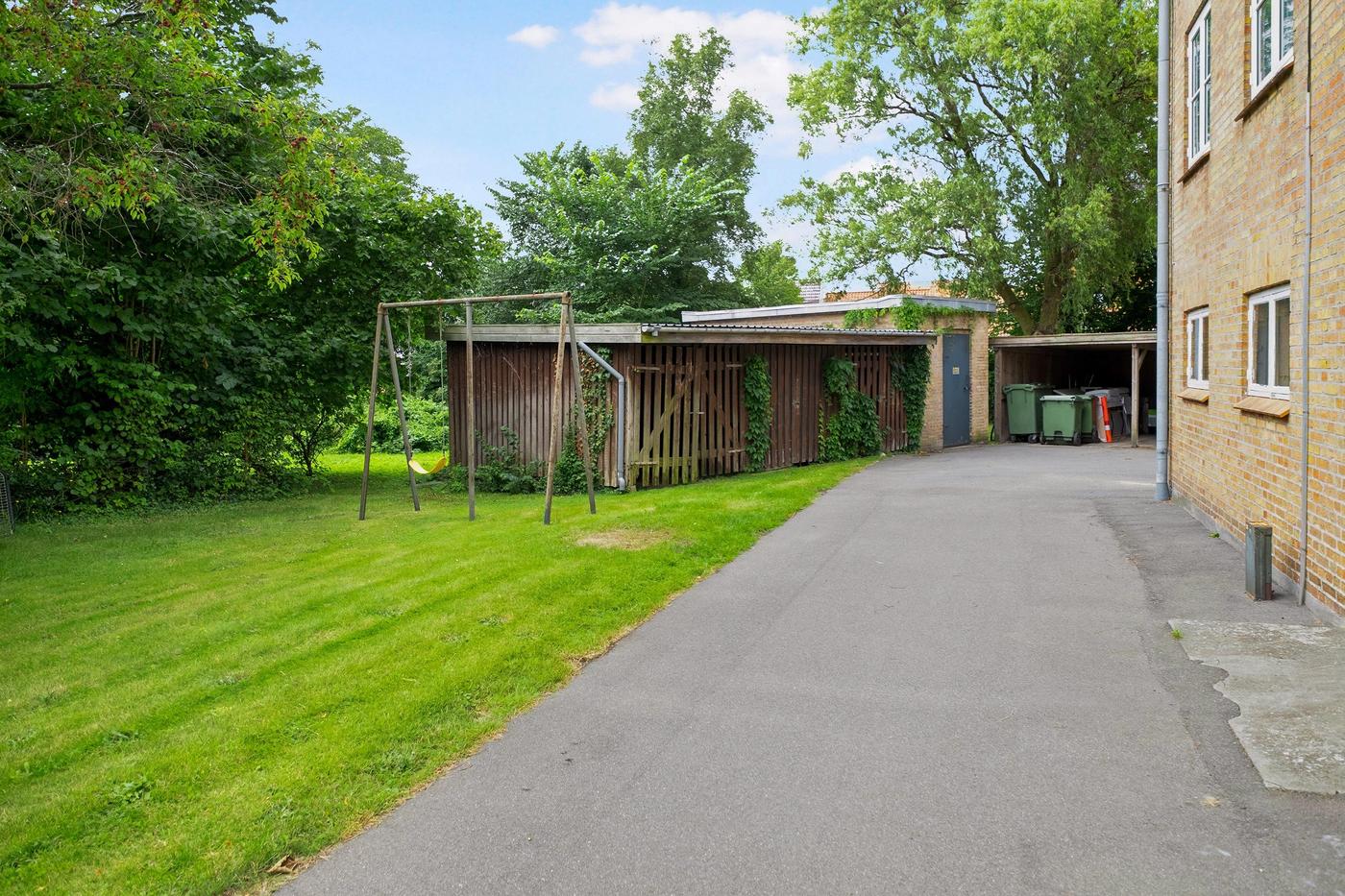 Der er fælles haveanlæg , fælles vaskeri i kælderen og egen parkering.