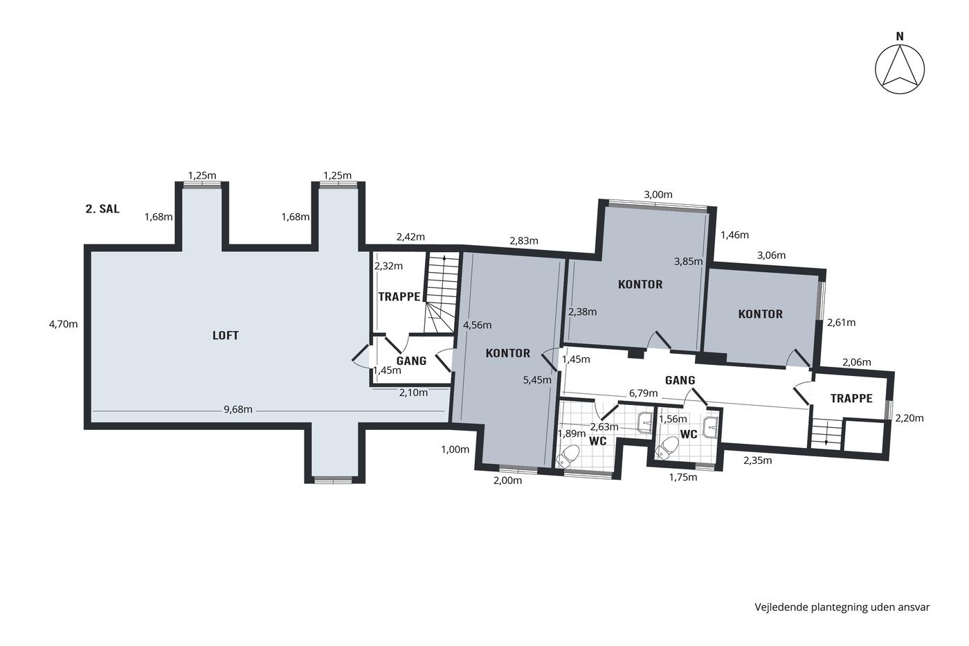 Lejemålet som ligger på 2 sal er indrettet til pæne lyse kontor lokaler. Gulvene er med linoleum.