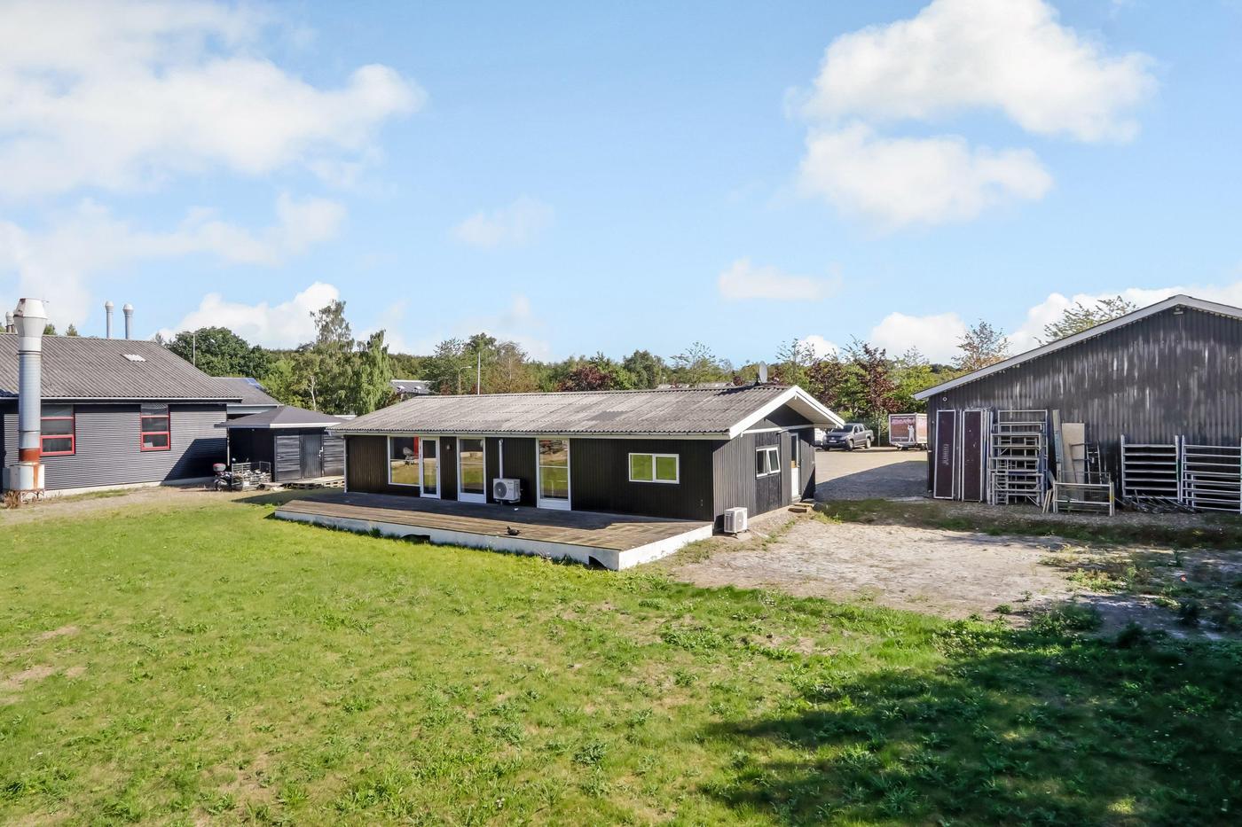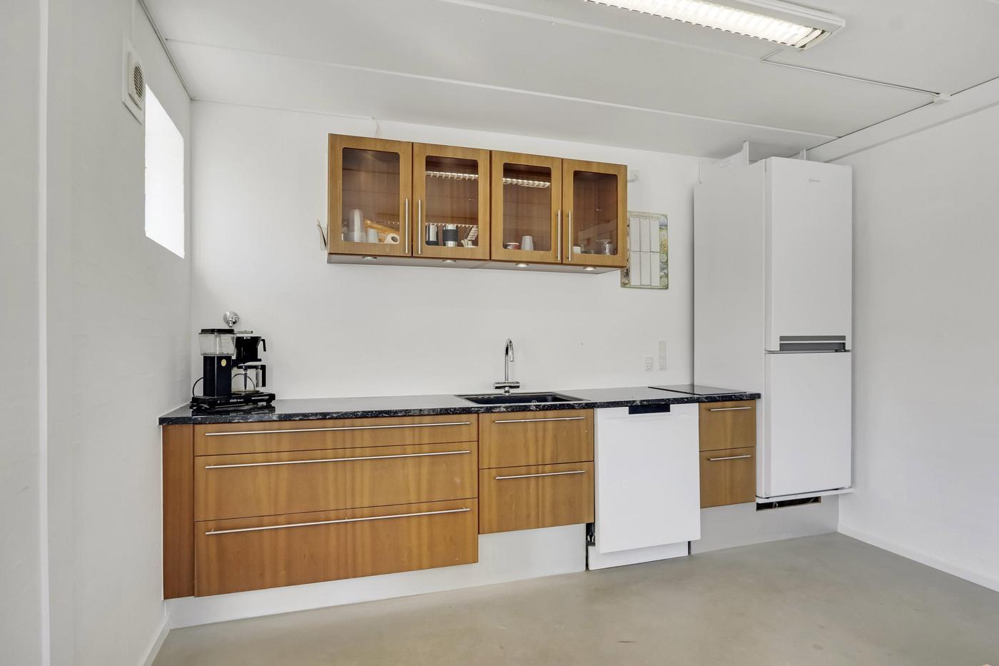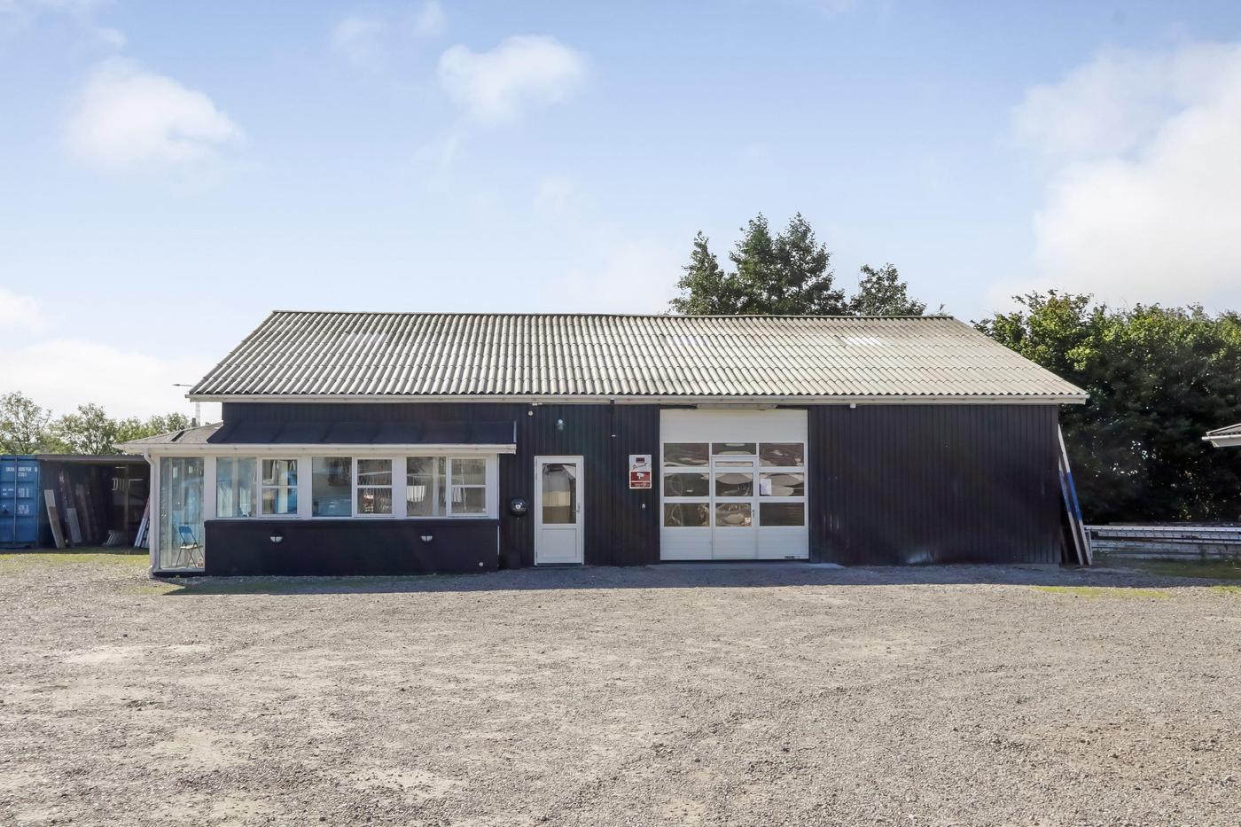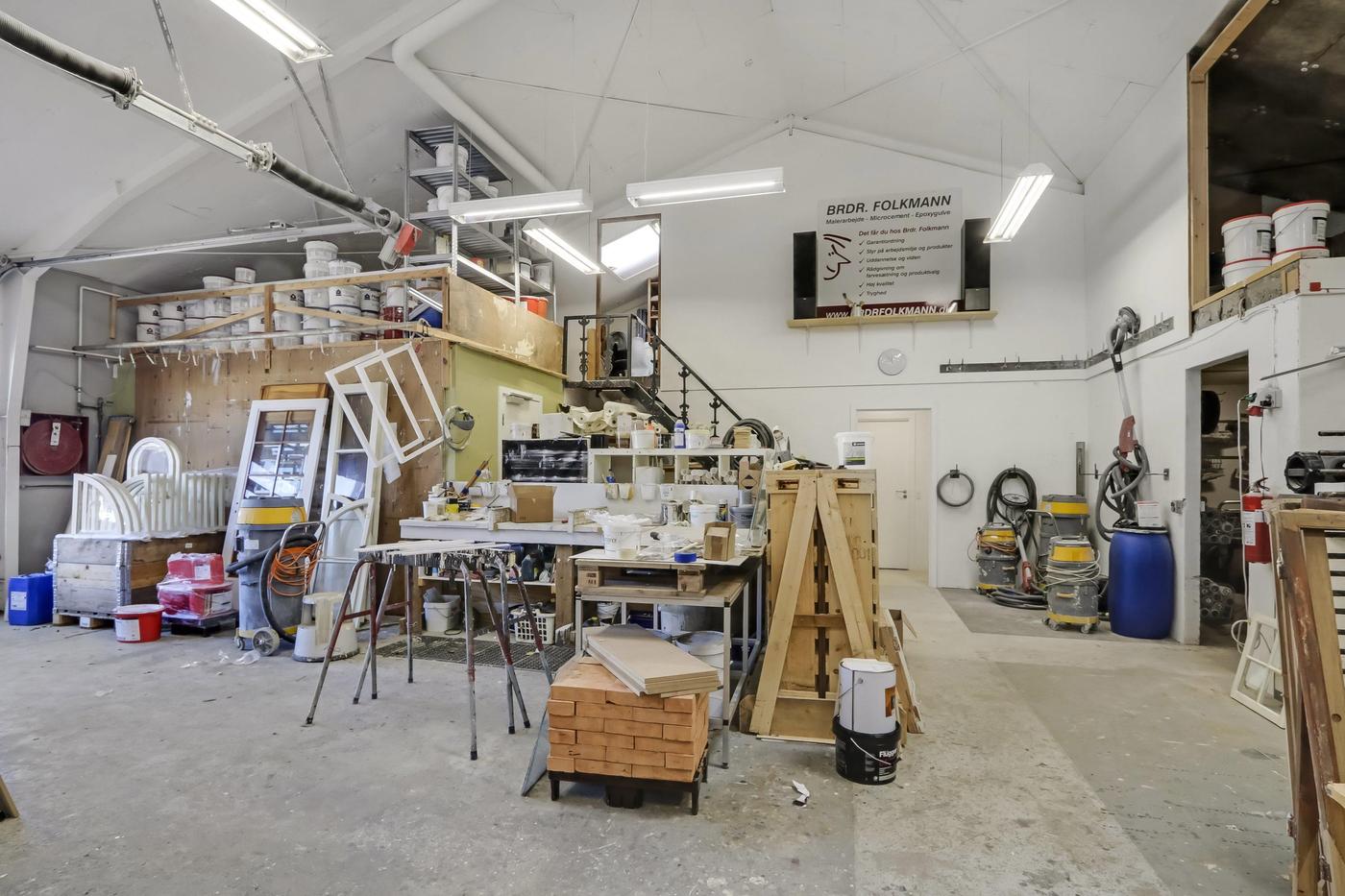 Ejendommen består af 2 bygninger. Værkstedsbygningen er indrettet med stort isoleret og opvarmet værksteds-/lagerlokale med elektrisk aluhejseport på ca. 3 x 3,5 meter. Der er en frihøjde i siderne på ca. 4 meter og ca. 6 meter til kip. Hallen er fortrinsvist beklædt med stålplader, men en del af bygningen er opført i mursten. I denne del er der indrettet stor lys frokoststue, entre, toilet, separat bad samt lagerfaciliteter. Over denne del af bygningen er der etableret en indskudt etage, der anvendes til lagerformål.